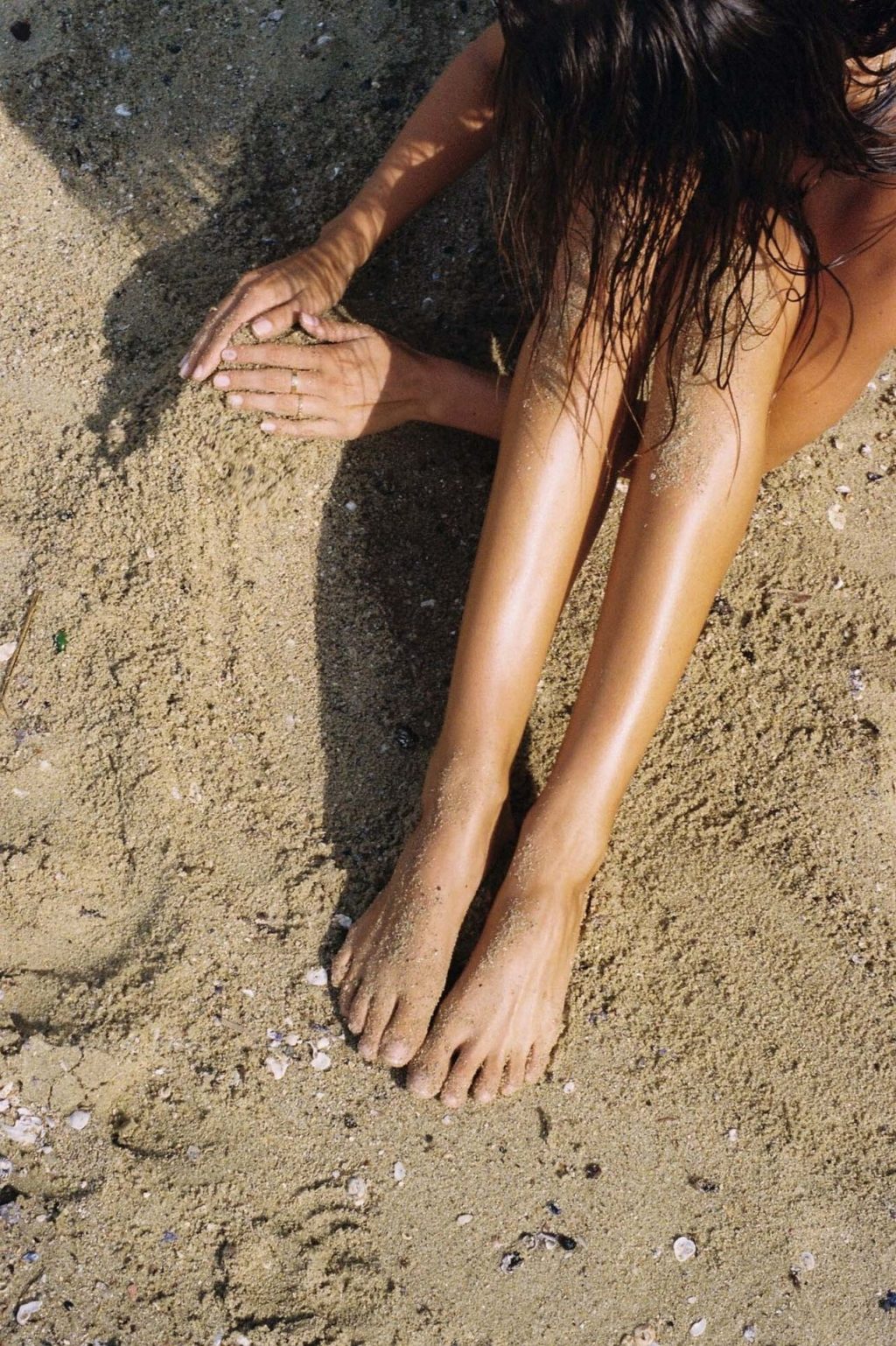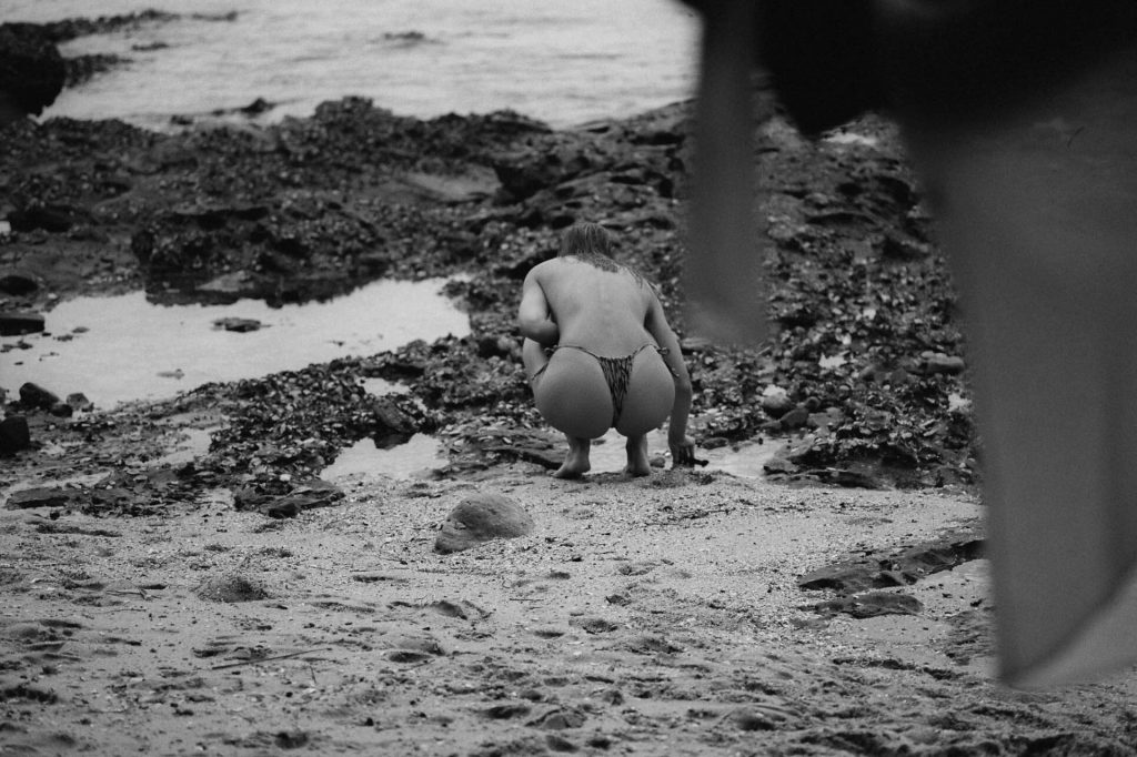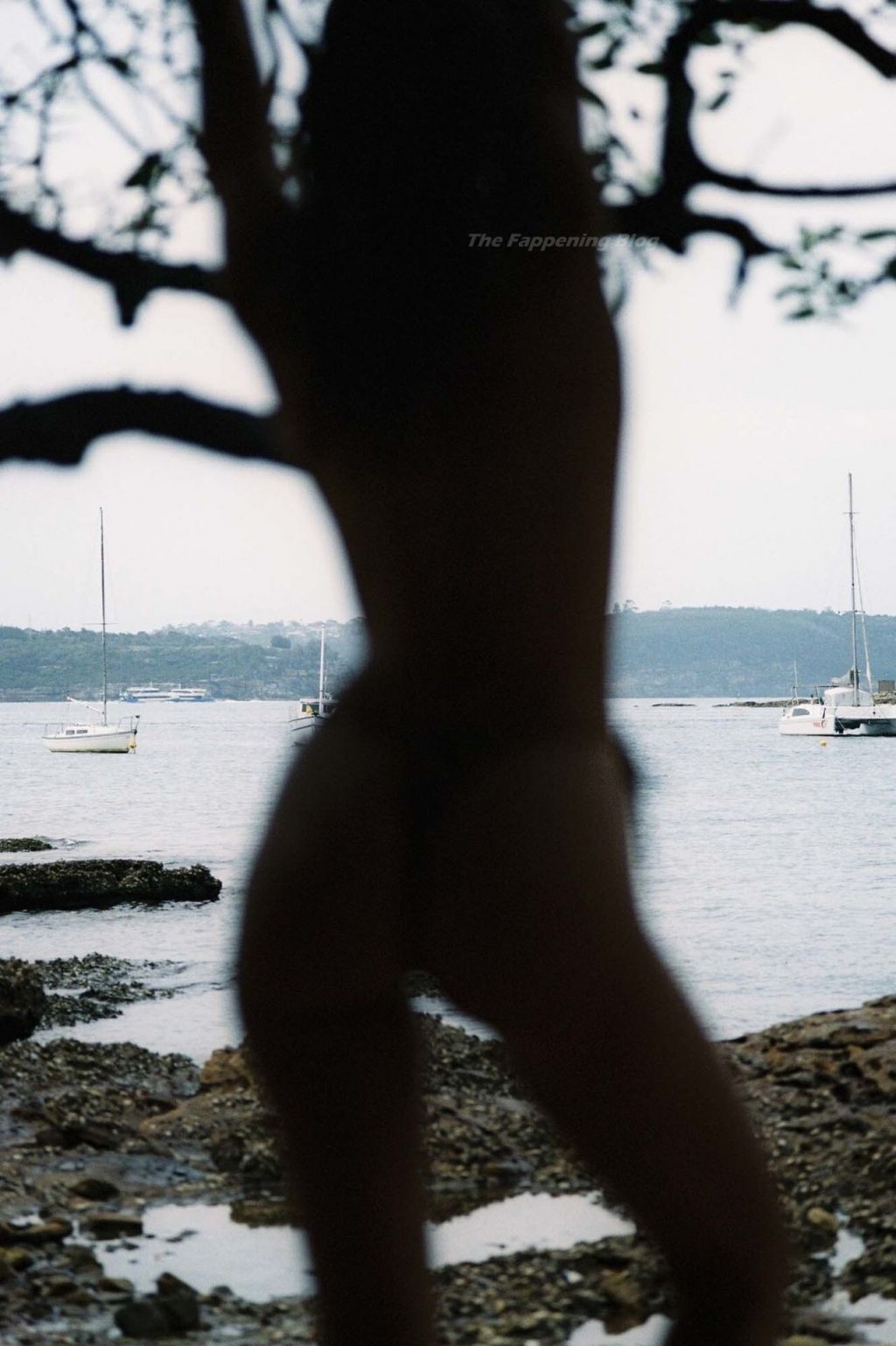 La modella Kristina Mendonca posa topless e mostra il suo minuscolo bikini sulla spiaggia di Sydney, Australia, in un servizio fotografico di Jonny Seelenmeyer (2020).