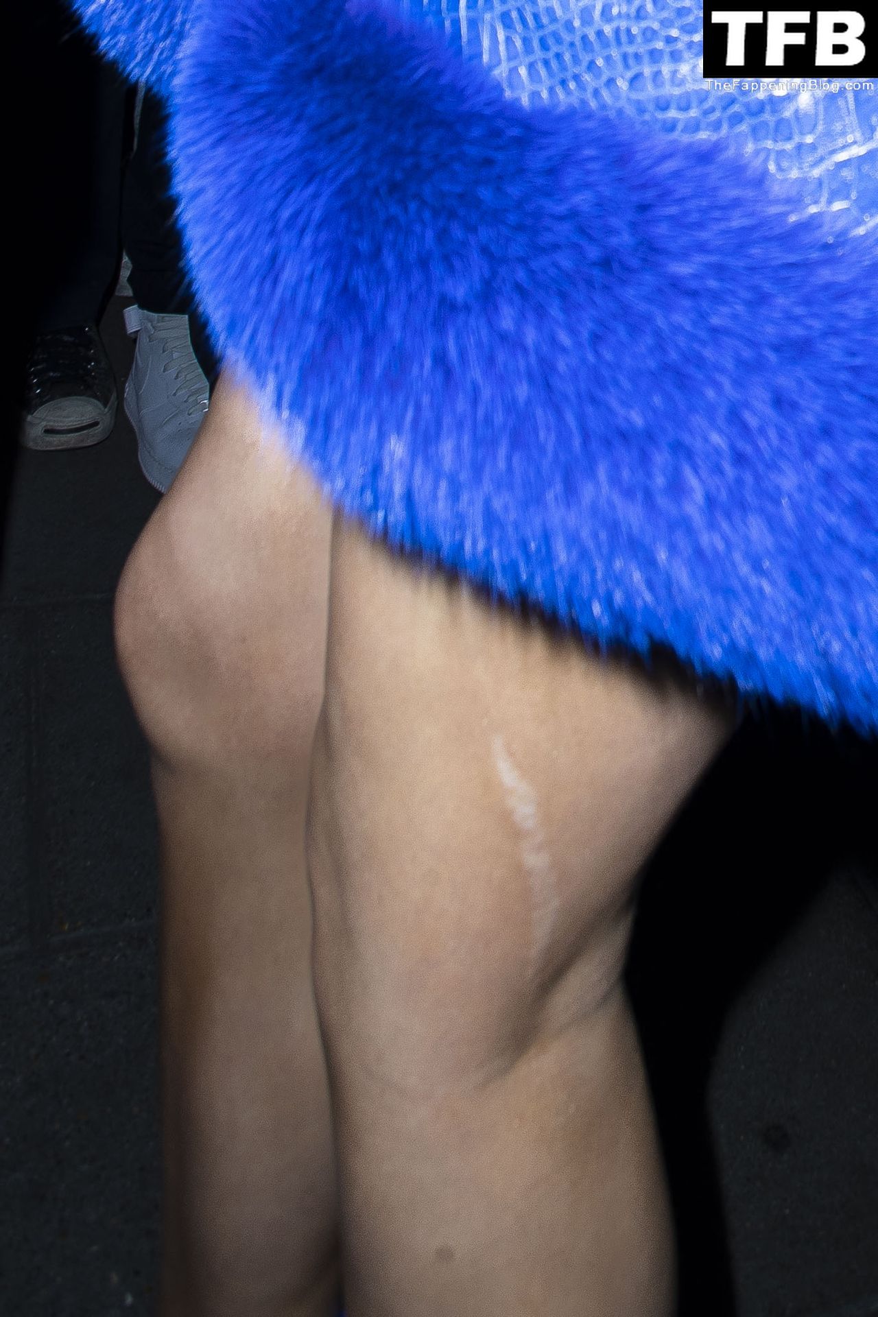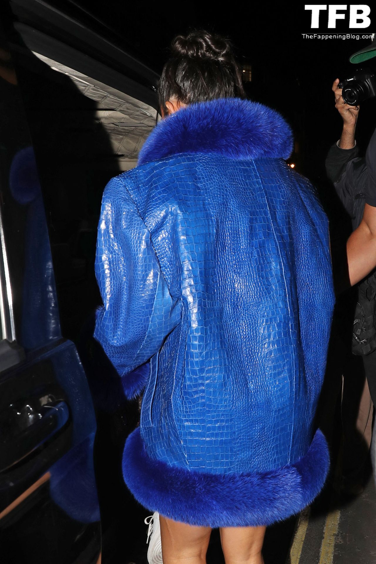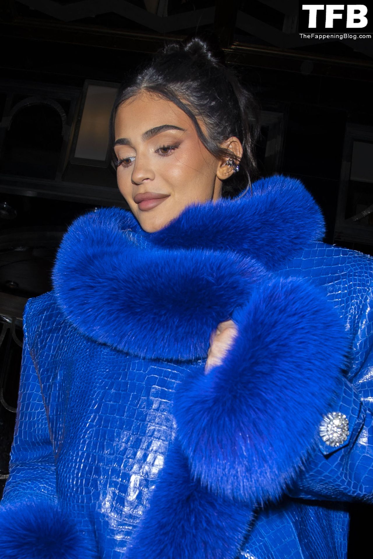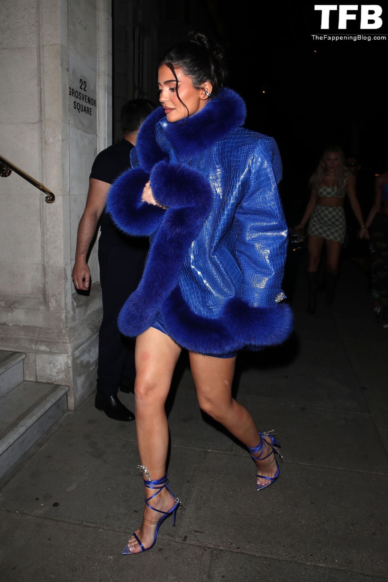 La star della TV reality e imprenditrice Kylie Jenner indossa un serio cappotto di pelliccia blu per una serata in città a Londra, 08/05/2022.