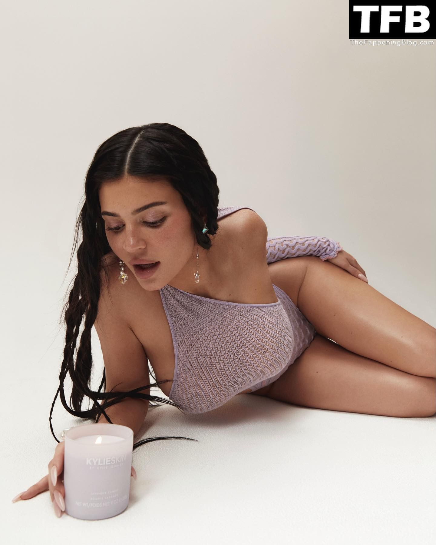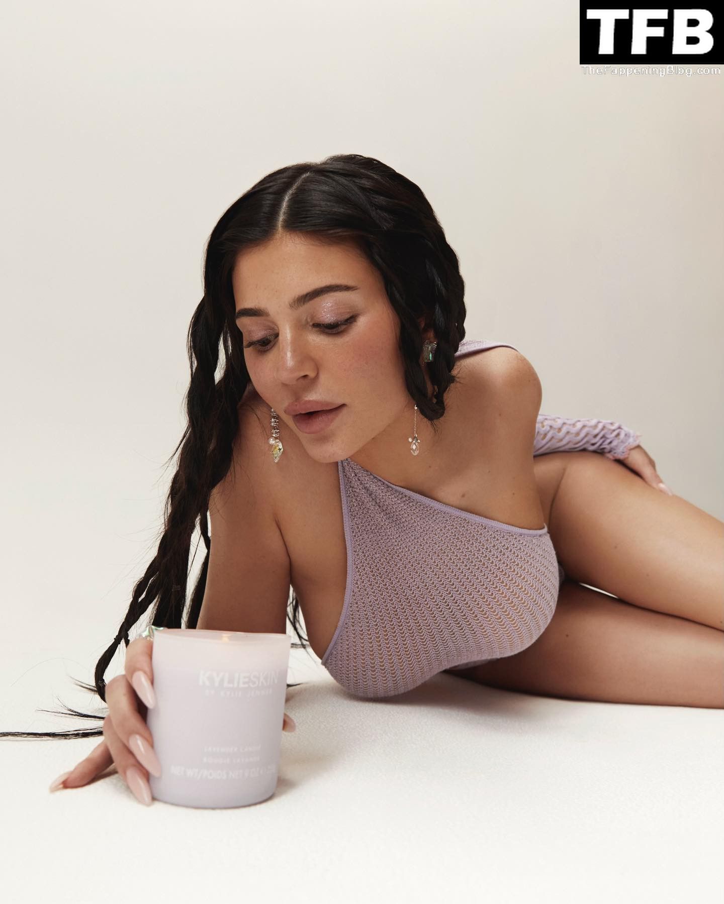 La modella Kylie Jenner sfoggia un look voluttuoso con un body succinto mentre promuove la sua nuova collezione lavanda Kylie Skin (maggio 2022).