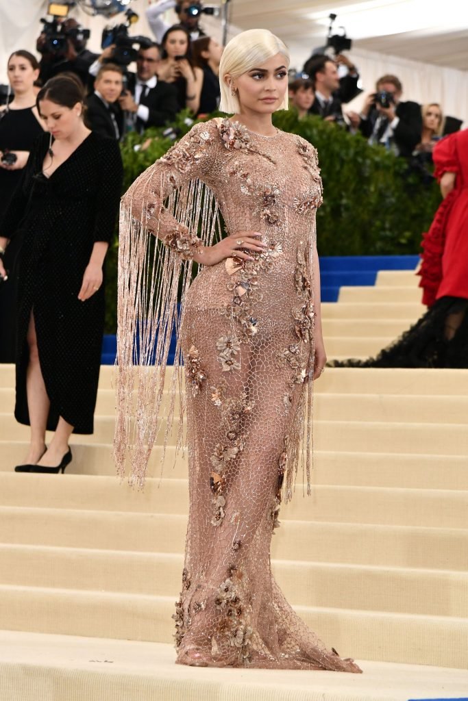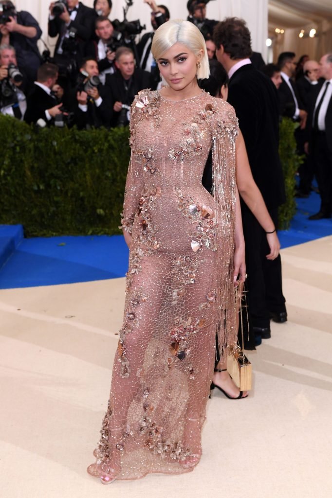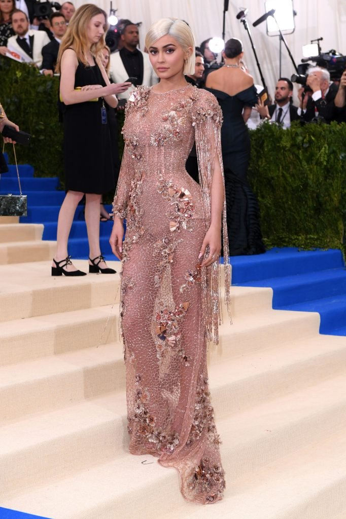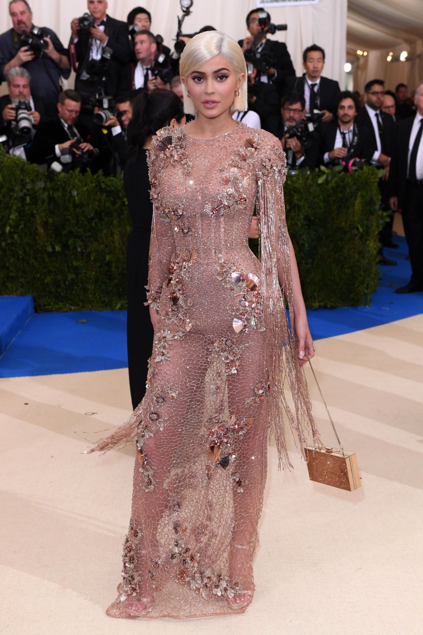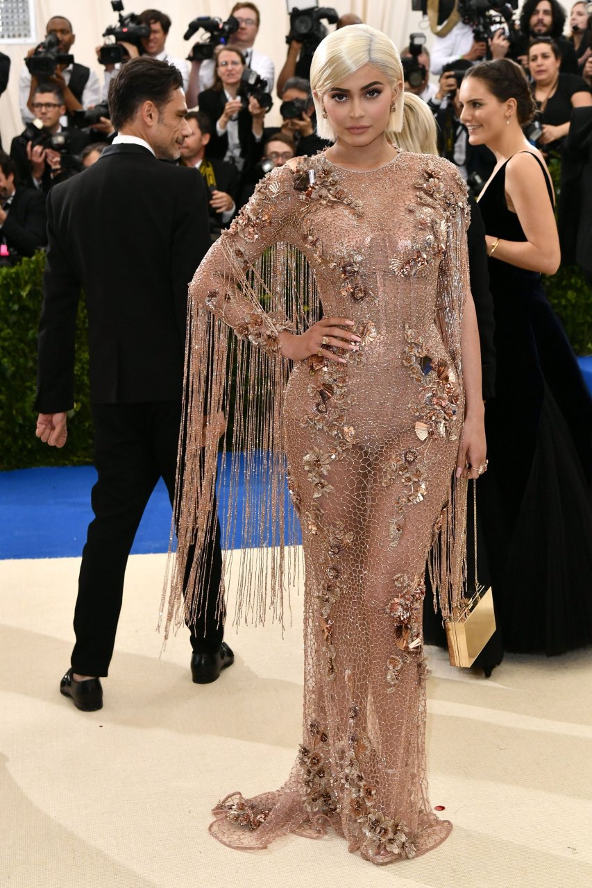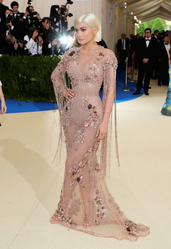 Kylie Jenner indossa un abito Versace nude trasparente al Met Gala 2017 a New York, 01/05/2017. Kylie Jenner è un’attrice americana, designer, modella, star televisiva, socialite. Età – 19.