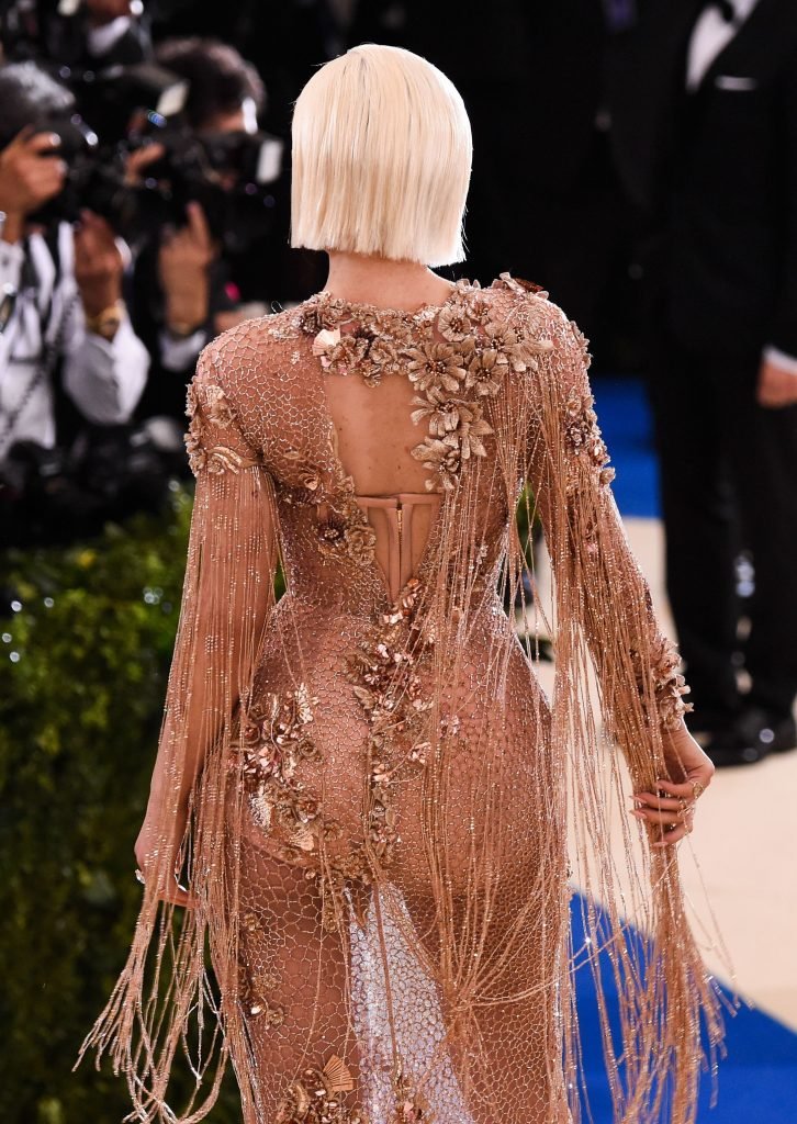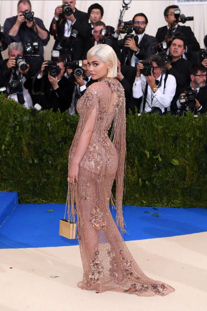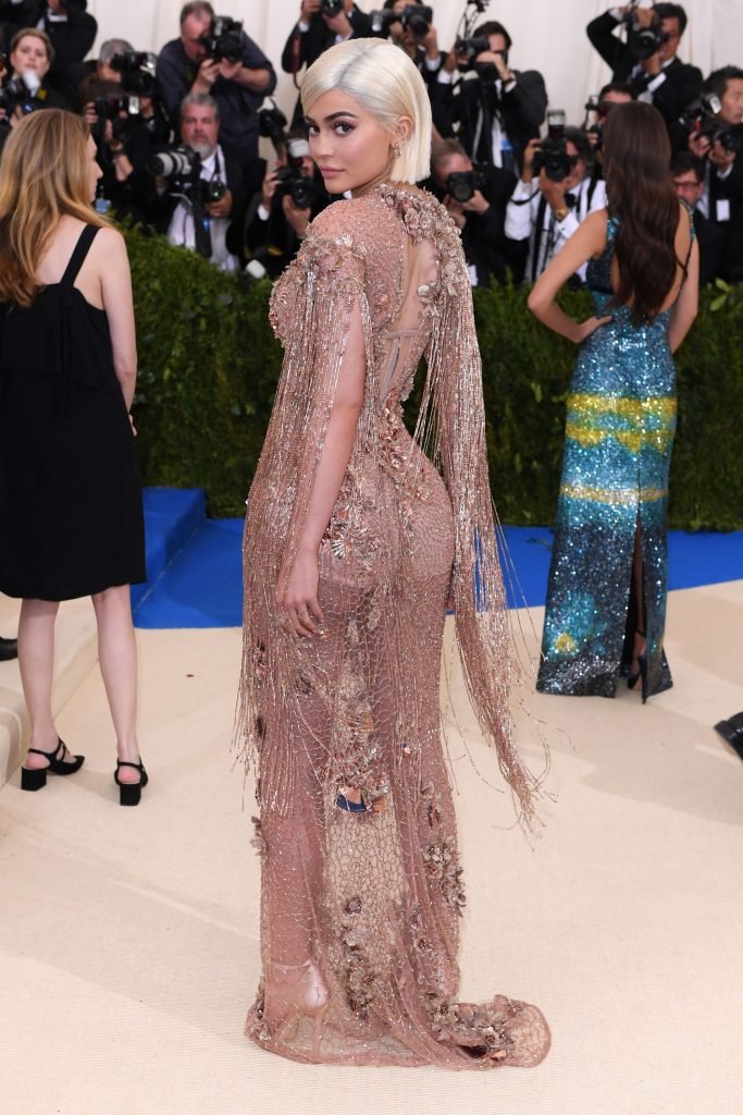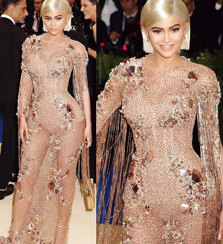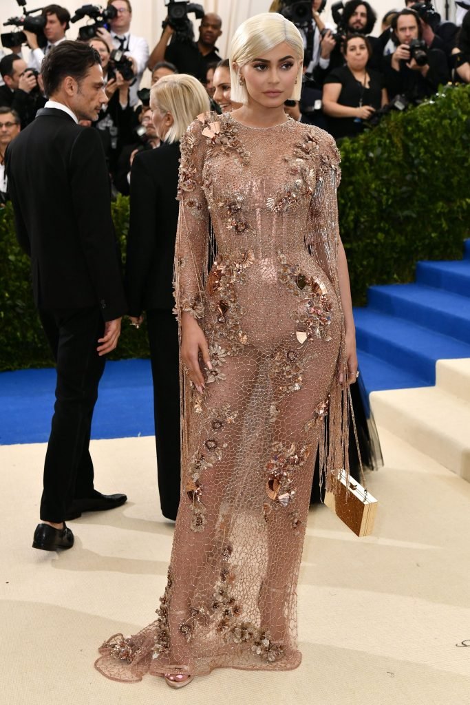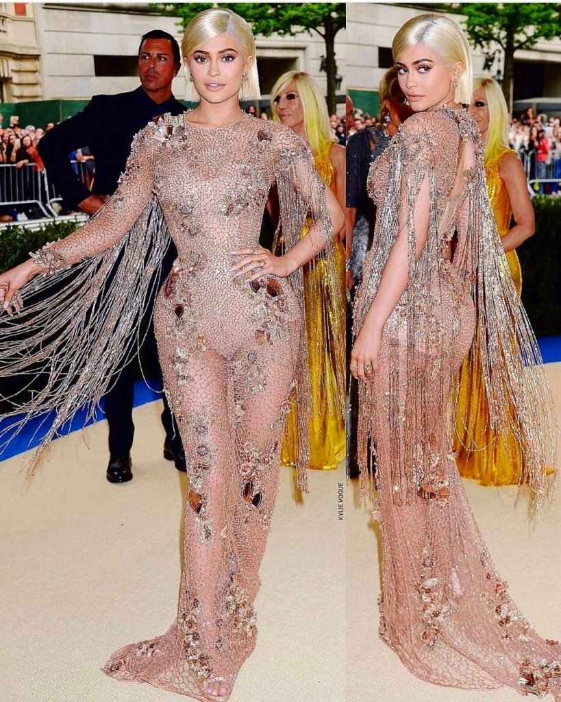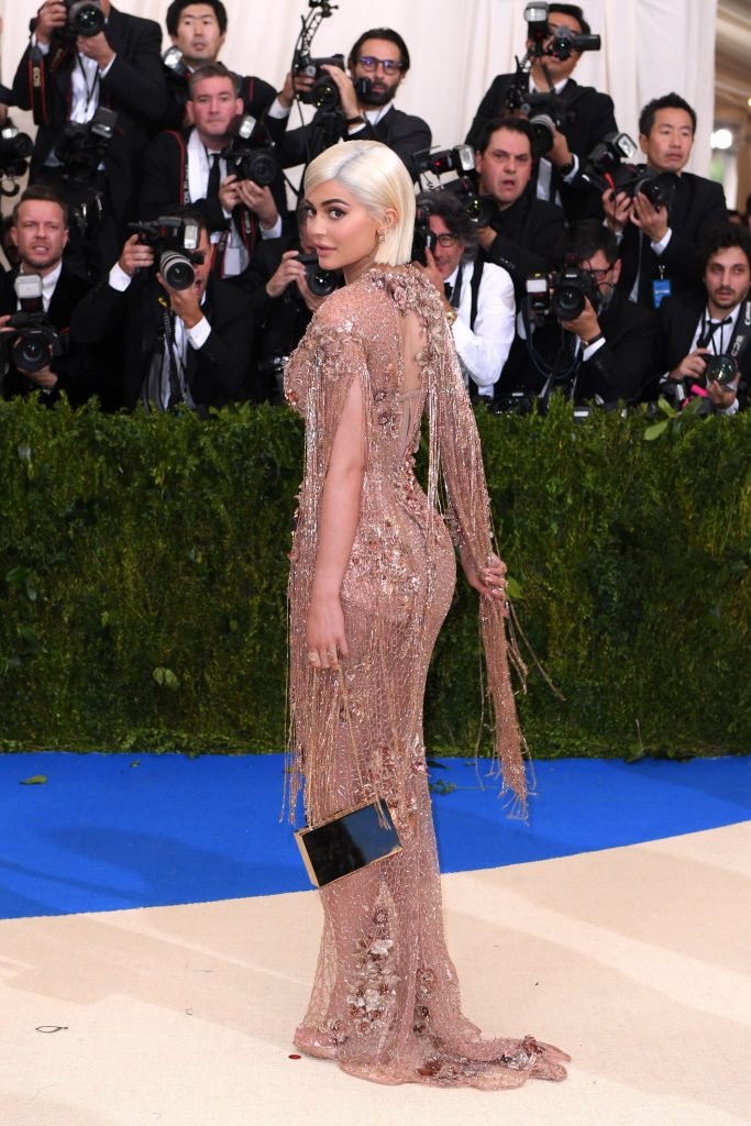 Kylie Jenner indossa un abito Versace nude trasparente al Met Gala 2017 a New York, 01/05/2017. Kylie Jenner è un’attrice americana, designer, modella, star televisiva, socialite. Età – 19.