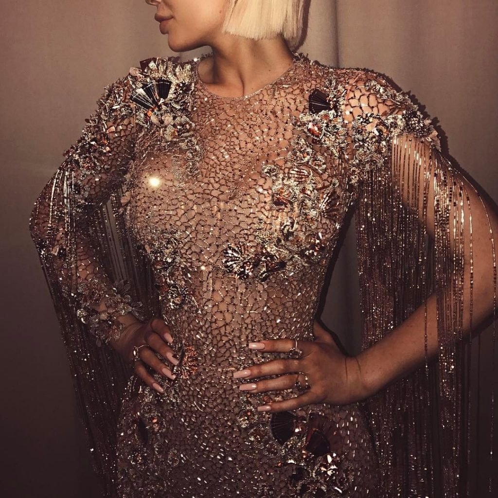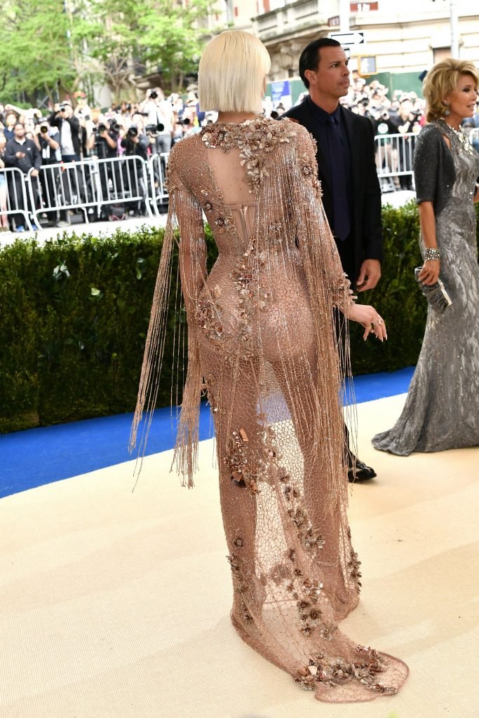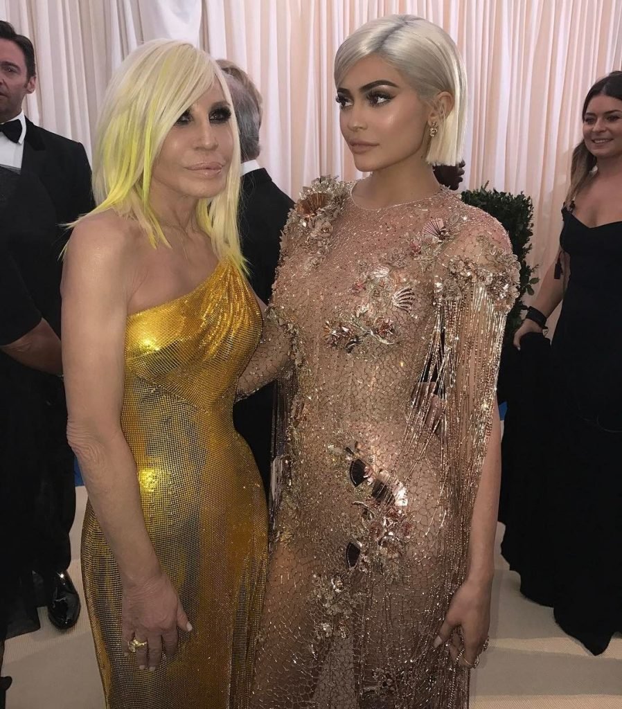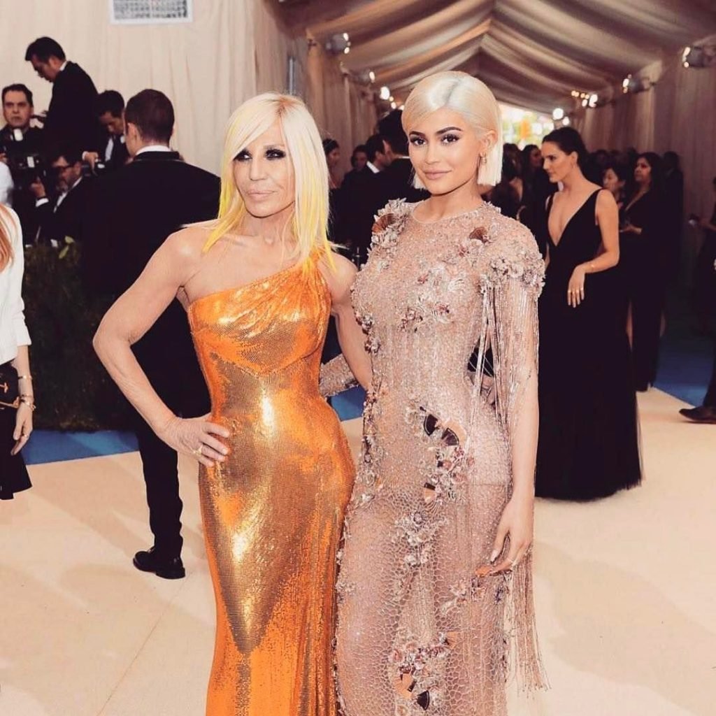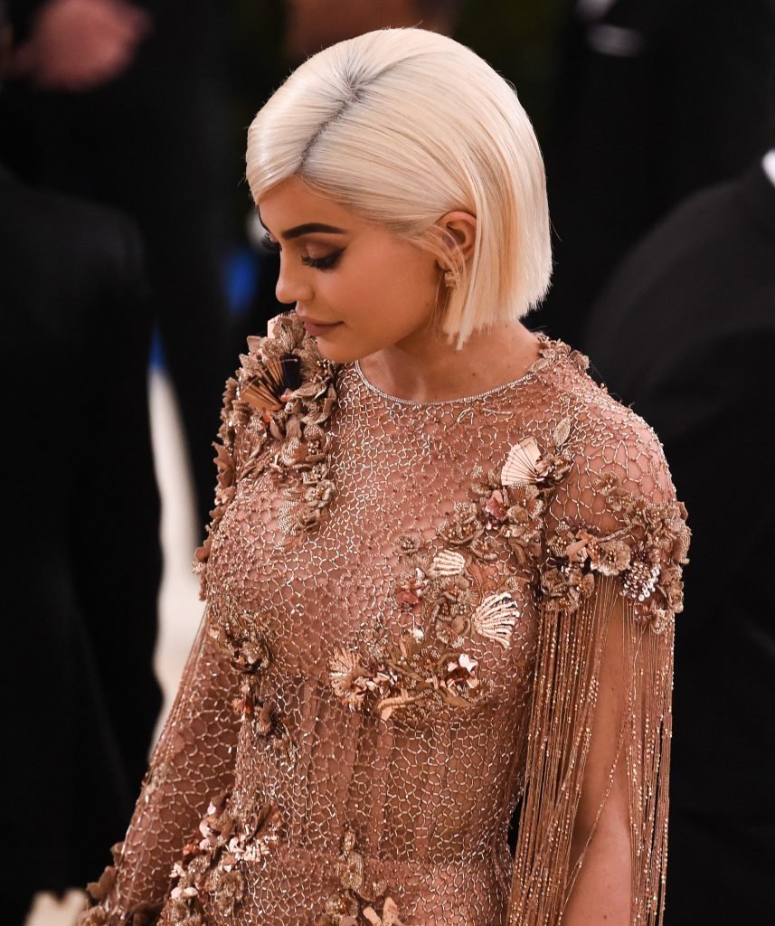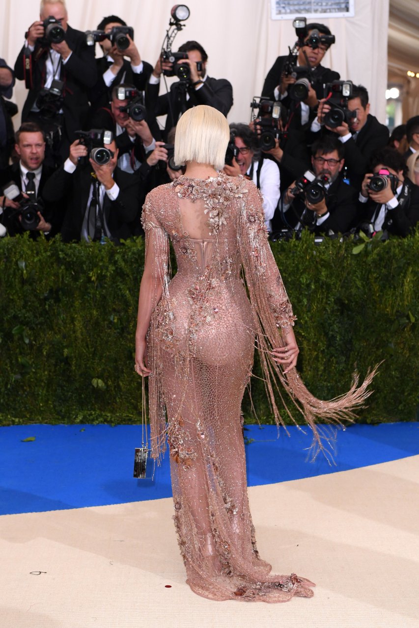 Kylie Jenner indossa un abito Versace nude trasparente al Met Gala 2017 a New York, 01/05/2017. Kylie Jenner è un’attrice americana, designer, modella, star televisiva, socialite. Età – 19.