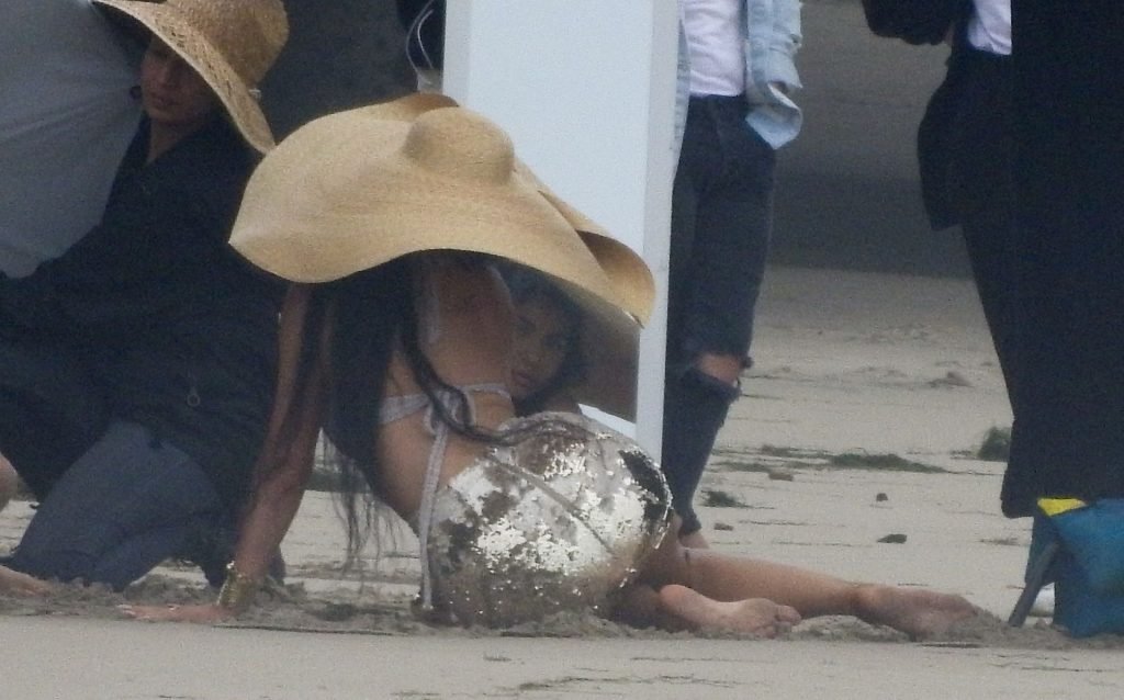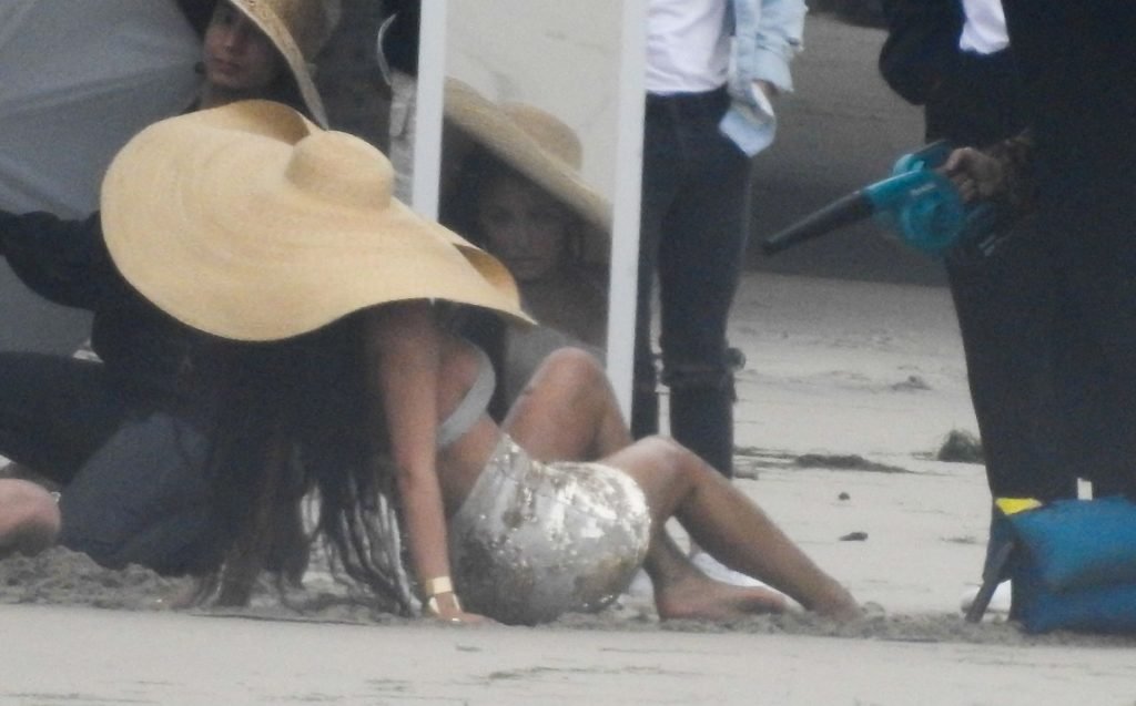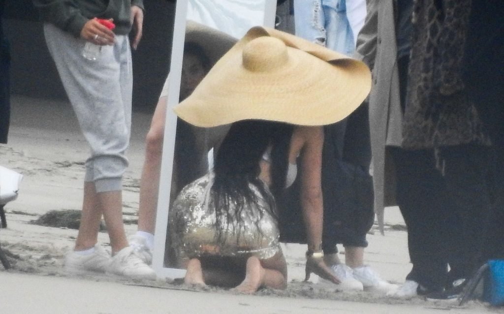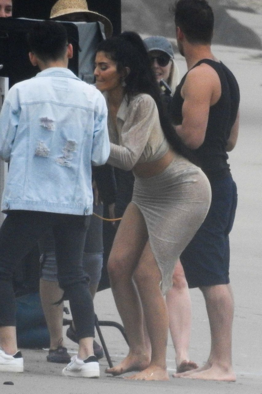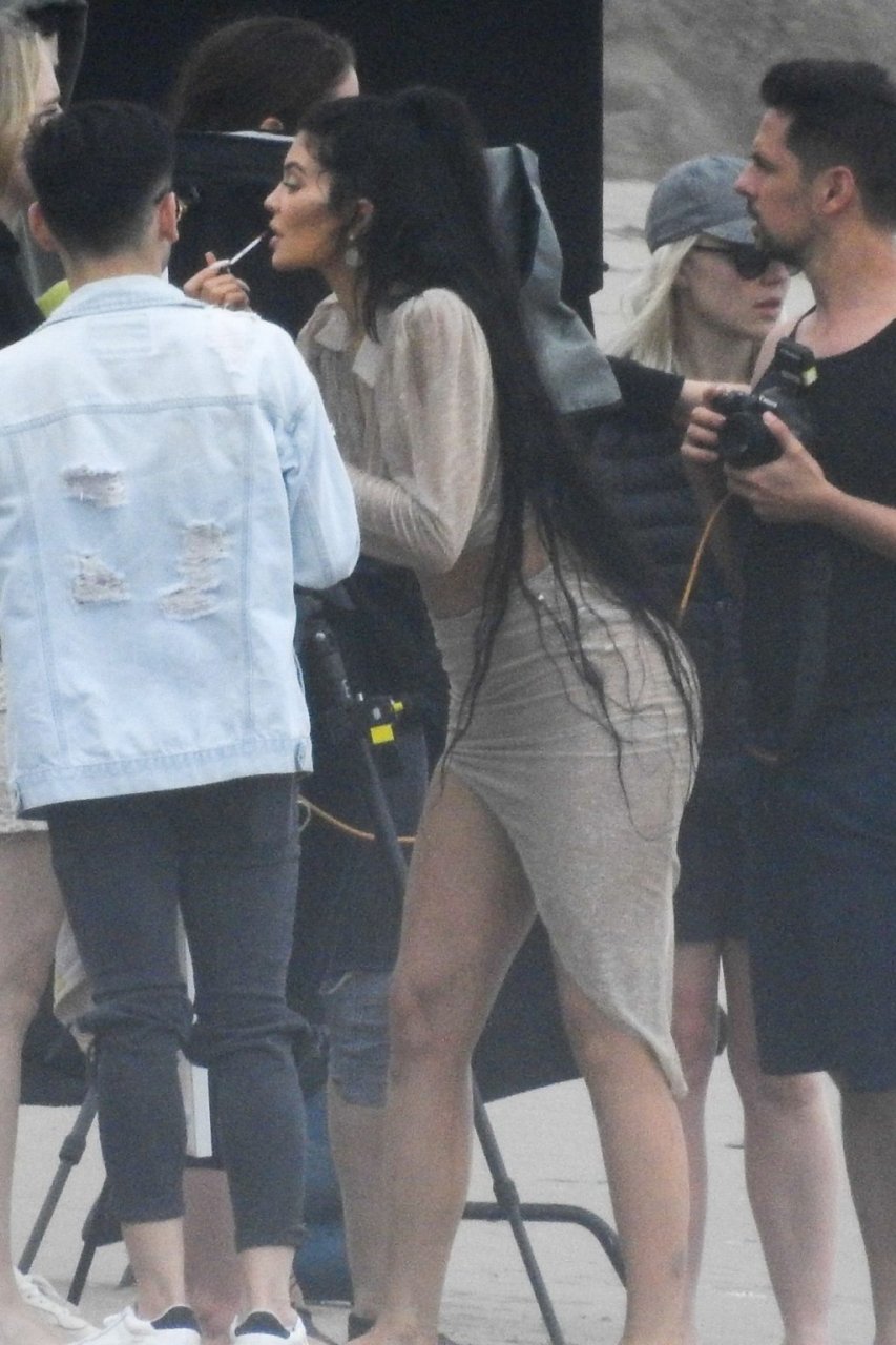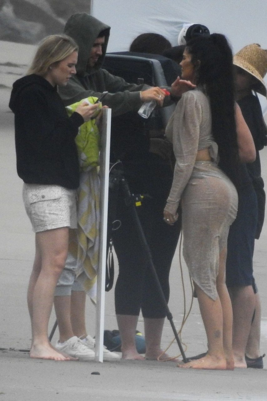 In un’altra scena, Kylie indossava un top bikini e una gonna di paillettes con un cappello da spiaggia oversize mentre posava sulla sabbia davanti a uno specchio. Molto personale era presente per aiutare, e un assistente fortunato aveva il compito faticoso di spruzzarla con una bottiglia d’acqua assicurandosi che avesse la giusta quantità di acqua e sabbia attaccata alle gambe.