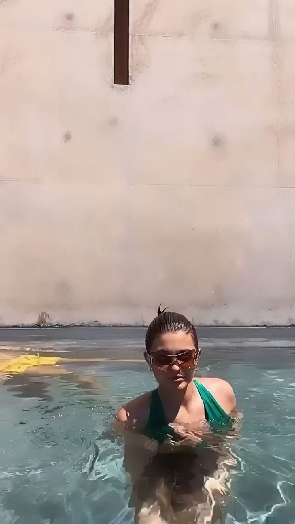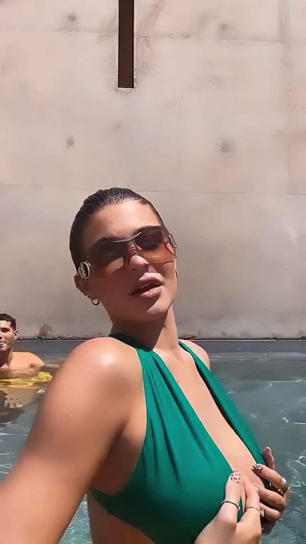 Dai un’occhiata alle nuove foto sexy, gif e video di Kylie Jenner da Instagram, 07/07/2020. La bruna ha mostrato il suo seno posando in piscina con un costume verde.