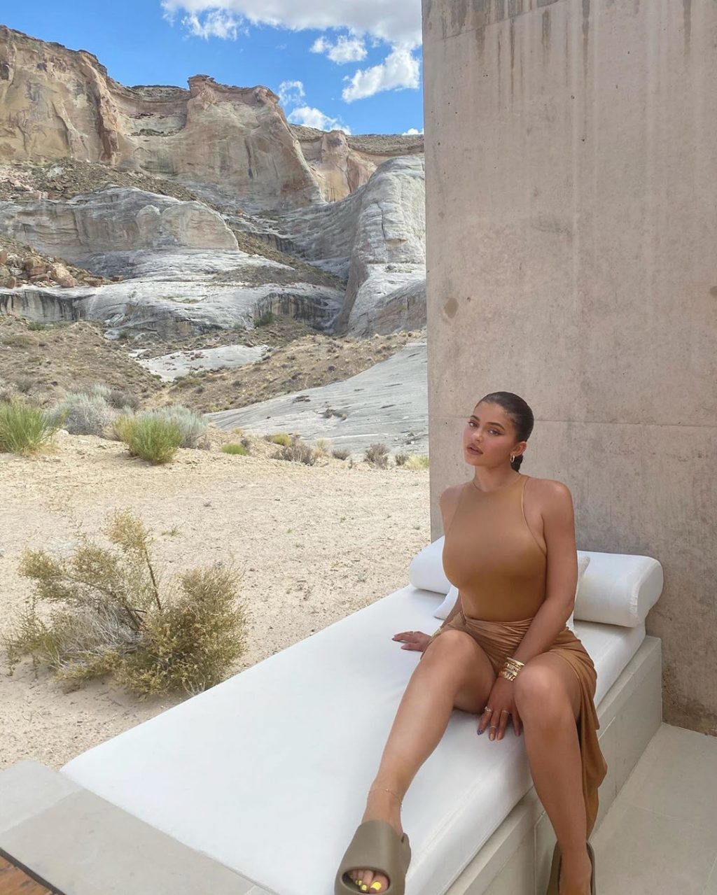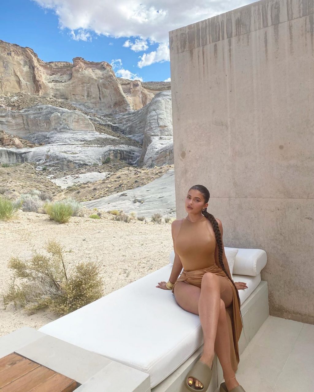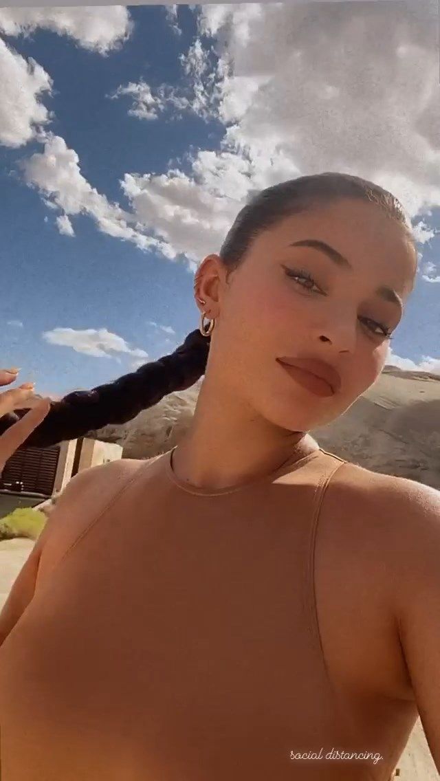 Fake Star Kylie Jenner mostra il suo seno e i piedi mentre posa con un vestito aderente mantenendo la distanza sociale nel South Dakota – Instagram, 07/06/2020.
