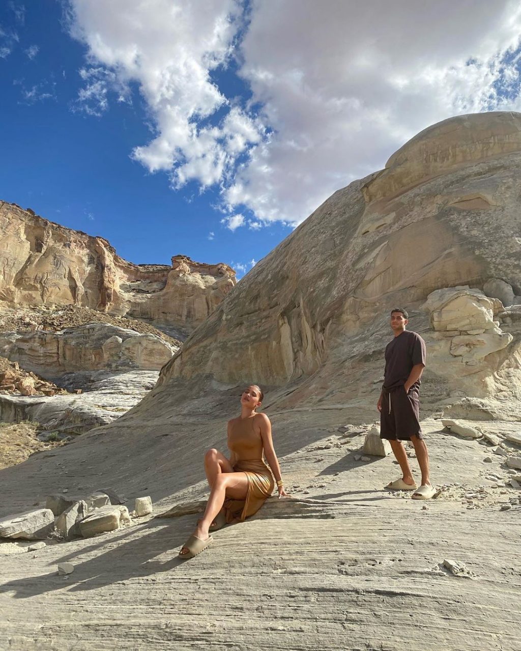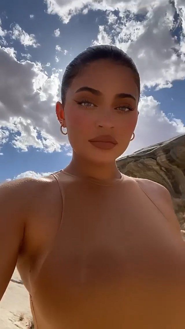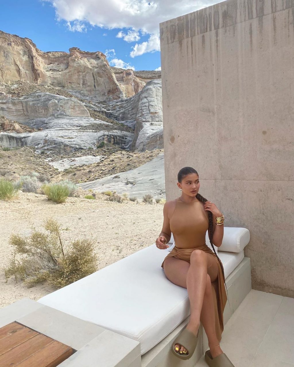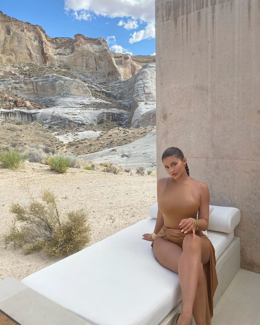 Fake Star Kylie Jenner mostra il suo seno e i piedi mentre posa con un vestito aderente mantenendo la distanza sociale nel South Dakota – Instagram, 07/06/2020.