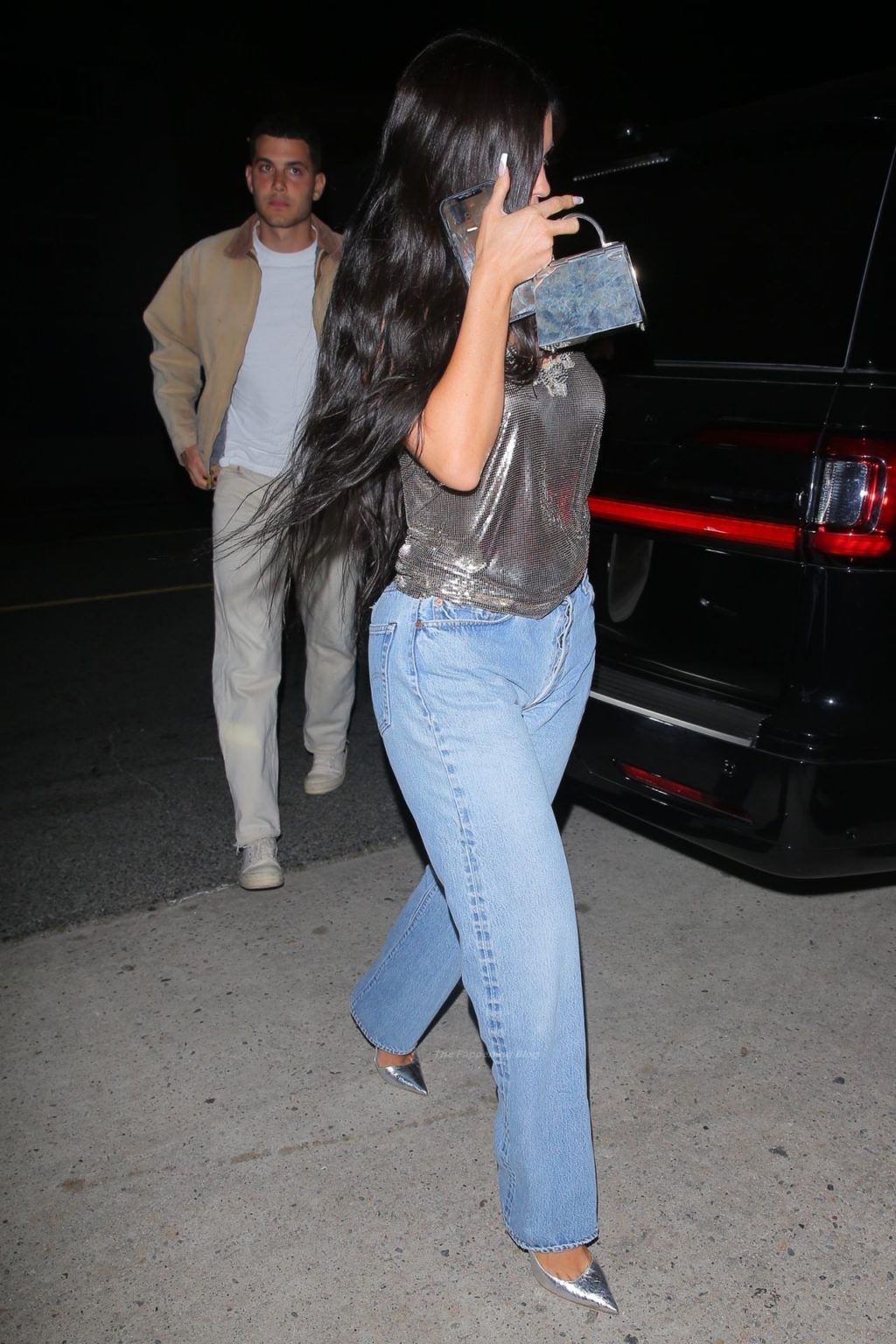 Kylie ha brillato con un top scintillante con spalline sottili abbinato a jeans di denim blu e tacchi argento. Ha accessoriato il look con una piccola borsa argento.