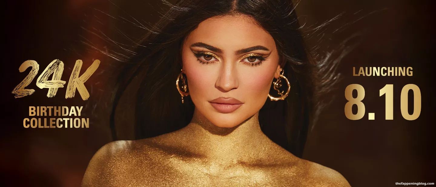La modella Kylie Jenner promuove i suoi cosmetici, posando topless, coprendo i seni con le mani e con glitter dorati in un nuovo servizio fotografico (2021).
