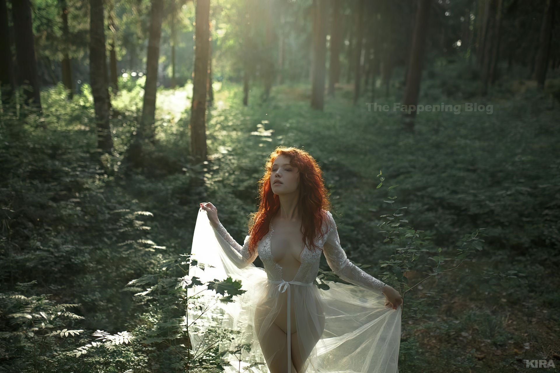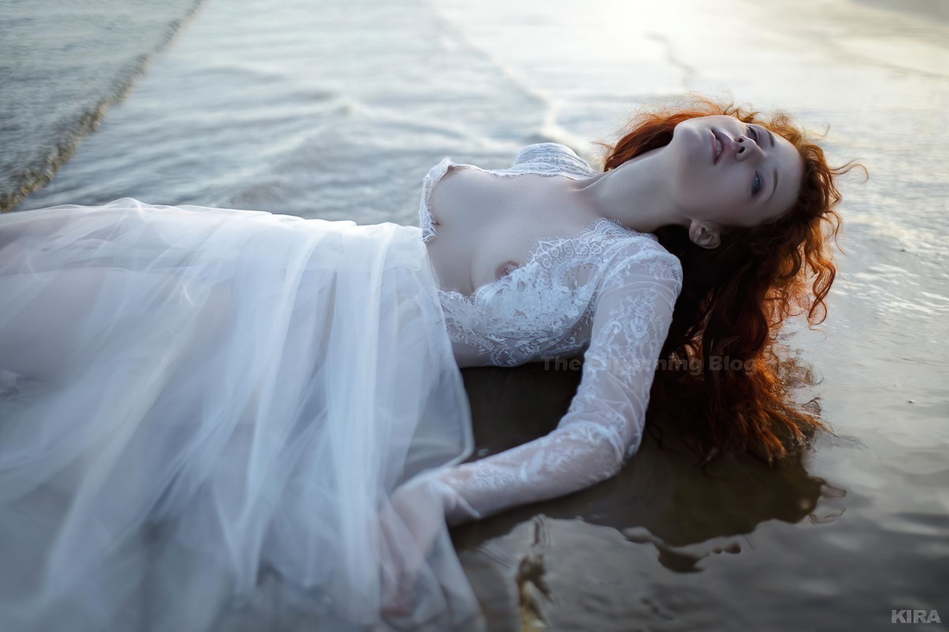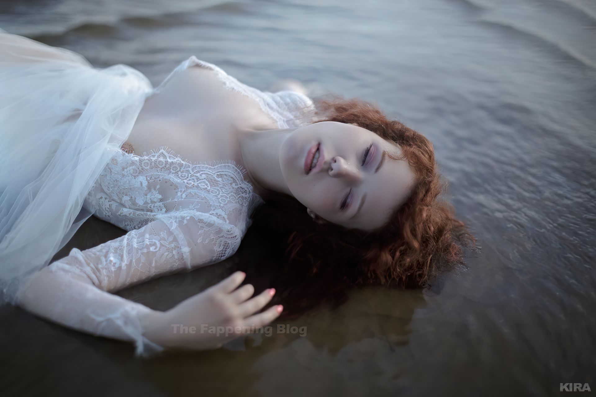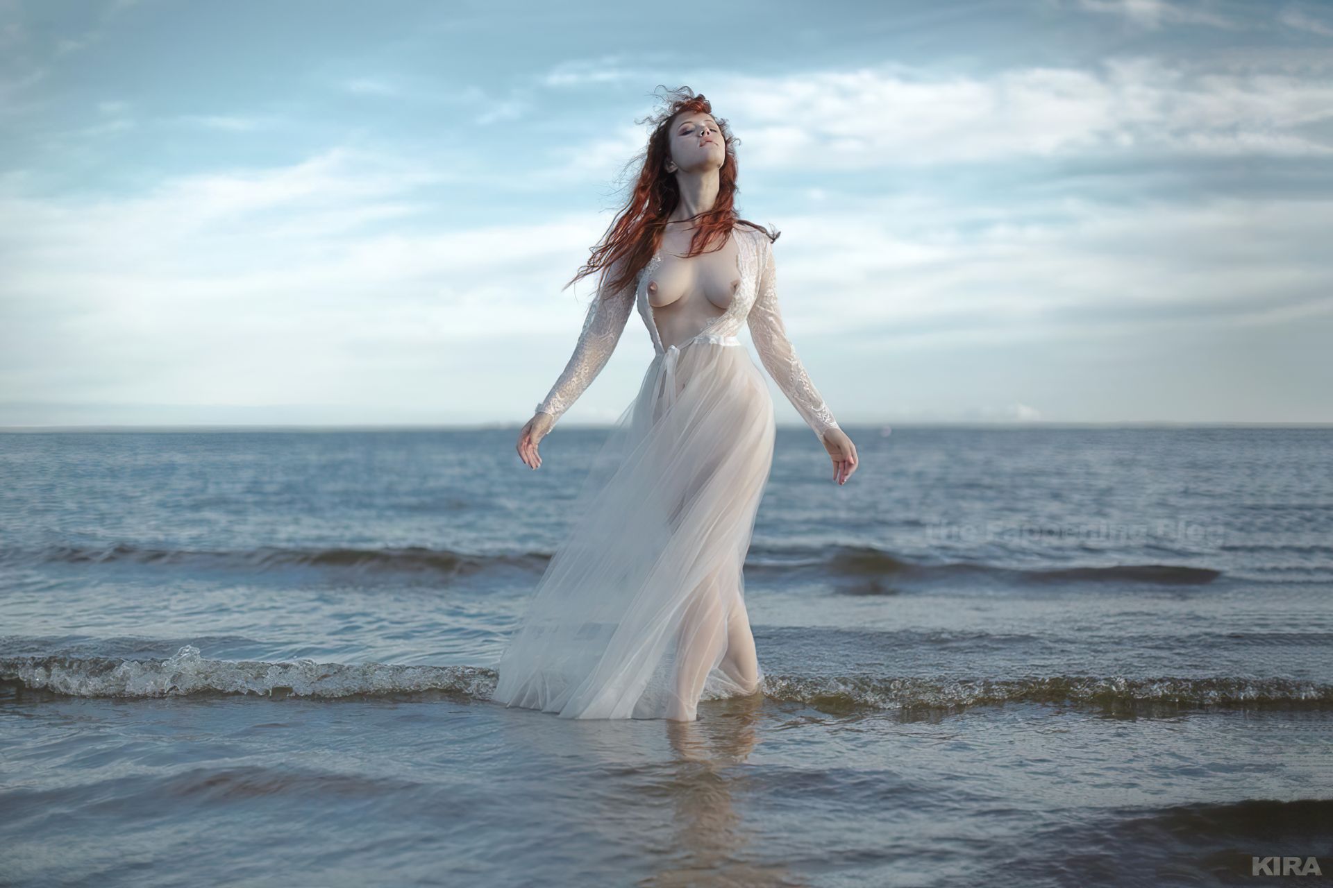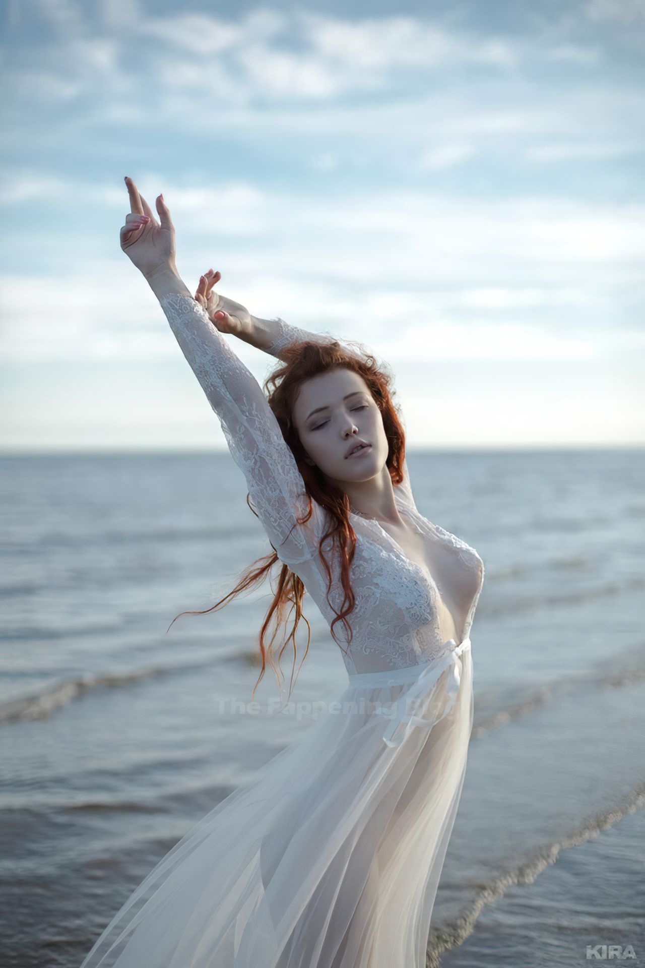 Modella cosplay russa dai capelli rossi e designer, Lada Lyumos passa dalla foresta al mare indossando bellissimi abiti trasparenti e poco altro in un servizio fotografico di Kira Mitenkova.