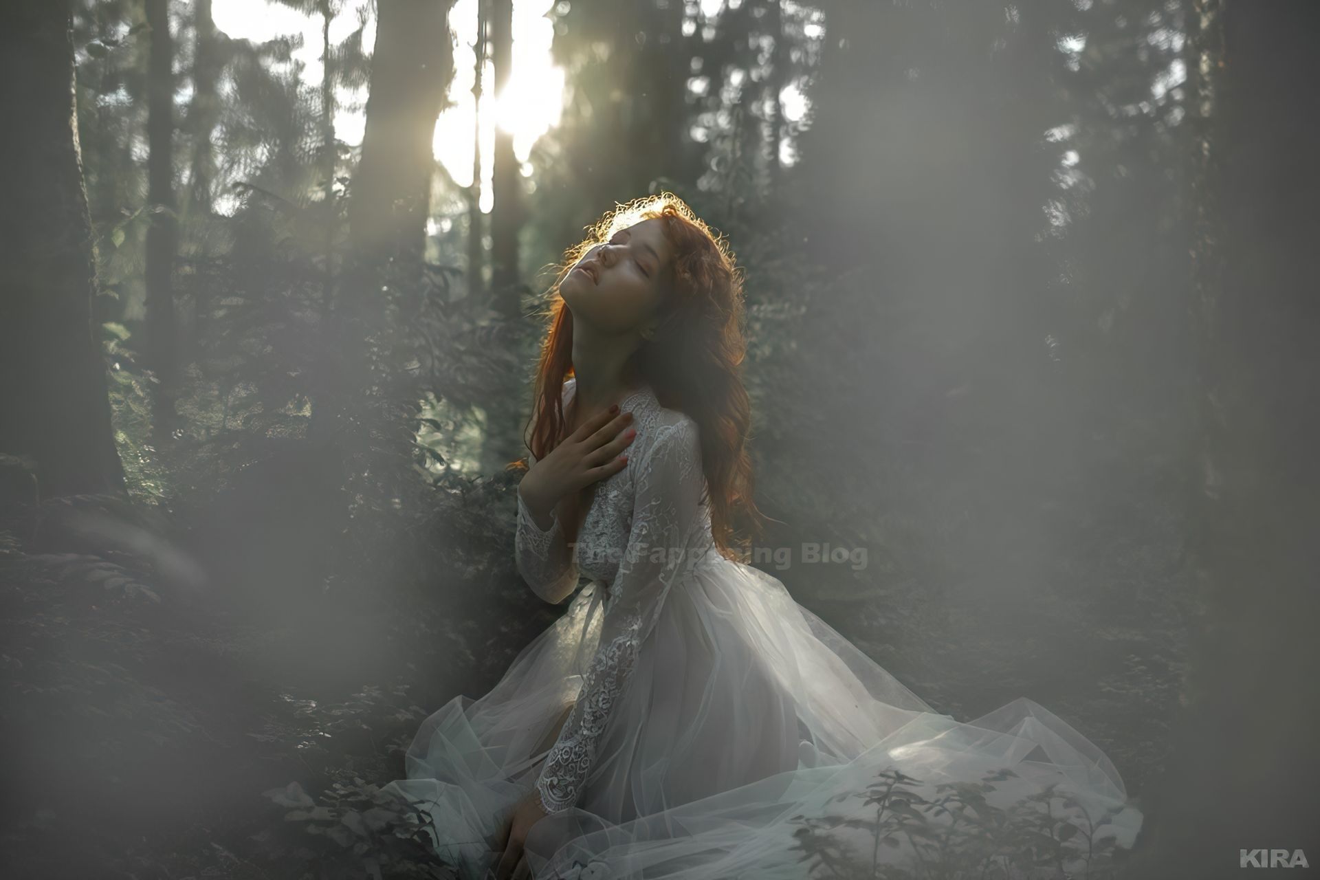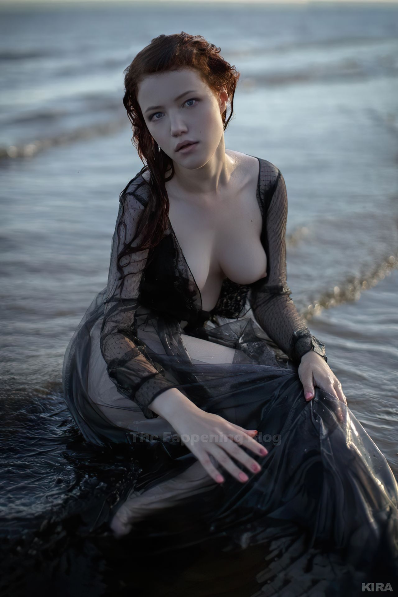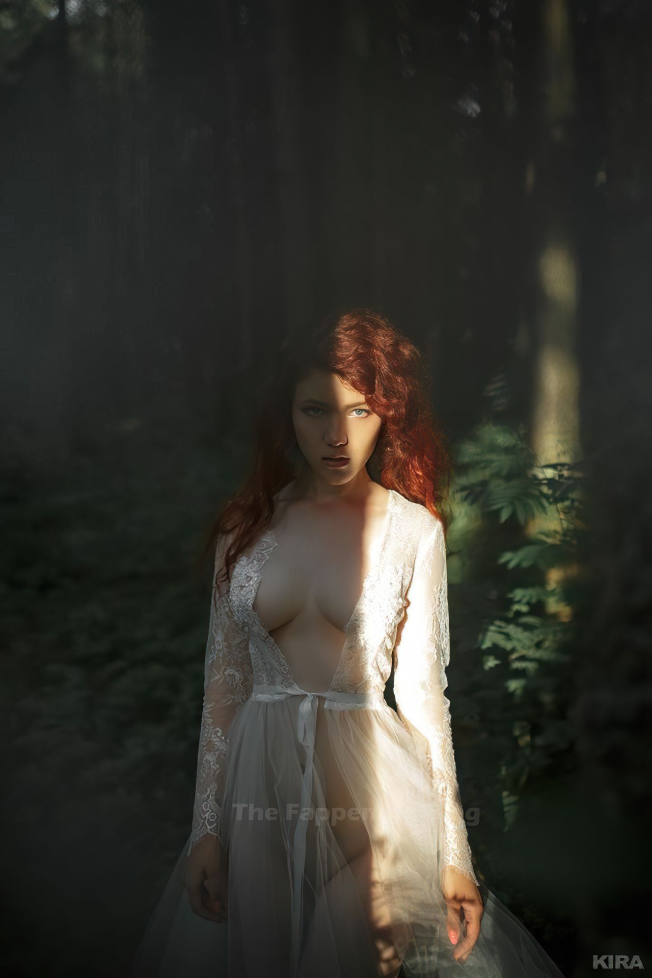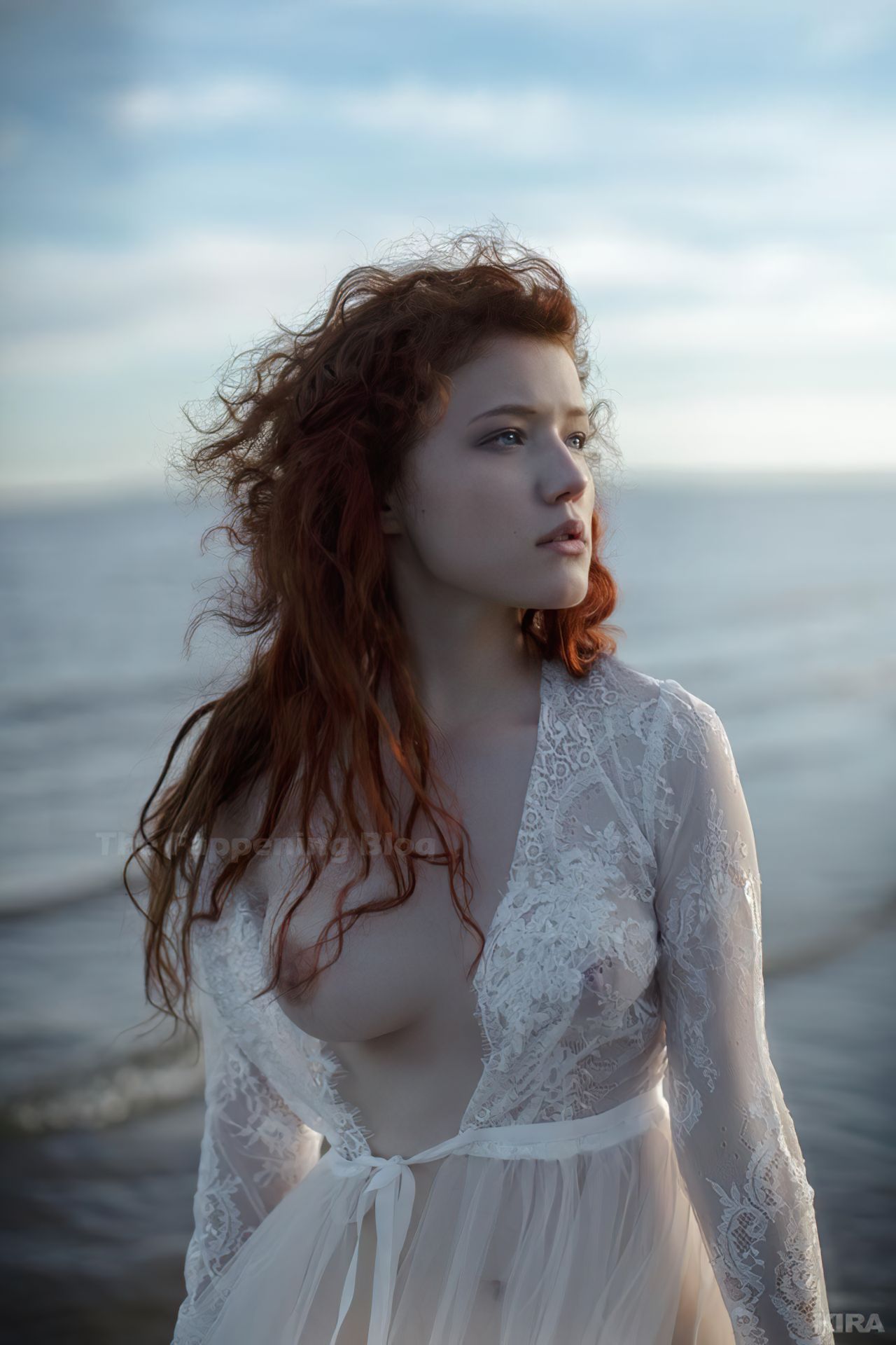 Modella cosplay russa dai capelli rossi e designer, Lada Lyumos passa dalla foresta al mare indossando bellissimi abiti trasparenti e poco altro in un servizio fotografico di Kira Mitenkova.