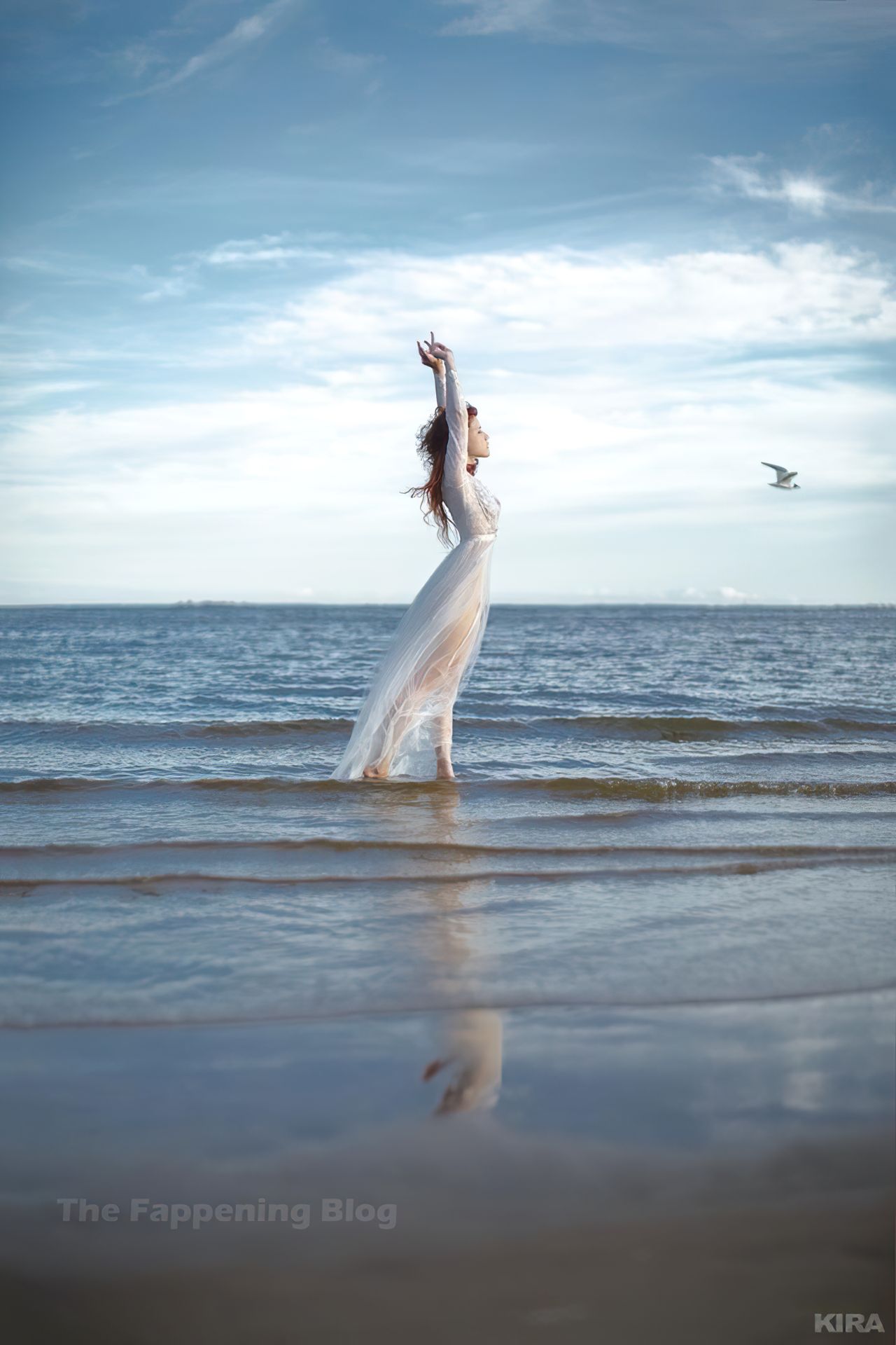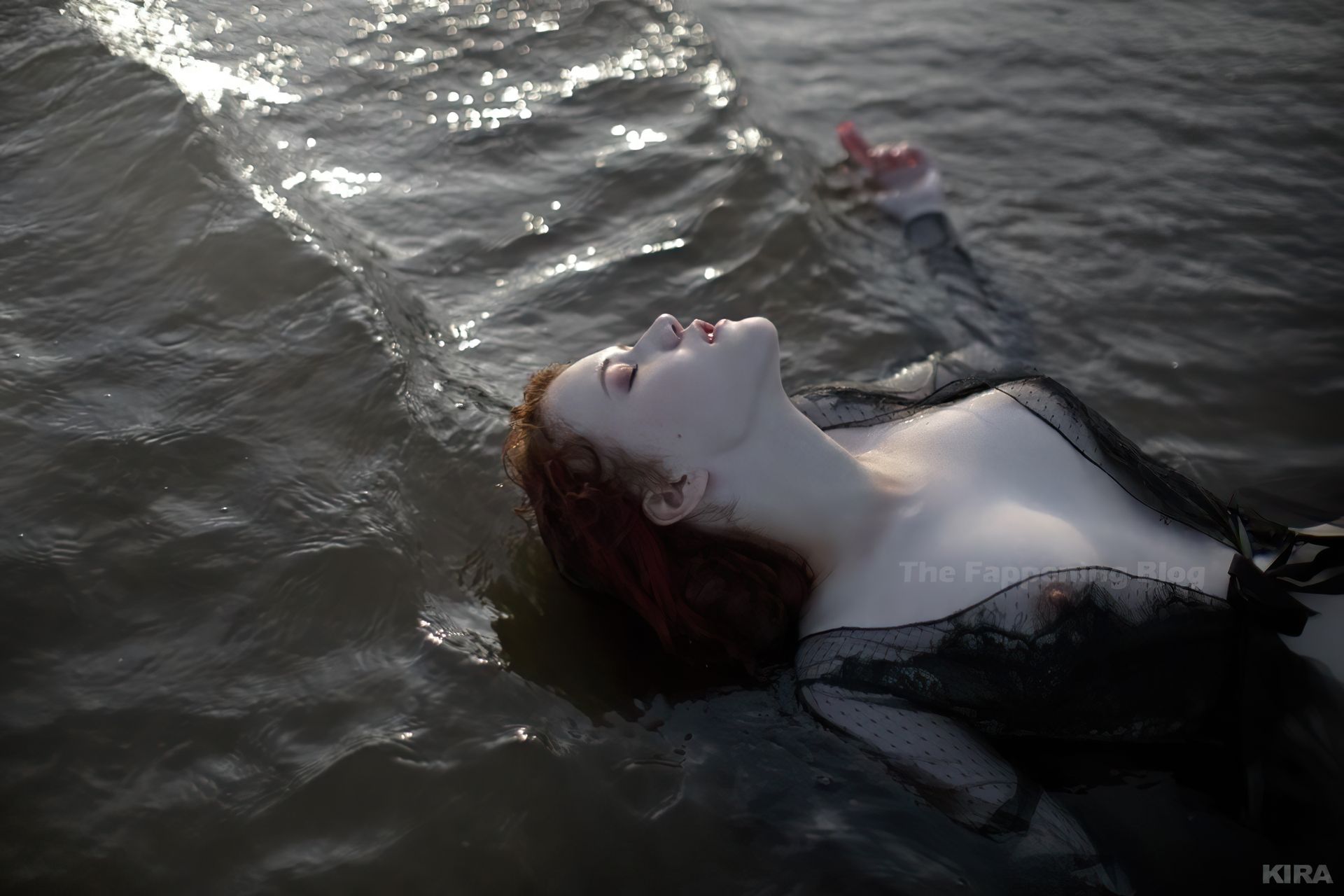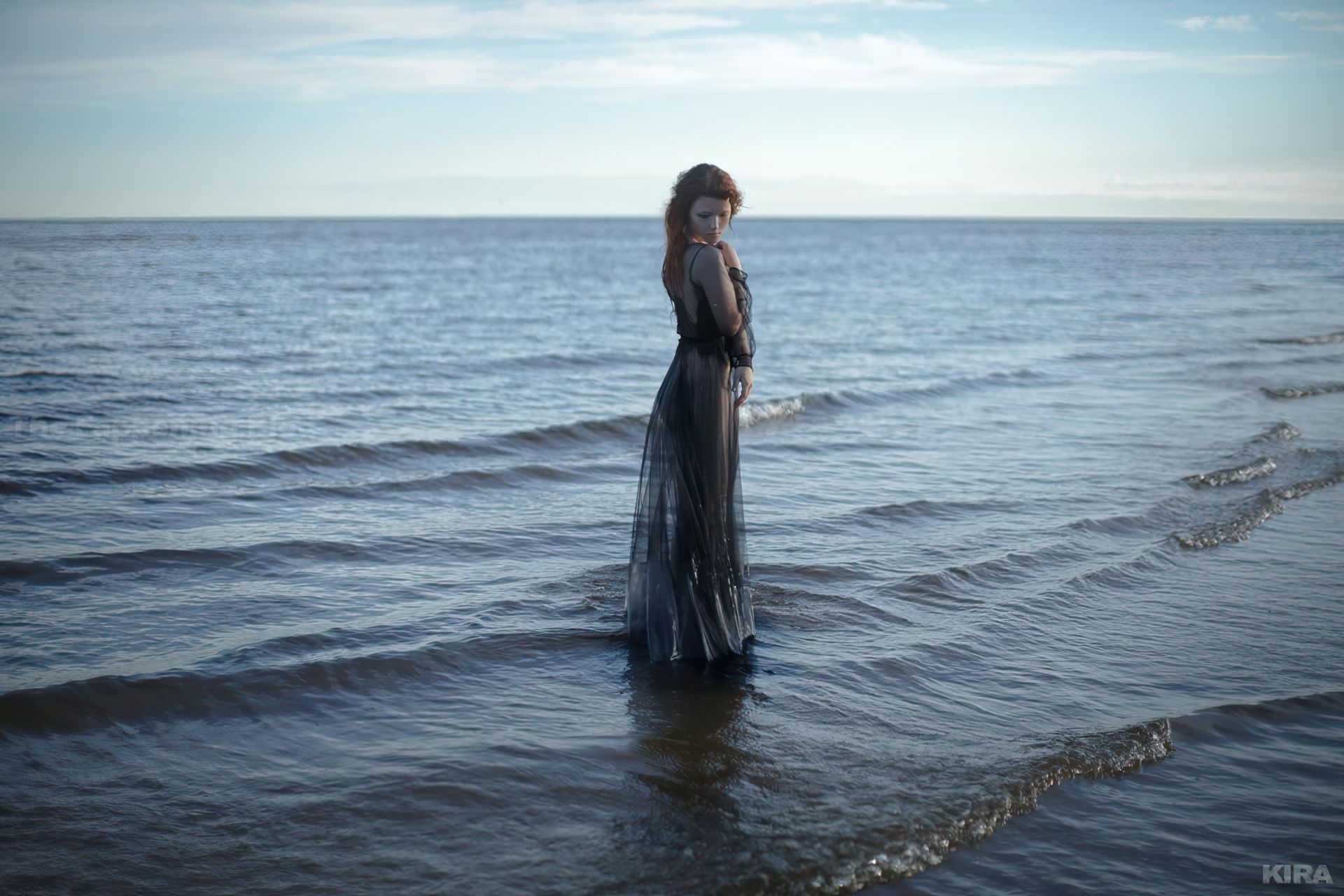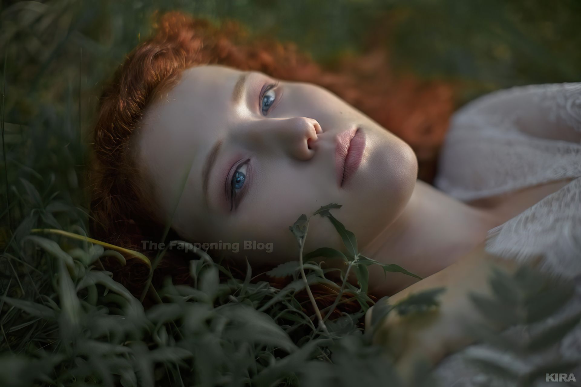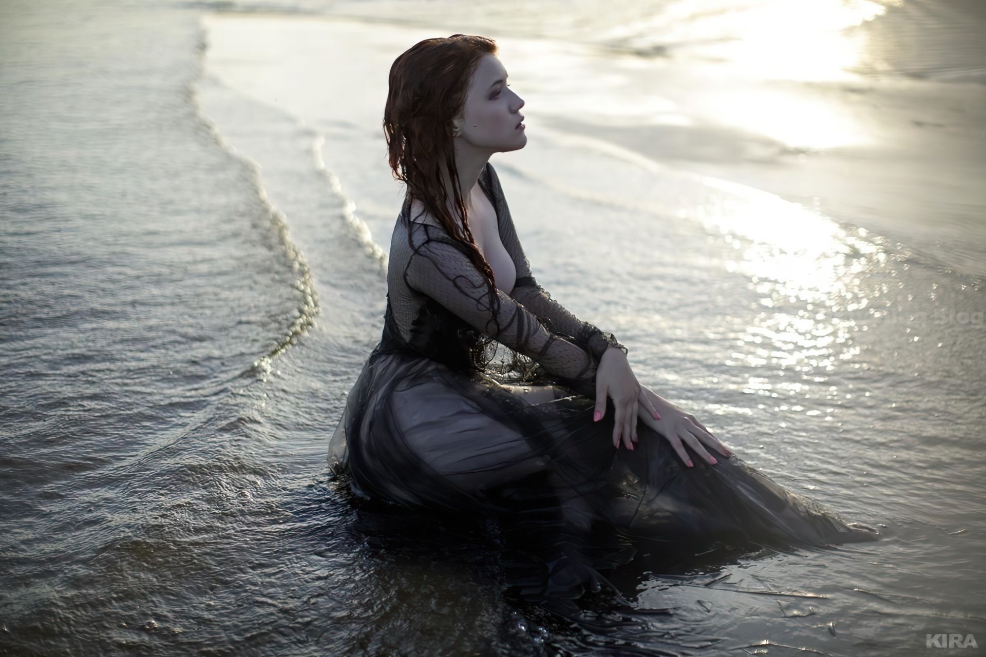 Modella cosplay russa dai capelli rossi e designer, Lada Lyumos passa dalla foresta al mare indossando bellissimi abiti trasparenti e poco altro in un servizio fotografico di Kira Mitenkova.