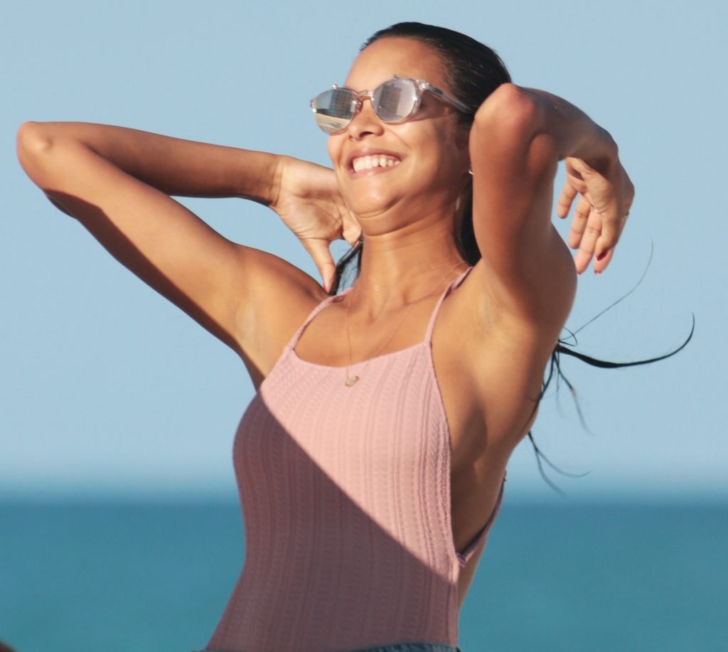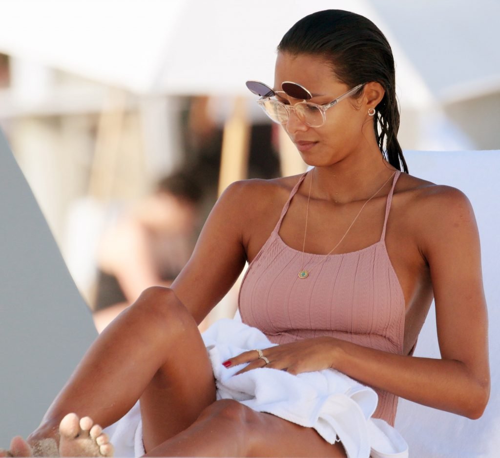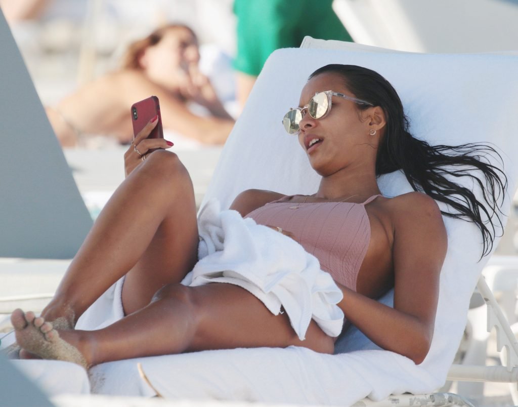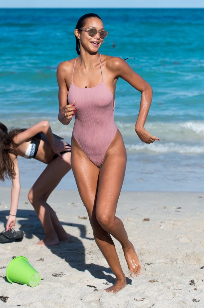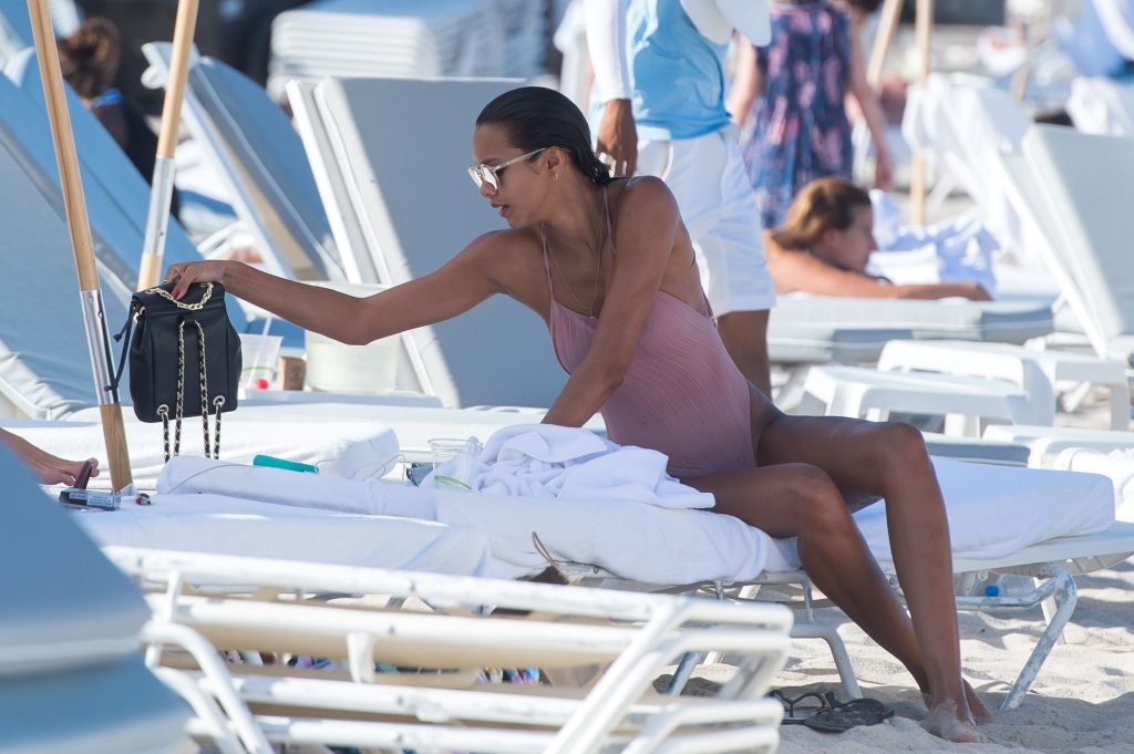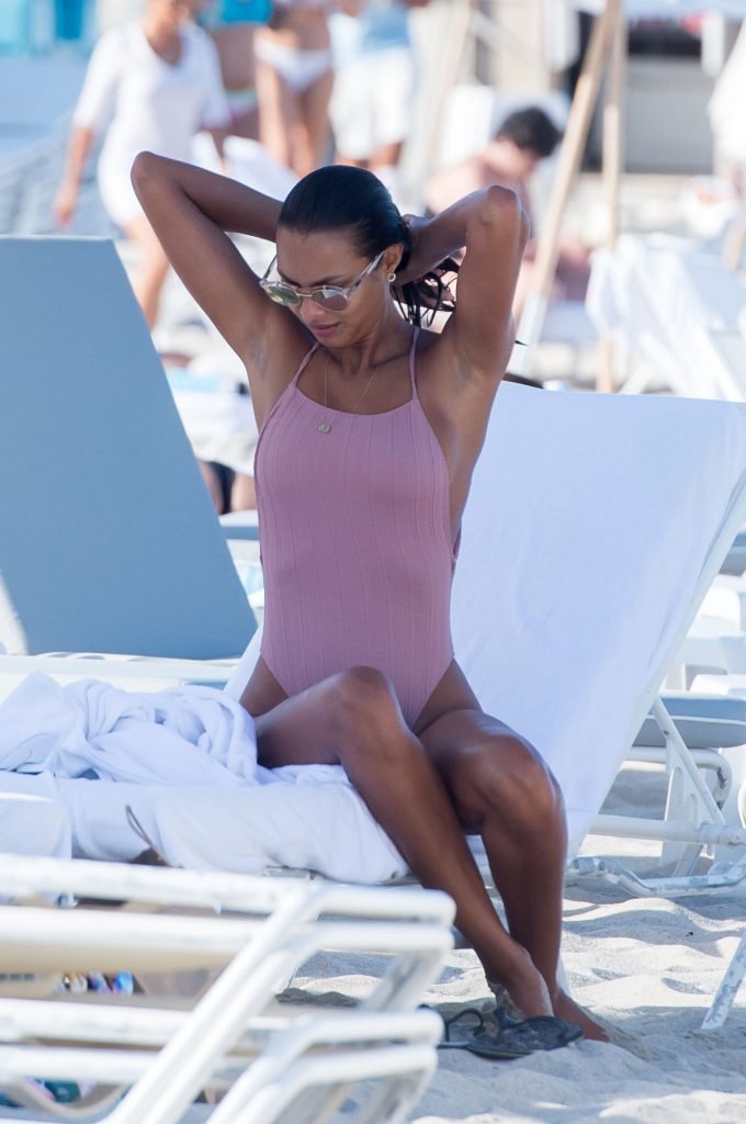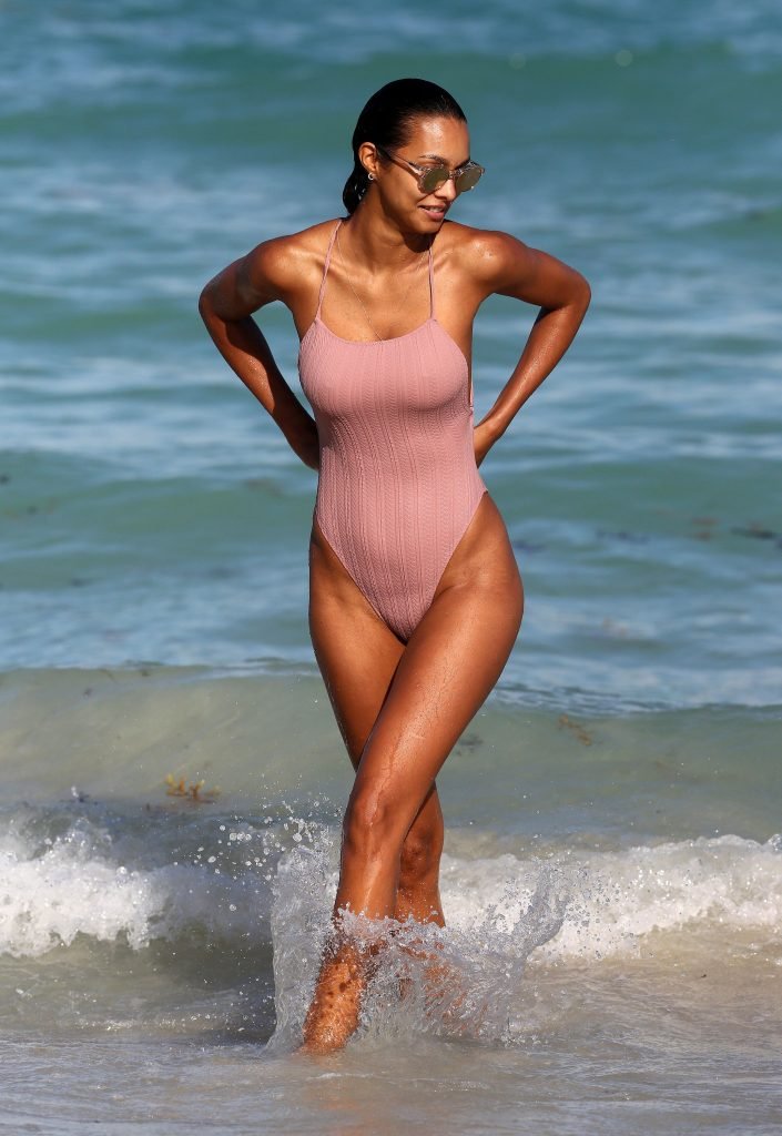 Lais Ribeiro indossa un sexy costume da bagno rosa mentre si gode una giornata di sole sulla spiaggia di Miami Beach, 04/04/2018. Lais Ribeiro è una modella, Angelo di VS e attrice brasiliana. Età – 27 anni.