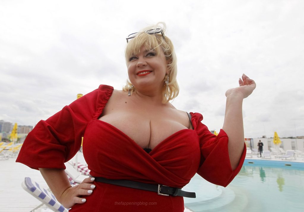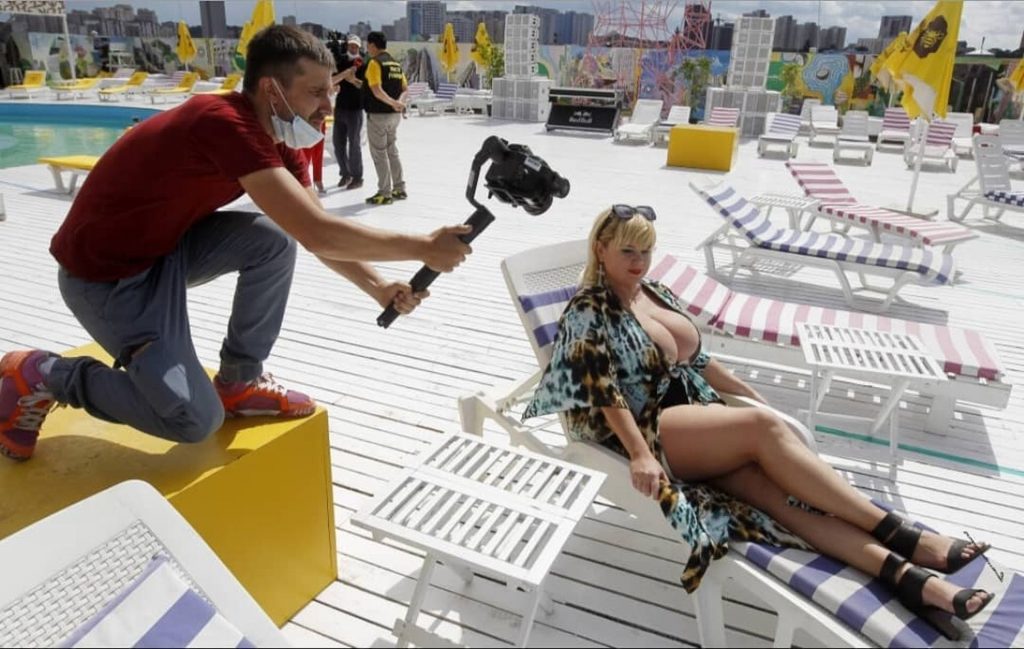 Detentrice del record nella categoria “Il più grande seno naturale” Mila Kuznetsova, la cui circonferenza del busto è di 1 m 35 cm 5 mm, posa in costume da bagno su una chaise longue a bordo piscina a Kiev, 07/09/2020.
