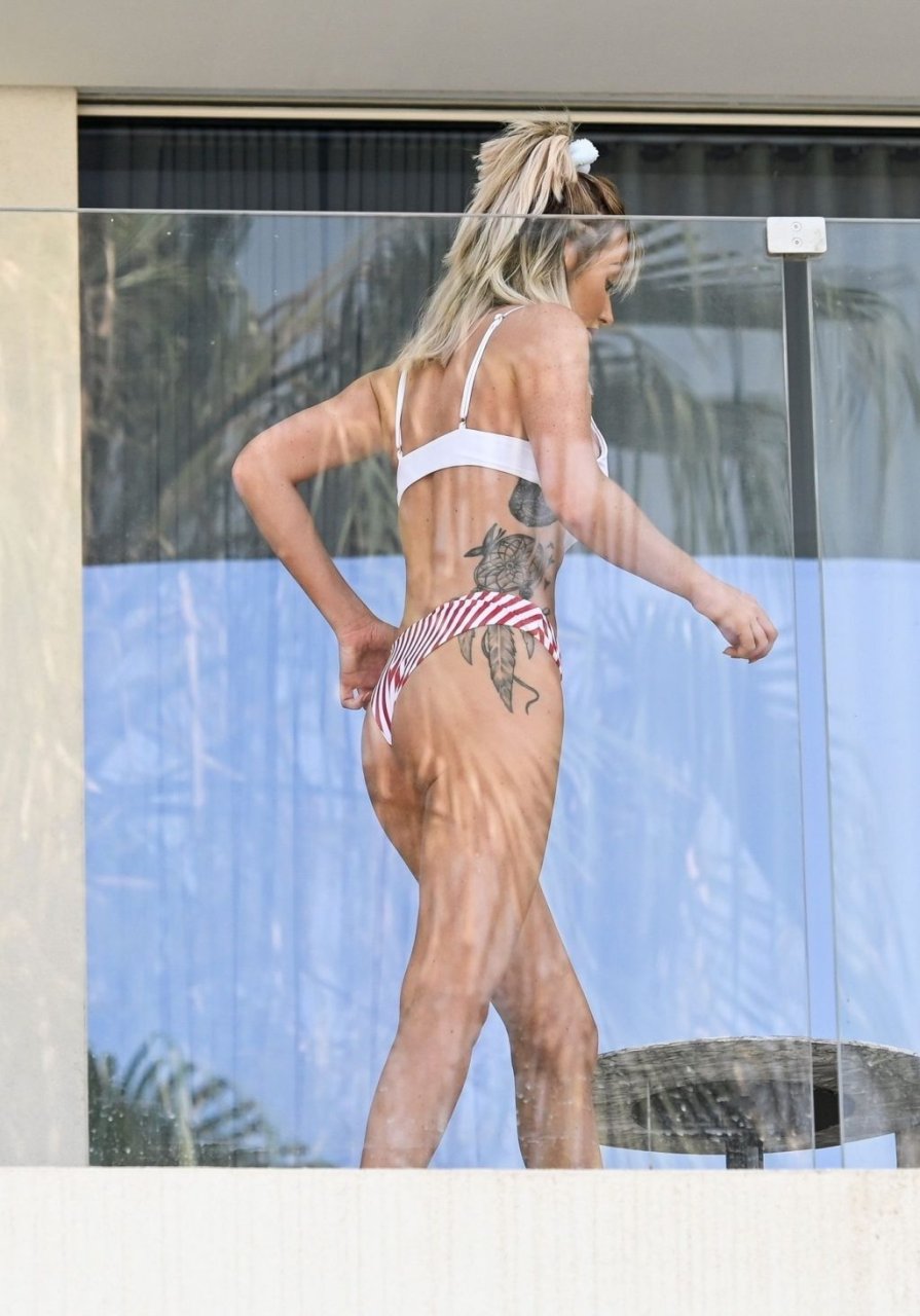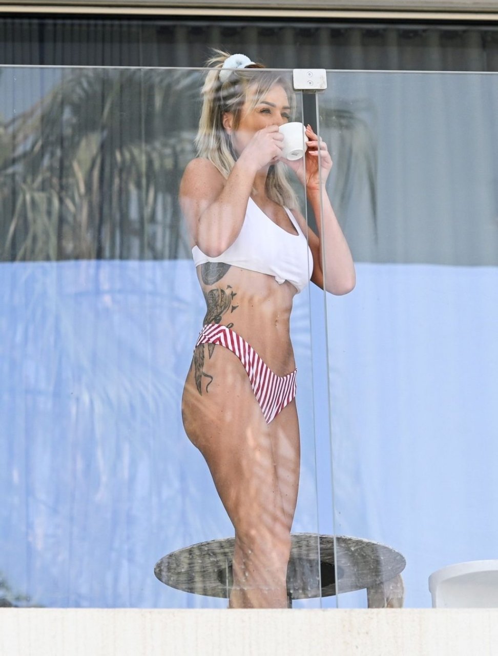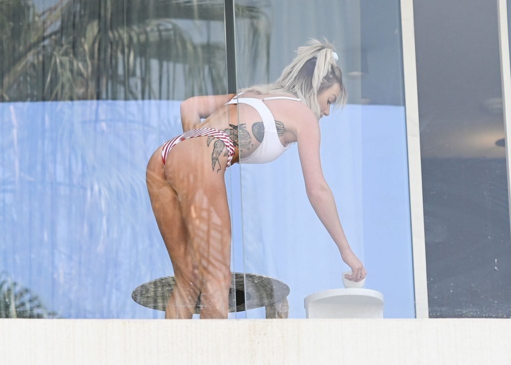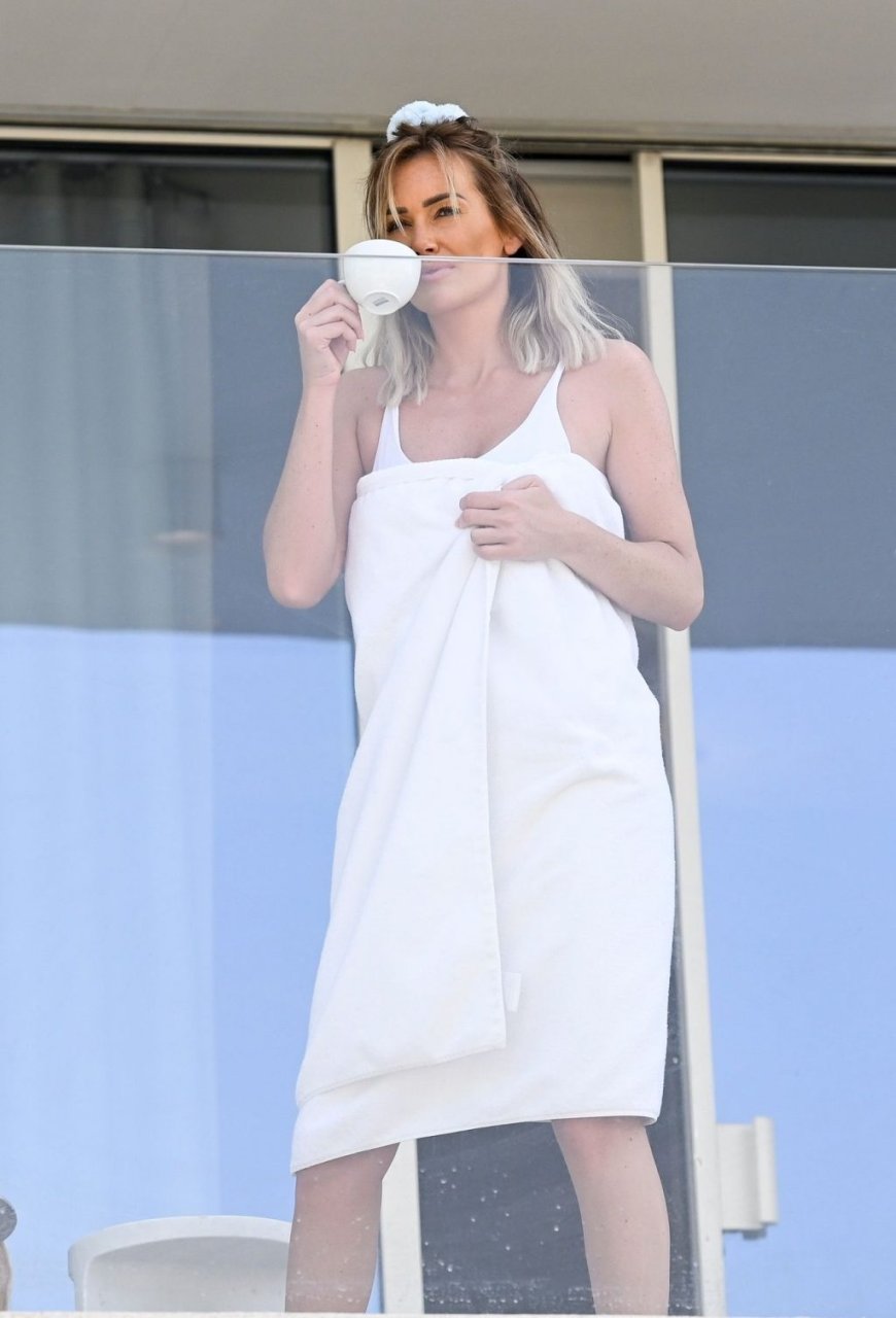 L’ex bellezza scozzese di “Love Island” Laura Anderson sotto il sole degli Emirati mentre sorseggia il suo tè sul balcone indossando un bikini sexy e avvolta nel suo asciugamano bianco durante una vacanza a Dubai, 07/02/2019.