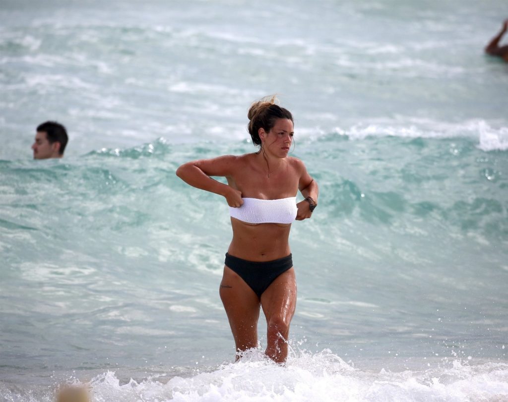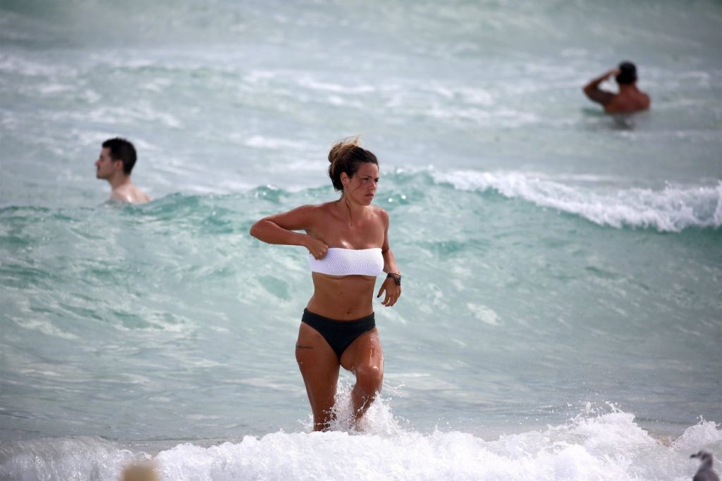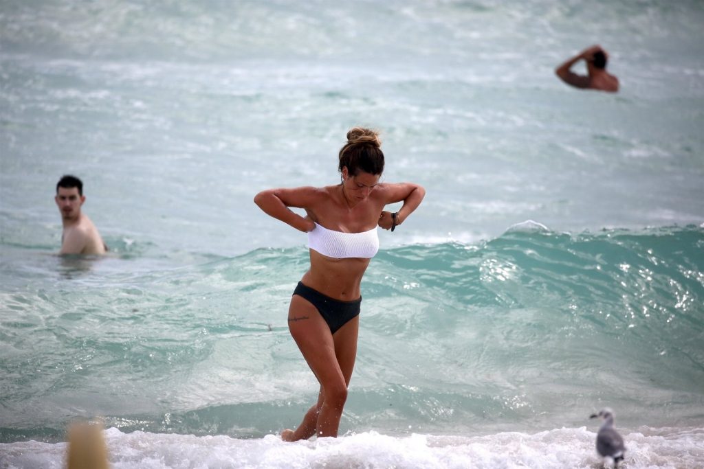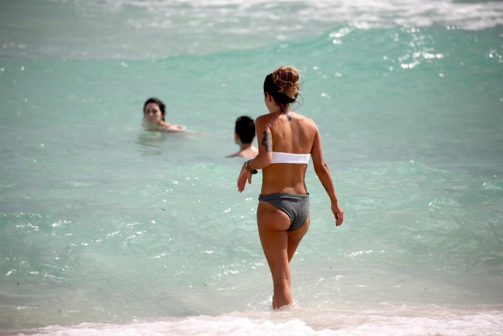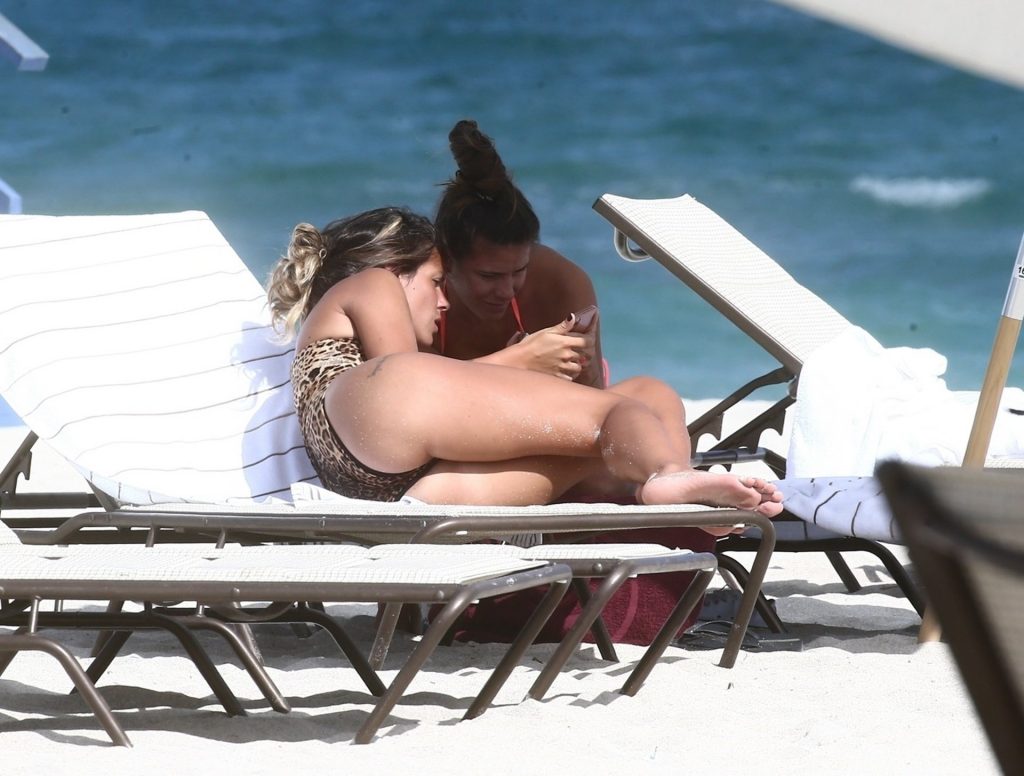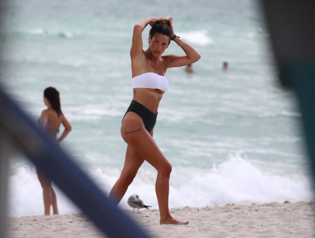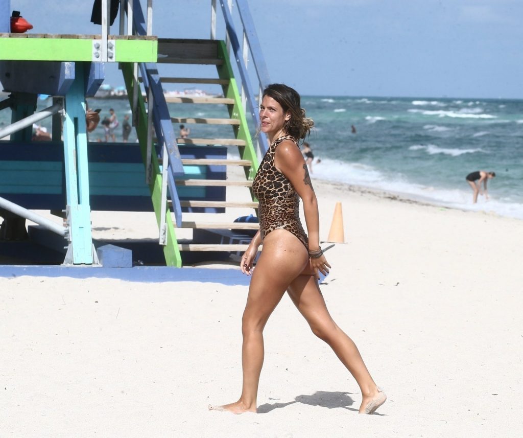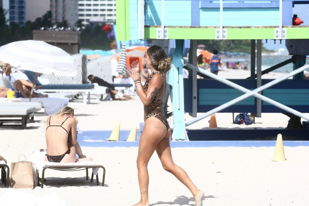 L’influencer spagnola Laura Matamoros illumina Miami Beach! La star dei social media ha sfoggiato la sua figura in un costume intero a stampa leopardata, prima di cambiarsi in un top a fascia bianco e slip bikini grigi, 16/12/2019.