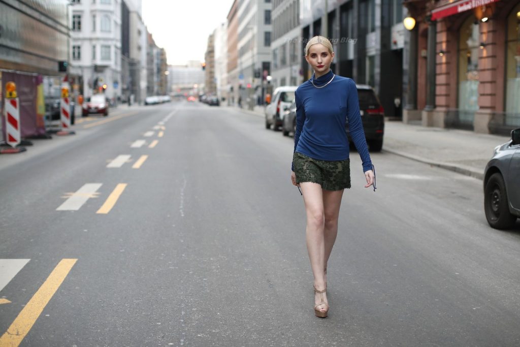 La modella tedesca Anna Hiltrop è ritratta mentre indossa un dolcevita a maniche lunghe blu scuro, pantaloncini verde scuro con paillettes e tacchi alti nudi durante uno shooting di street style alla Mercedes-Benz Fashion Week di Berlino a gennaio 2021, il 17 gennaio 2021.