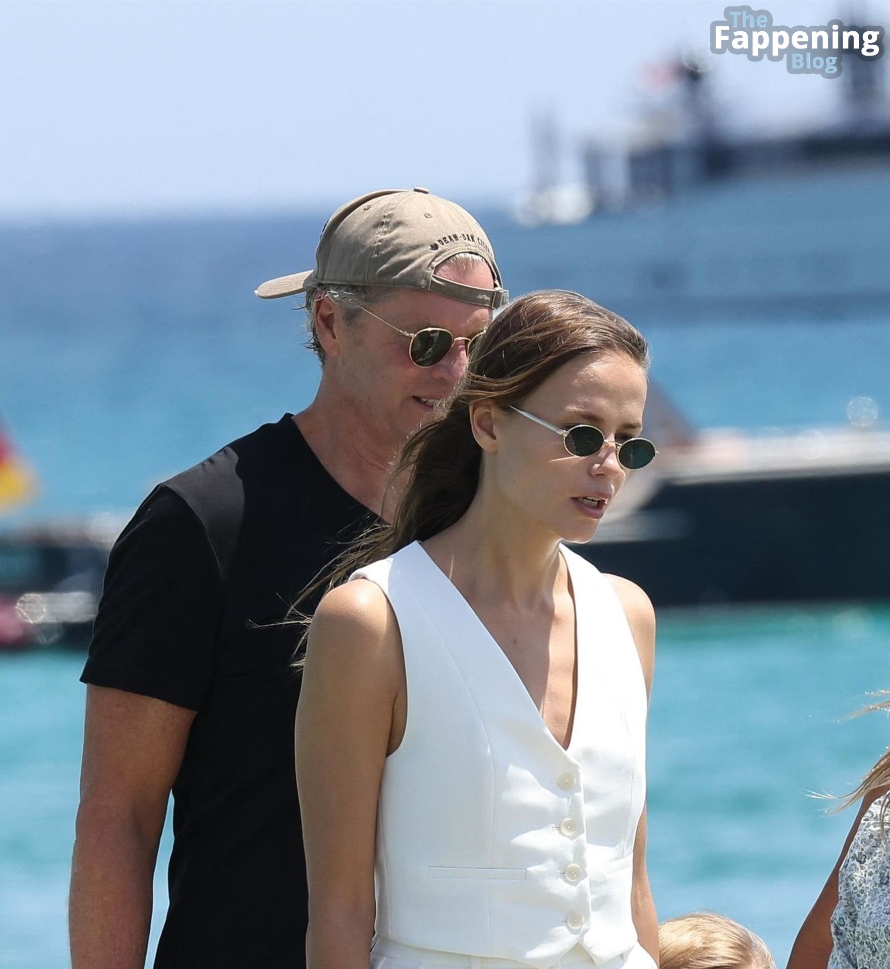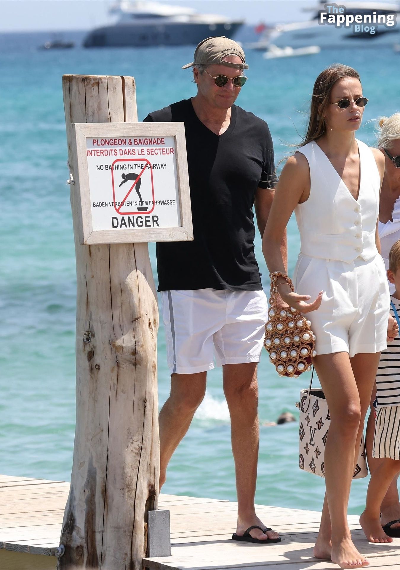 La modella russa Natasha Poly, suo marito Peter Bakker e i loro figli, Adrian Gray e Aleksandra, arrivano sul pontile del Club 55 a Saint-Tropez, 22/07/2023.