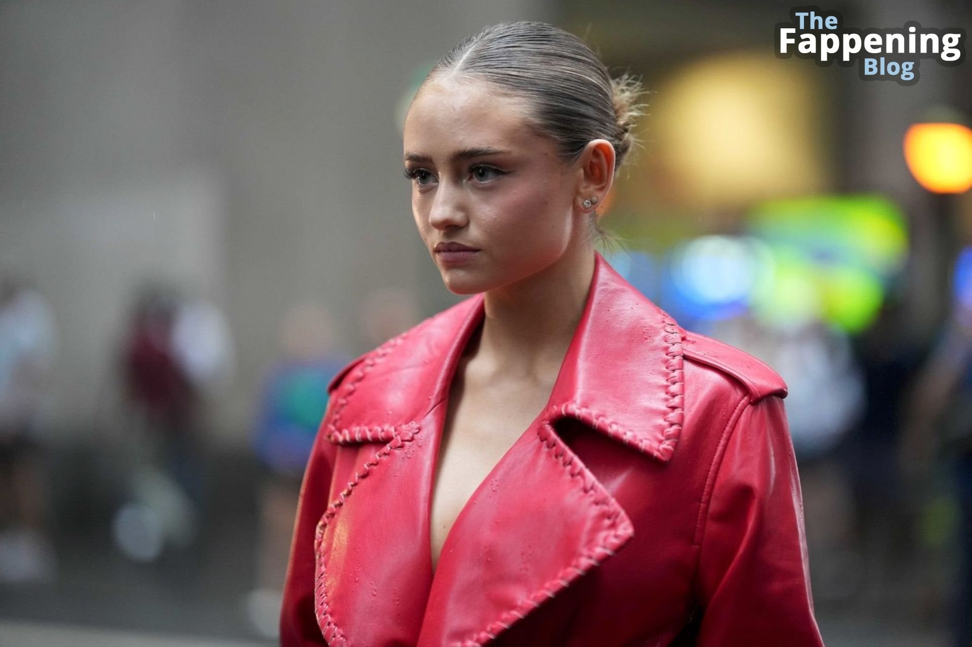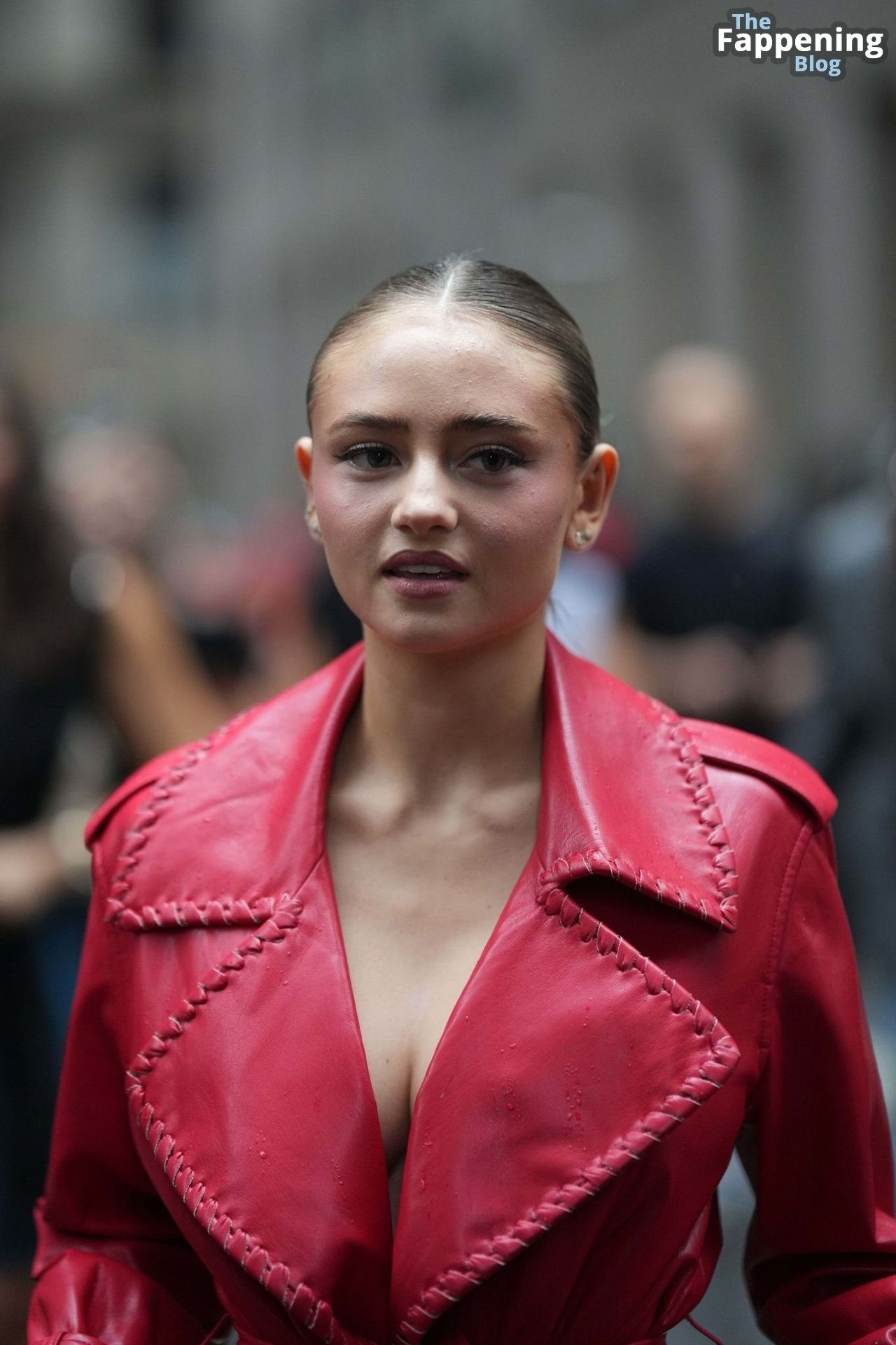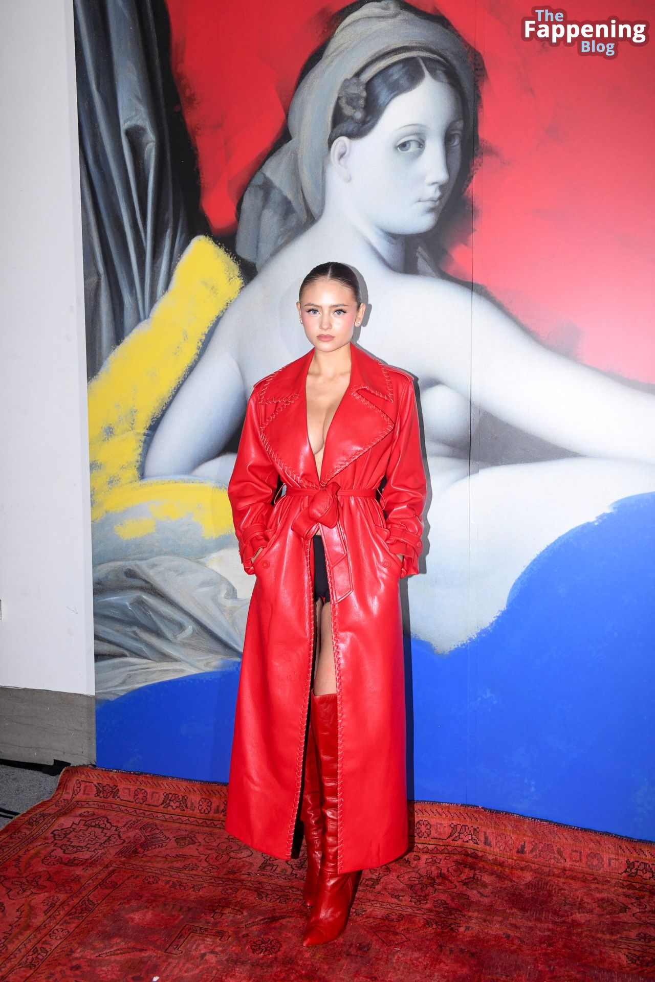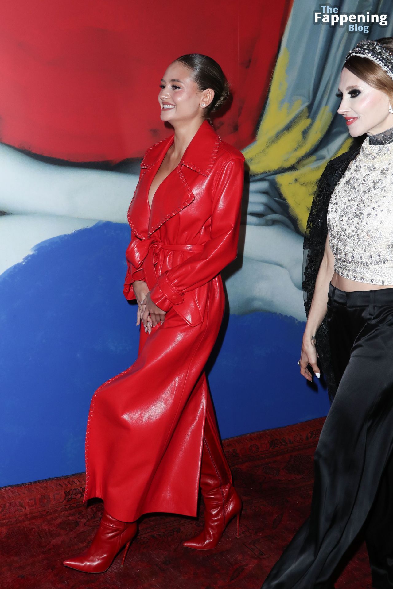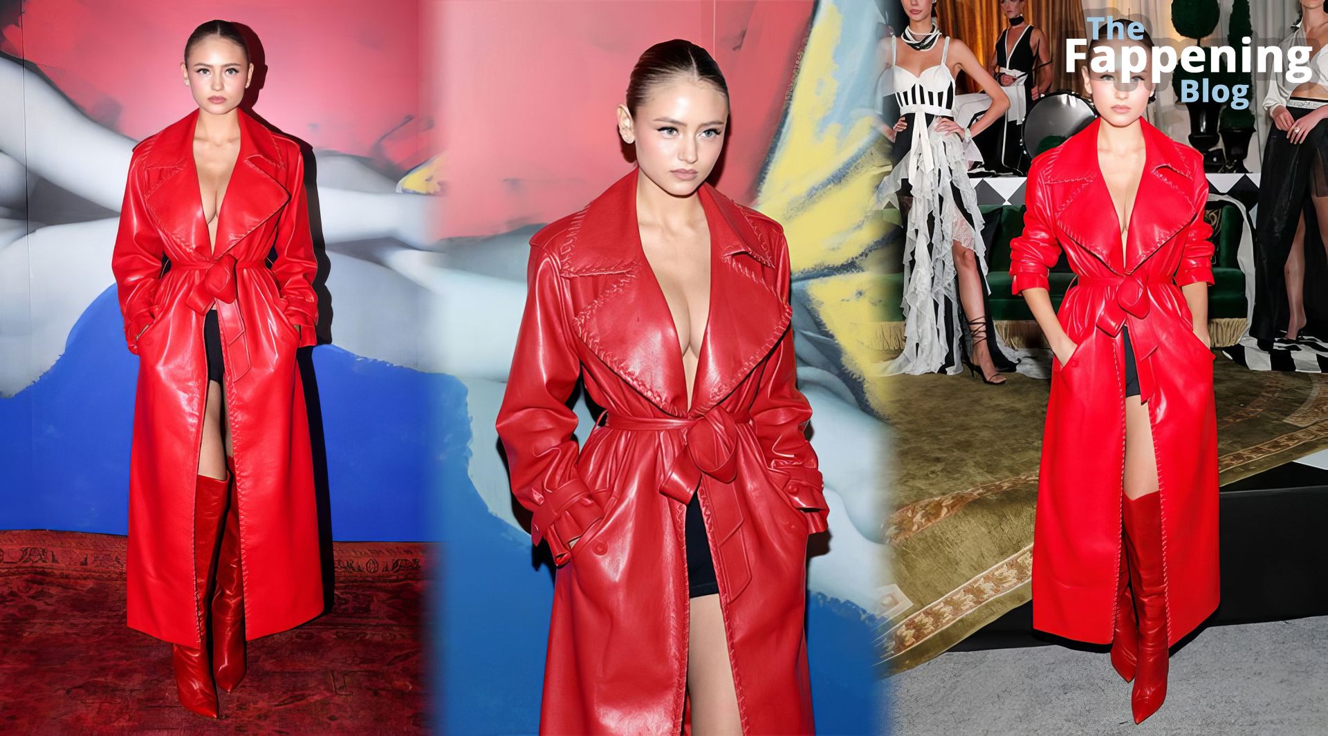 Preparati a testimoniare il fascino scandaloso della giovane bellezza mentre sfoggia un completo in pelle rossa, mostrando il suo audace décolleté.