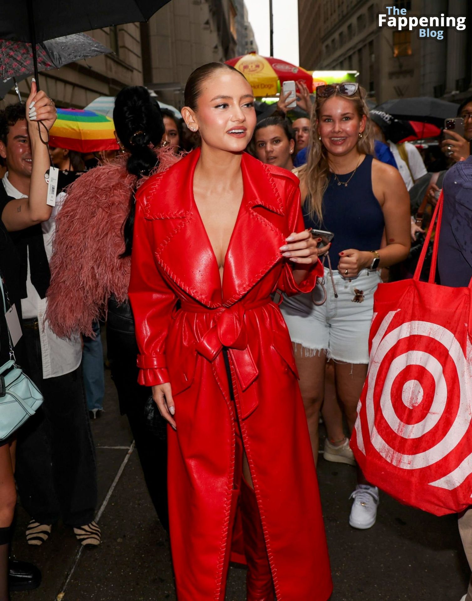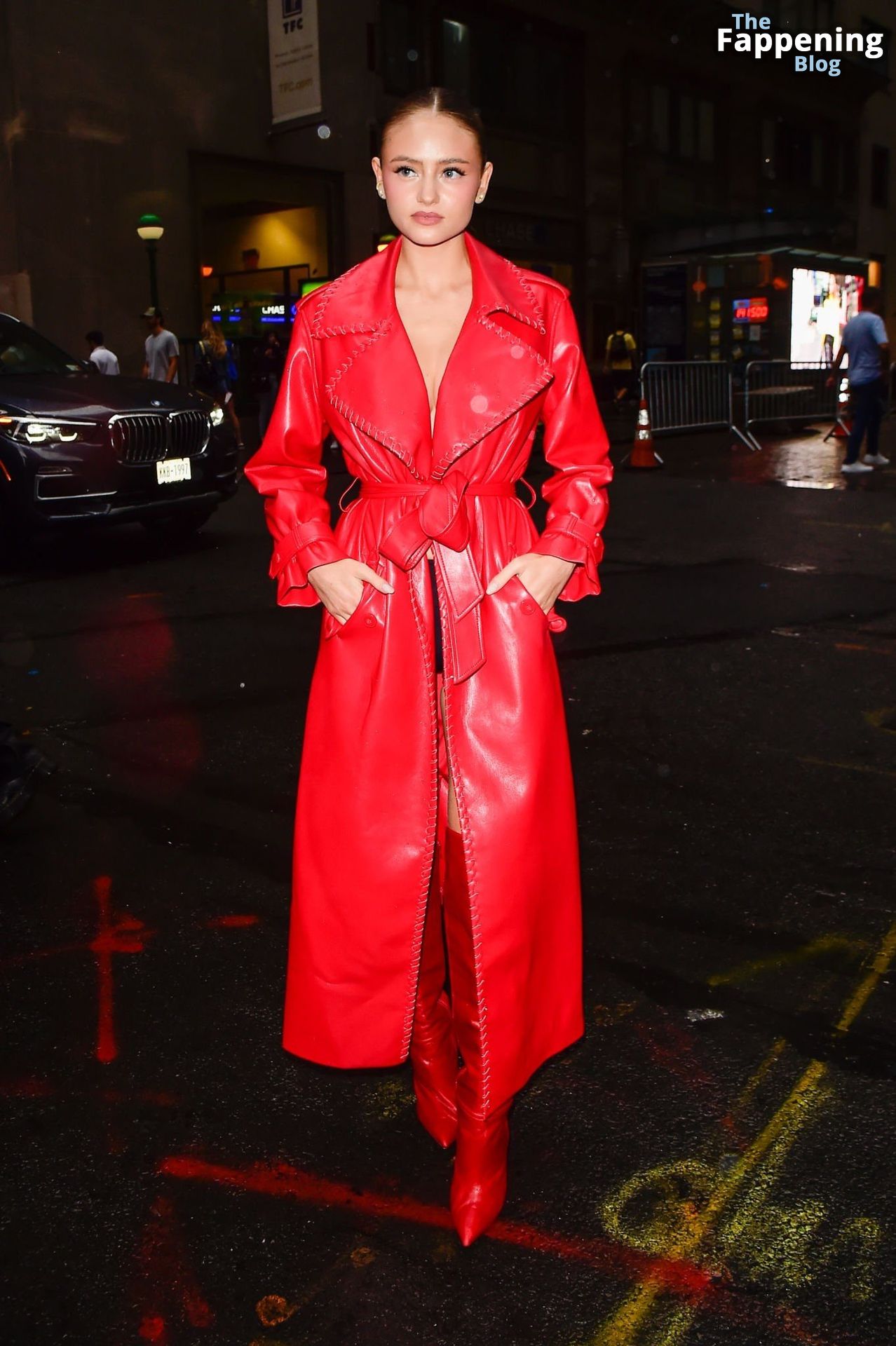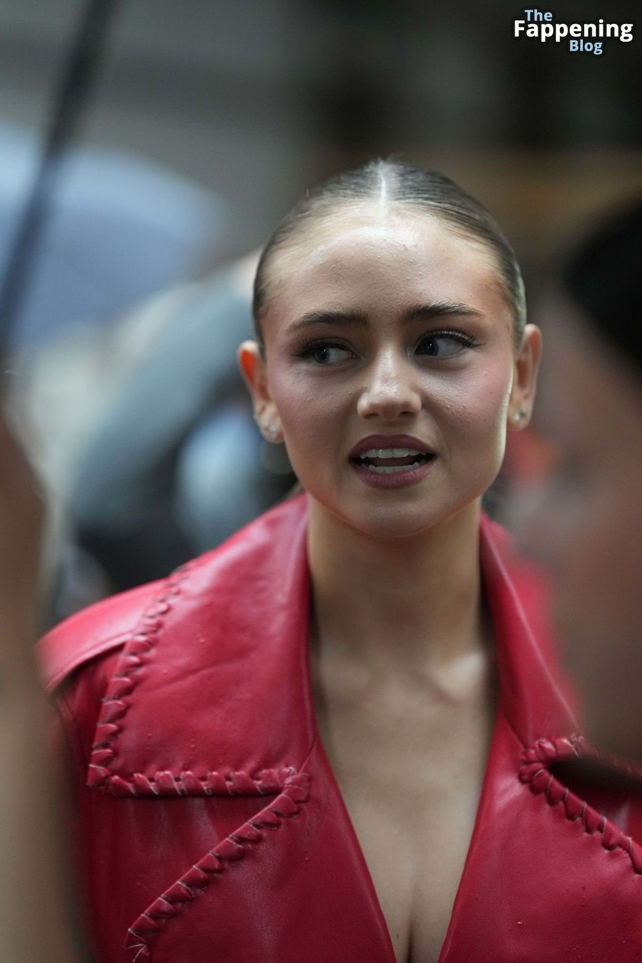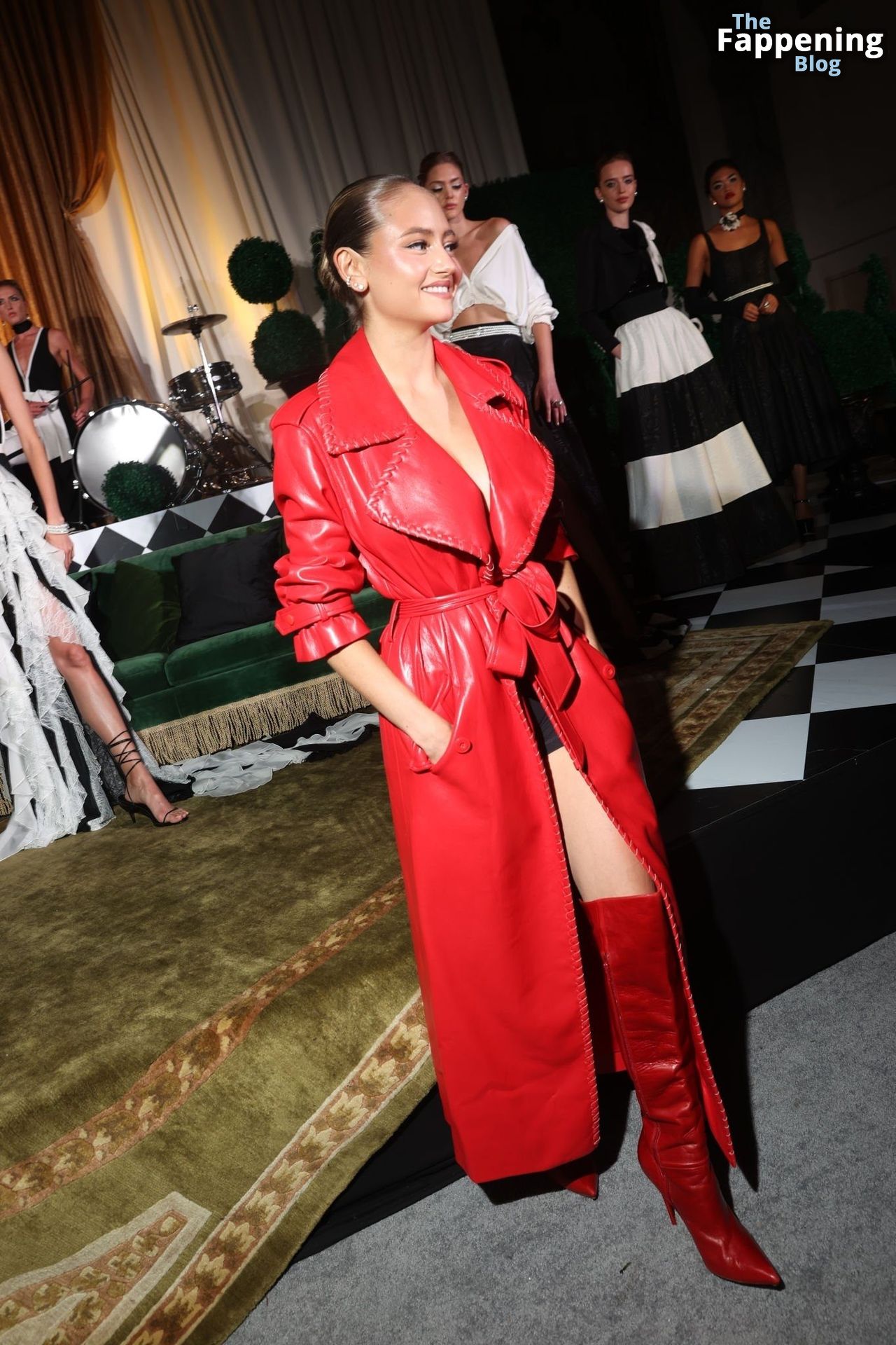 Preparati a testimoniare il fascino scandaloso della giovane bellezza mentre sfoggia un completo in pelle rossa, mostrando il suo audace décolleté.