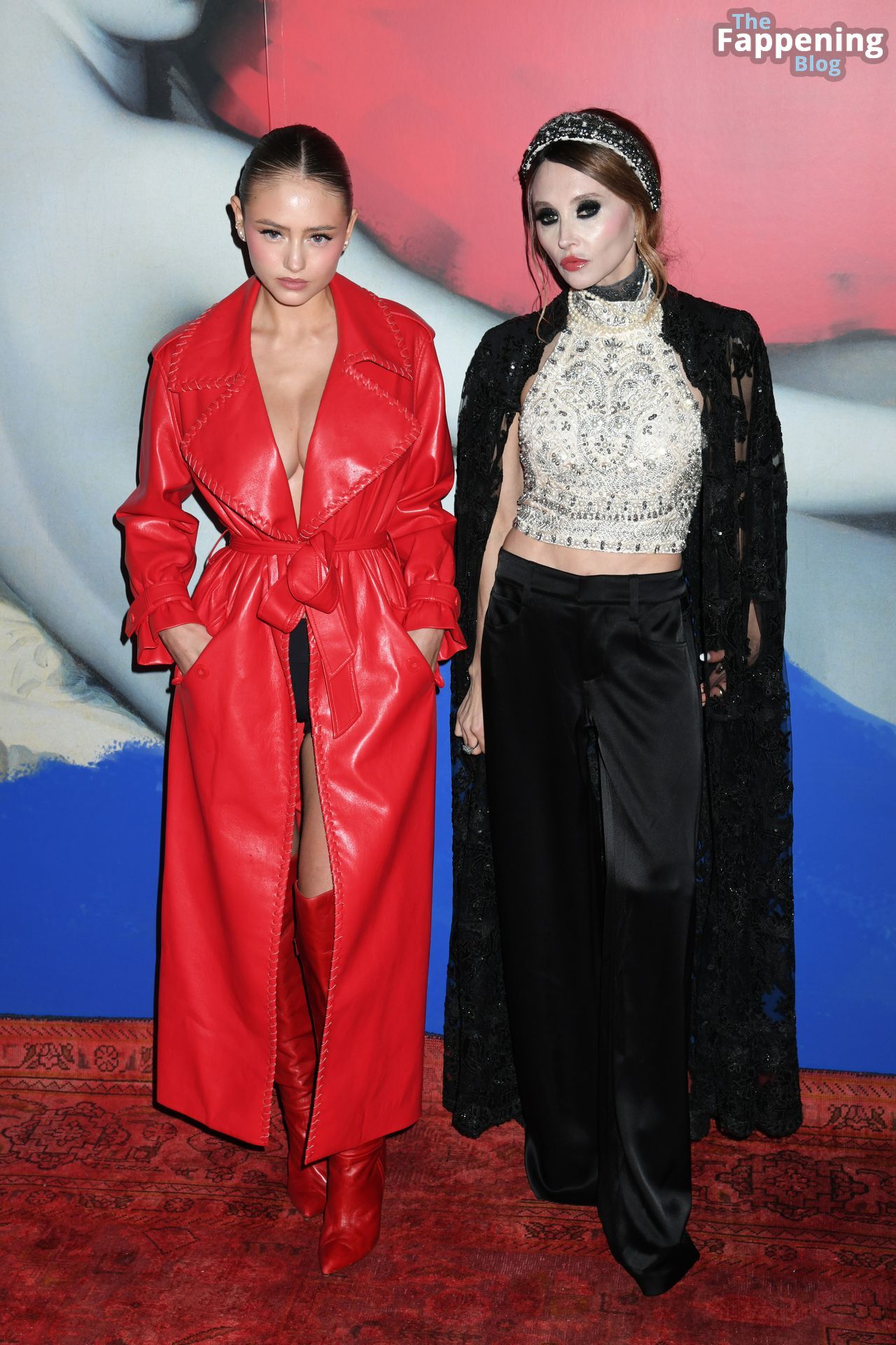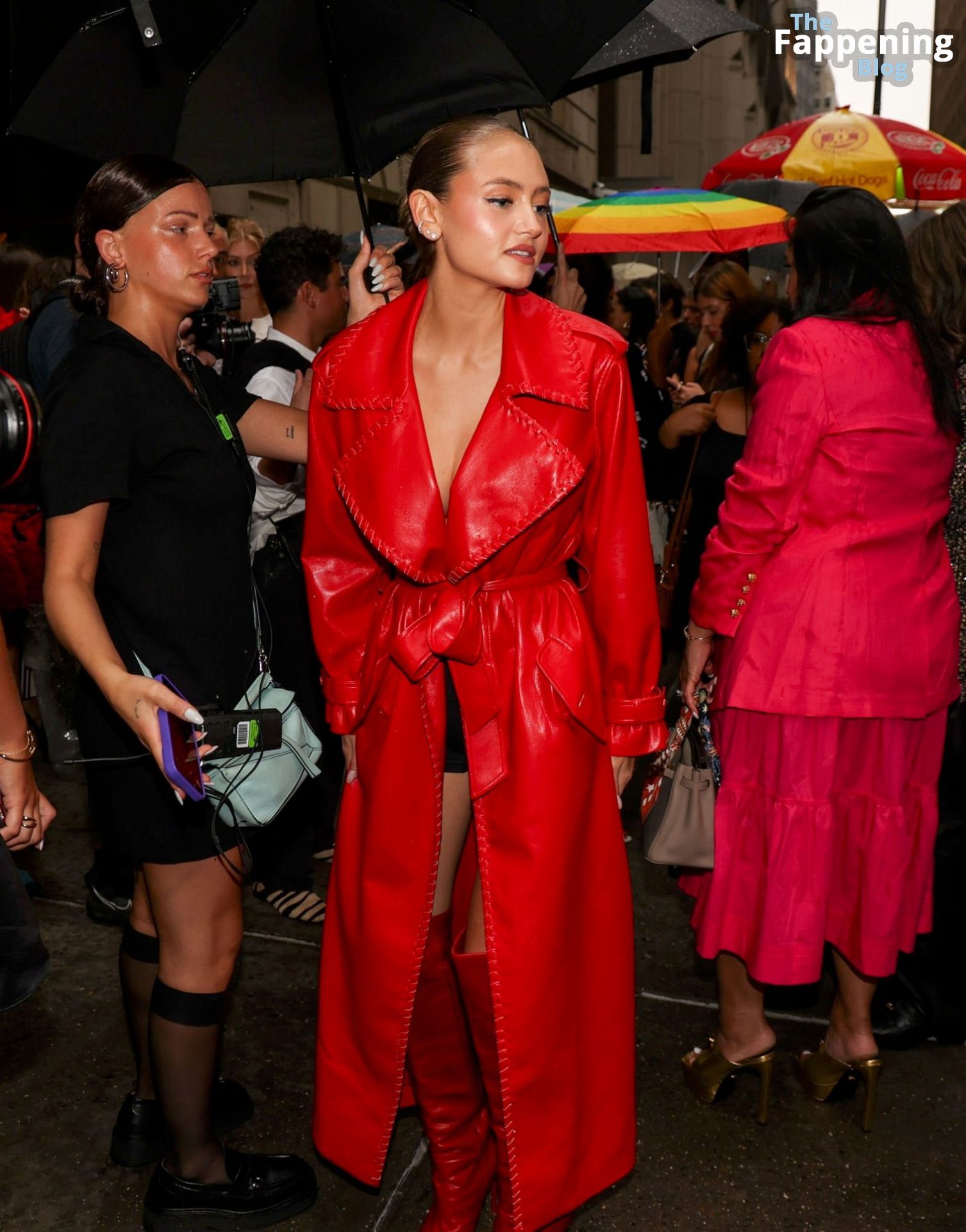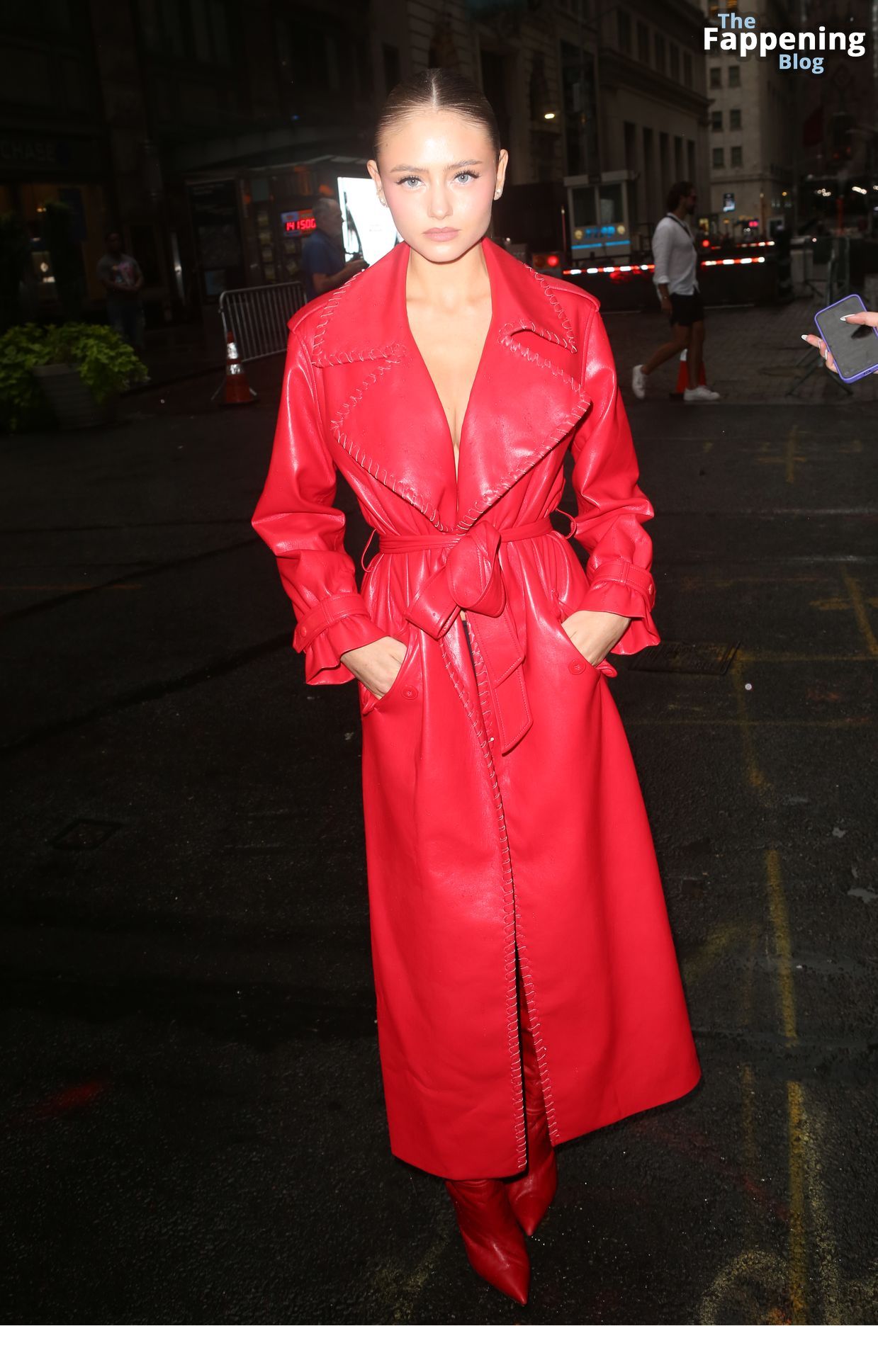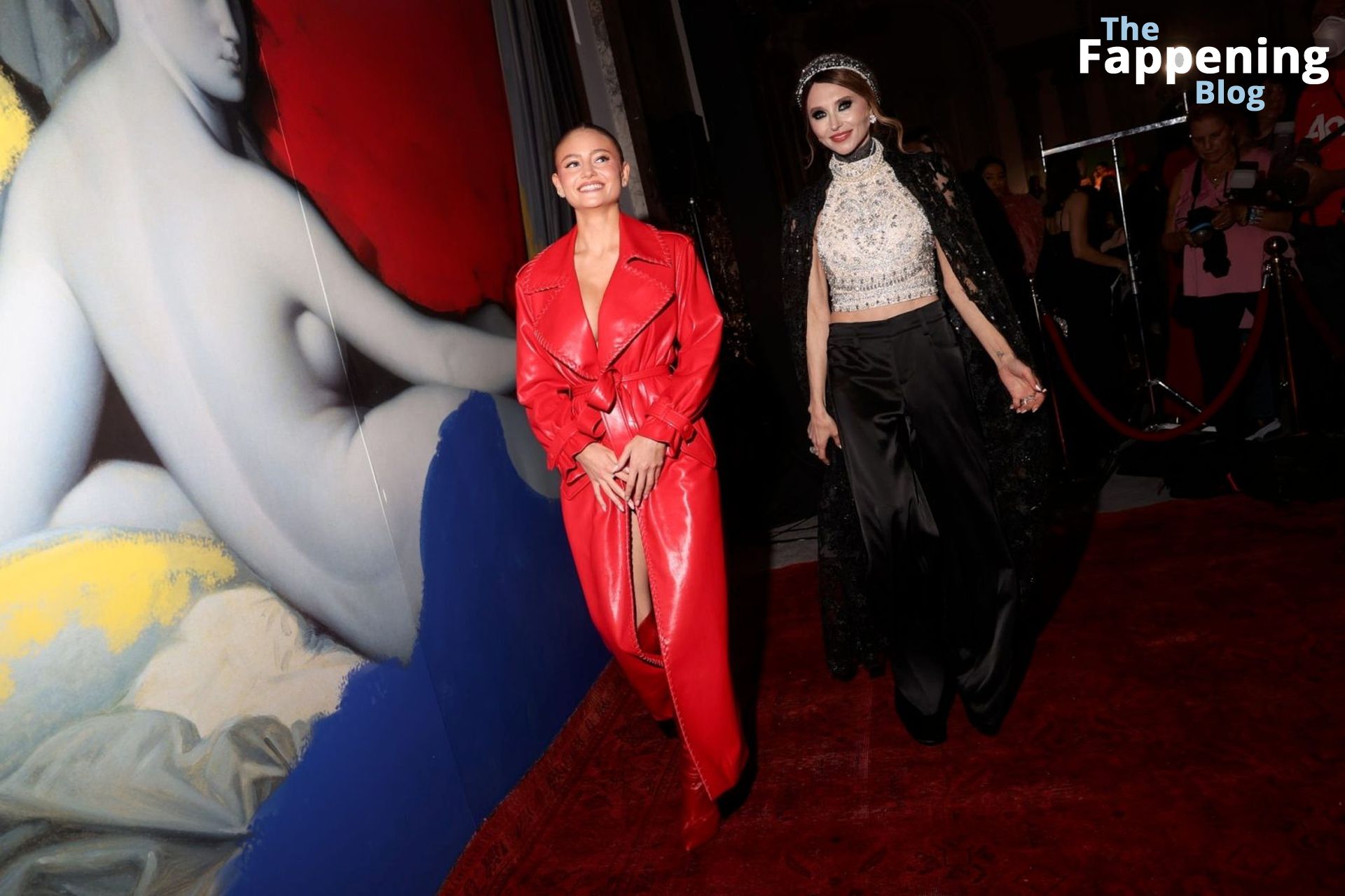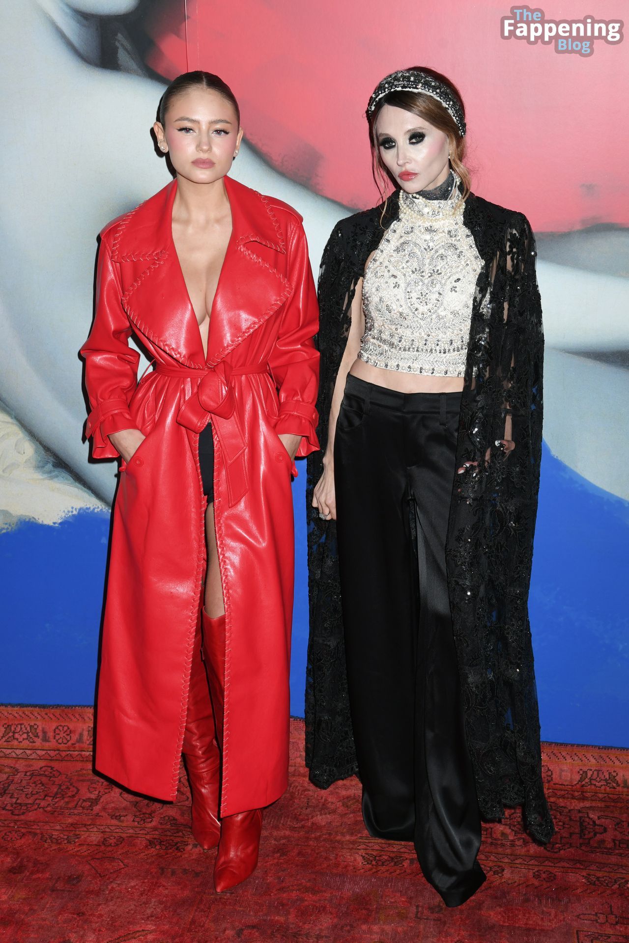 Preparati a testimoniare il fascino scandaloso della giovane bellezza mentre sfoggia un completo in pelle rossa, mostrando il suo audace décolleté.