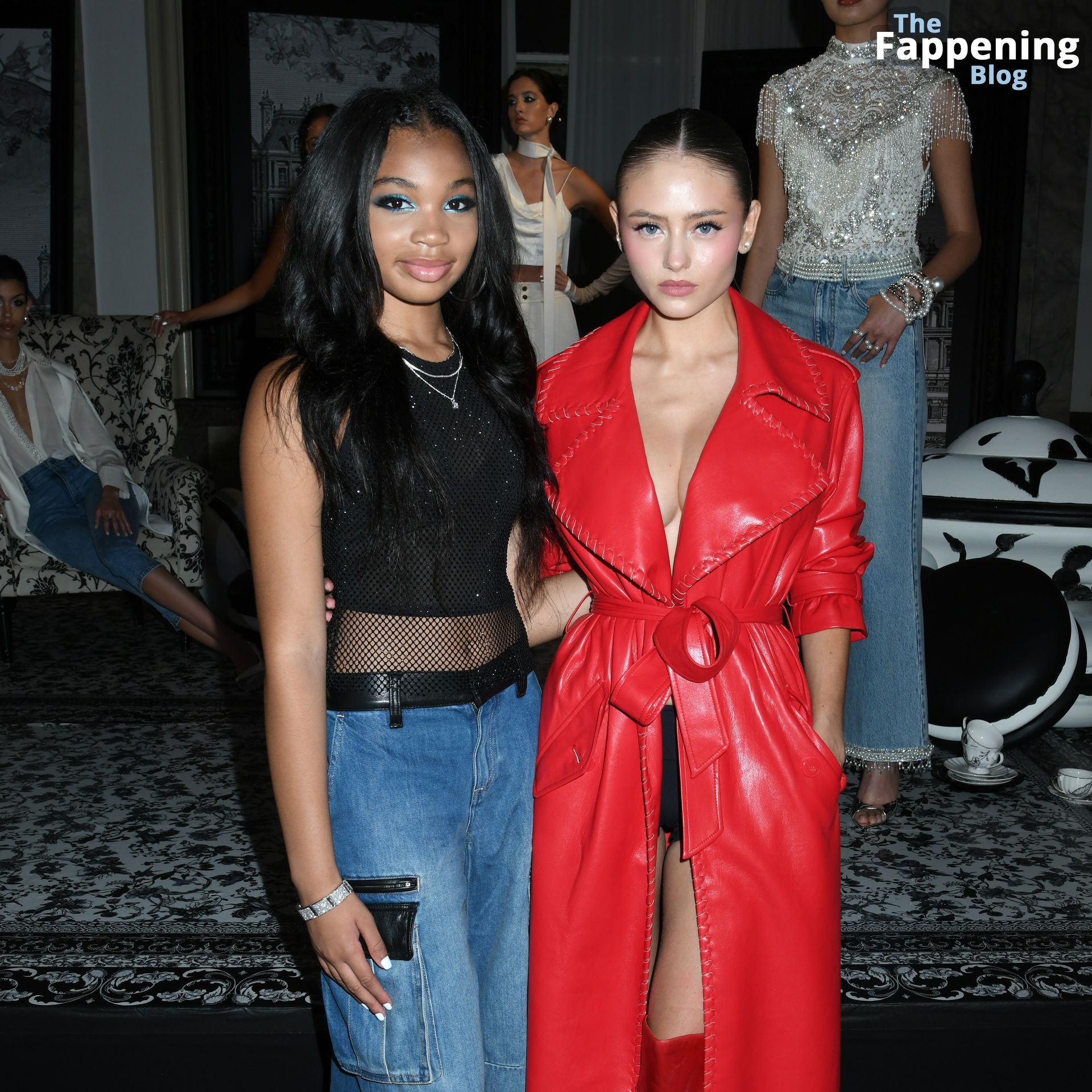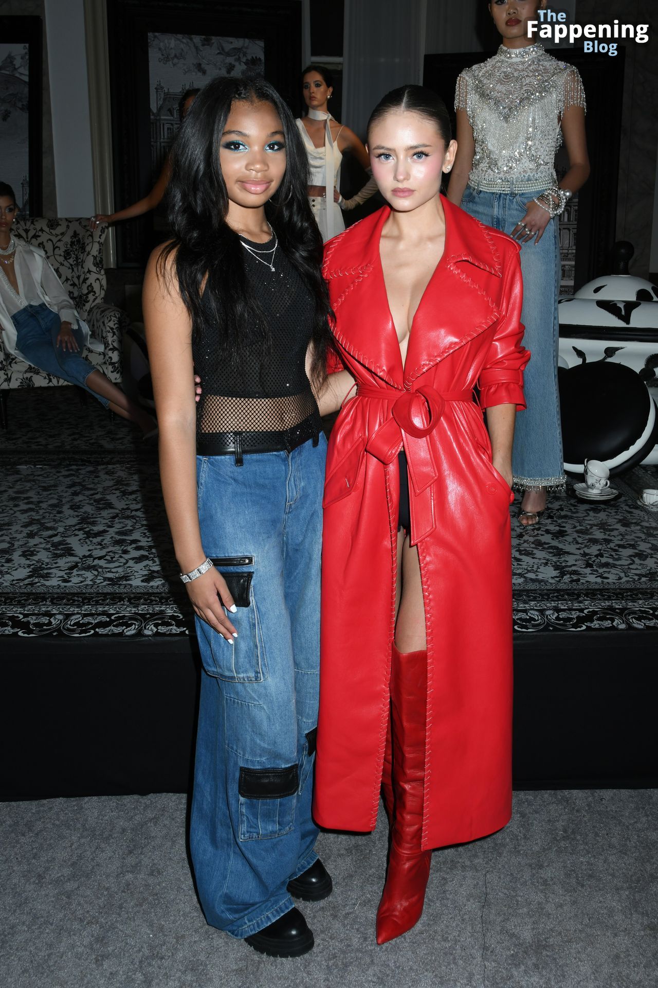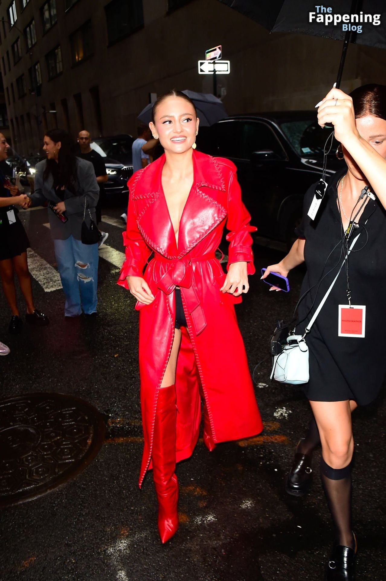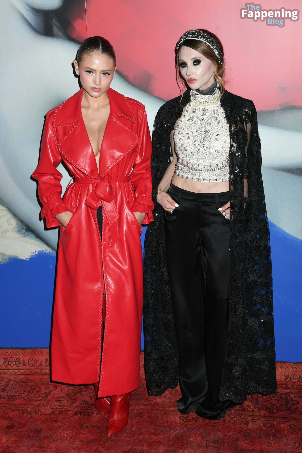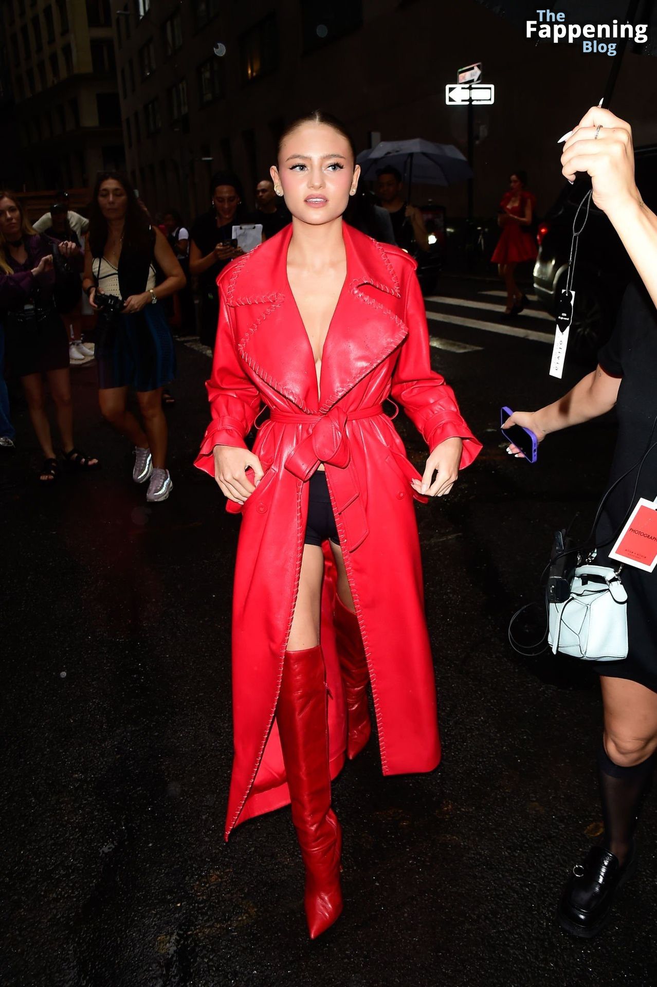 Preparati a testimoniare il fascino scandaloso della giovane bellezza mentre sfoggia un completo in pelle rossa, mostrando il suo audace décolleté.