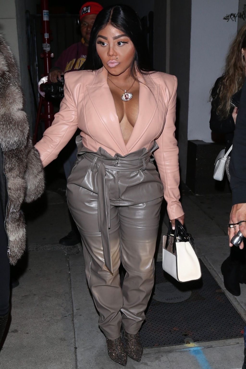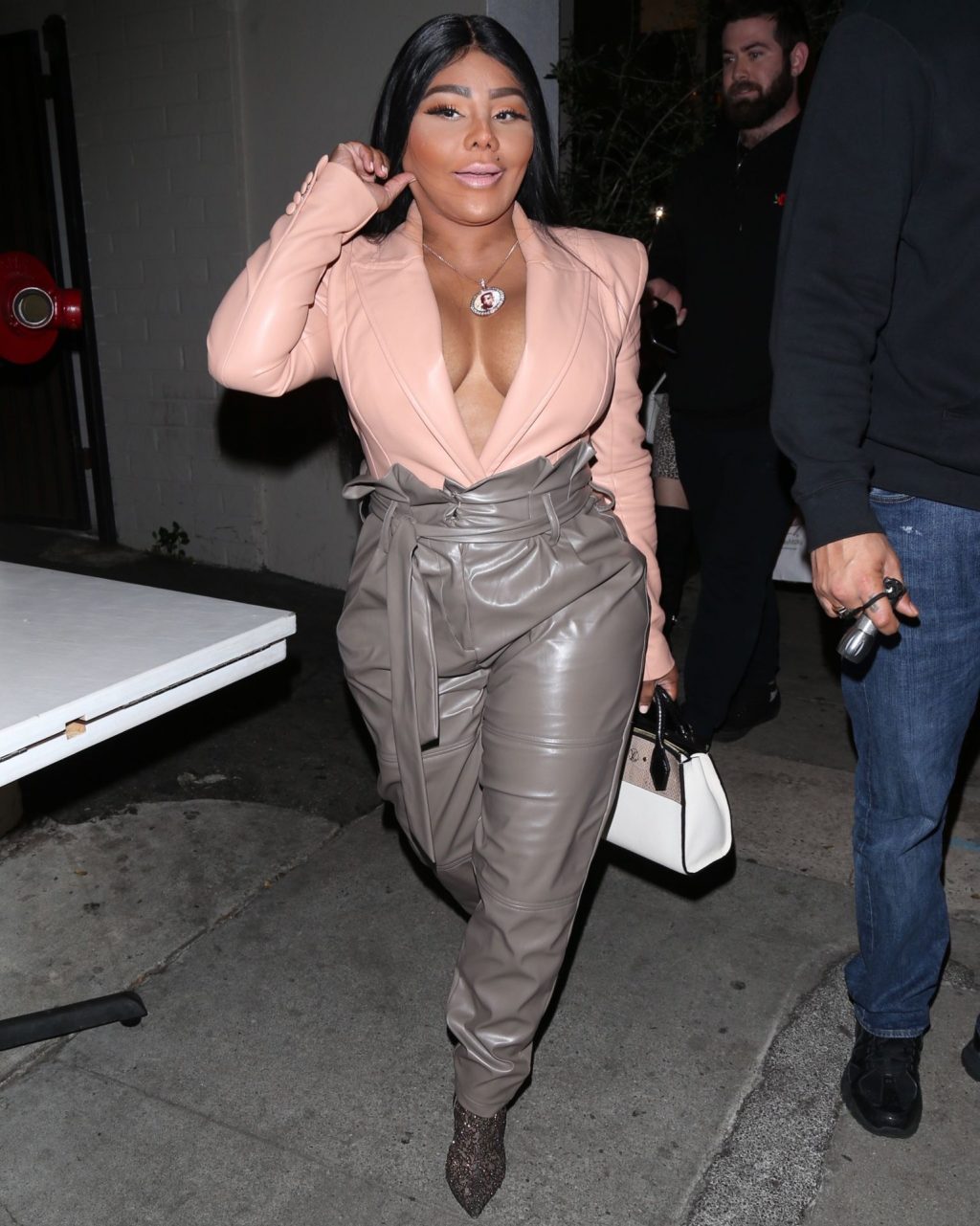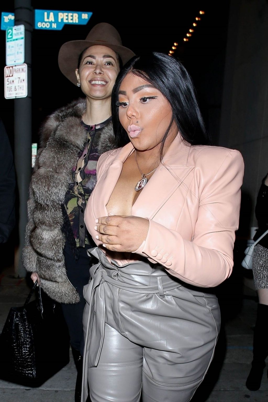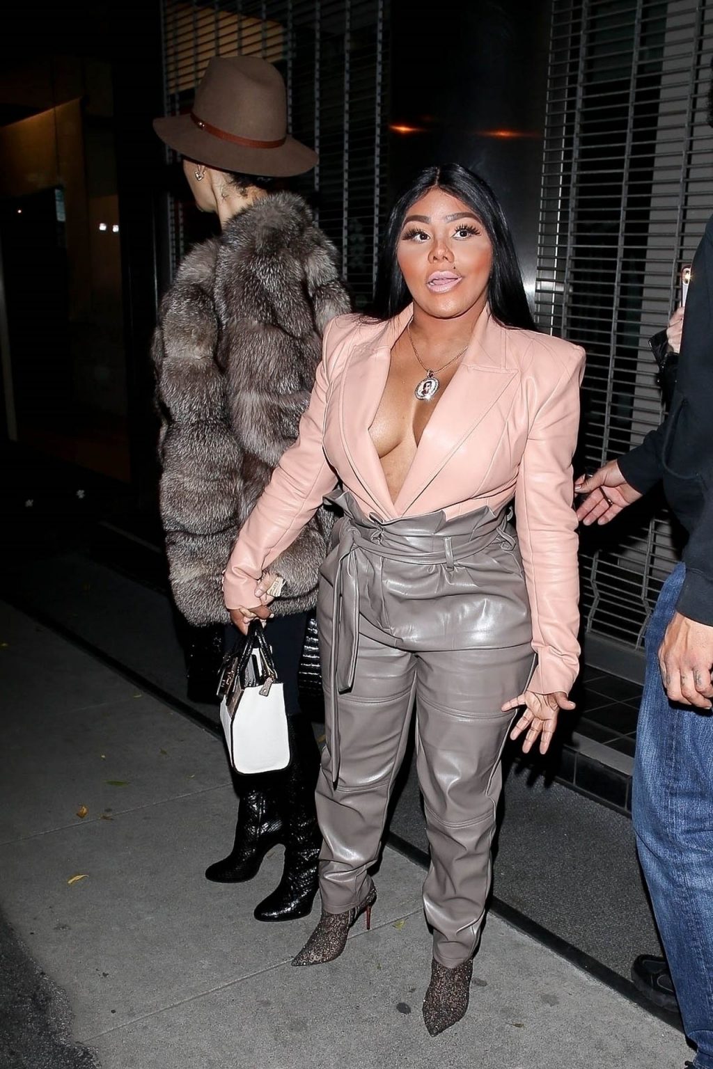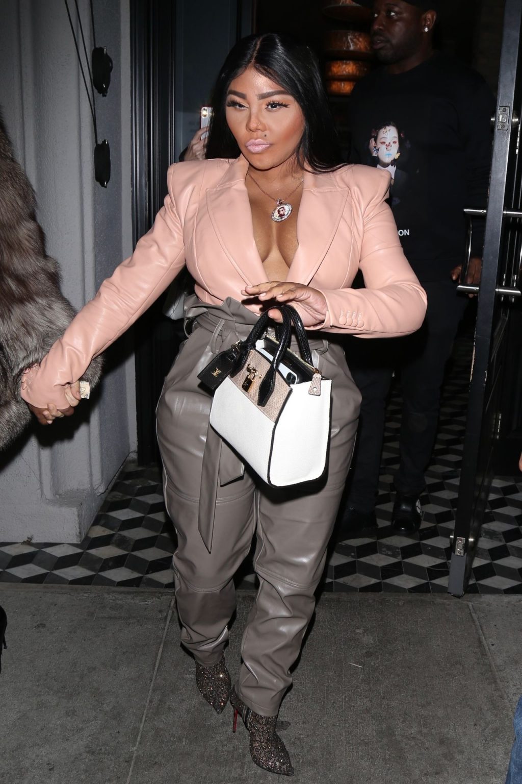La rapper Lil’ Kim mostra il suo décolleté mentre viene vista uscire da cena con un’amica al ristorante Craig’s a West Hollywood, 27/02/2020. È alla moda con un top rosa rosa, pantaloni in pelle grigia e tacchi neri scintillanti di Louboutin.