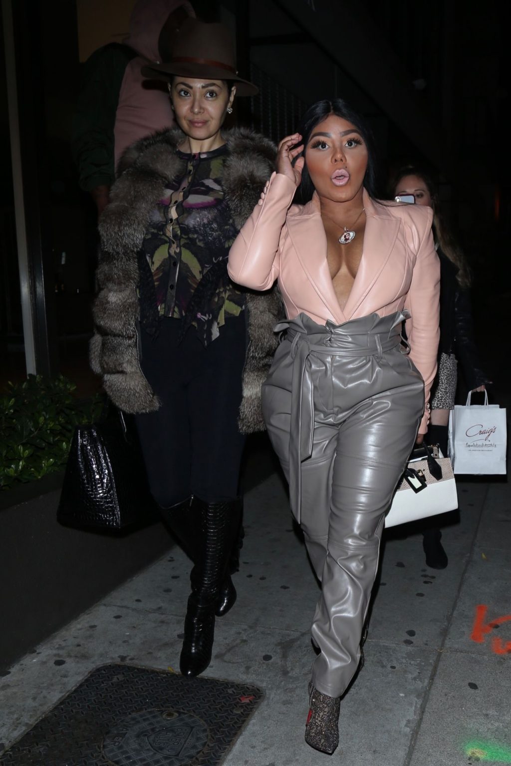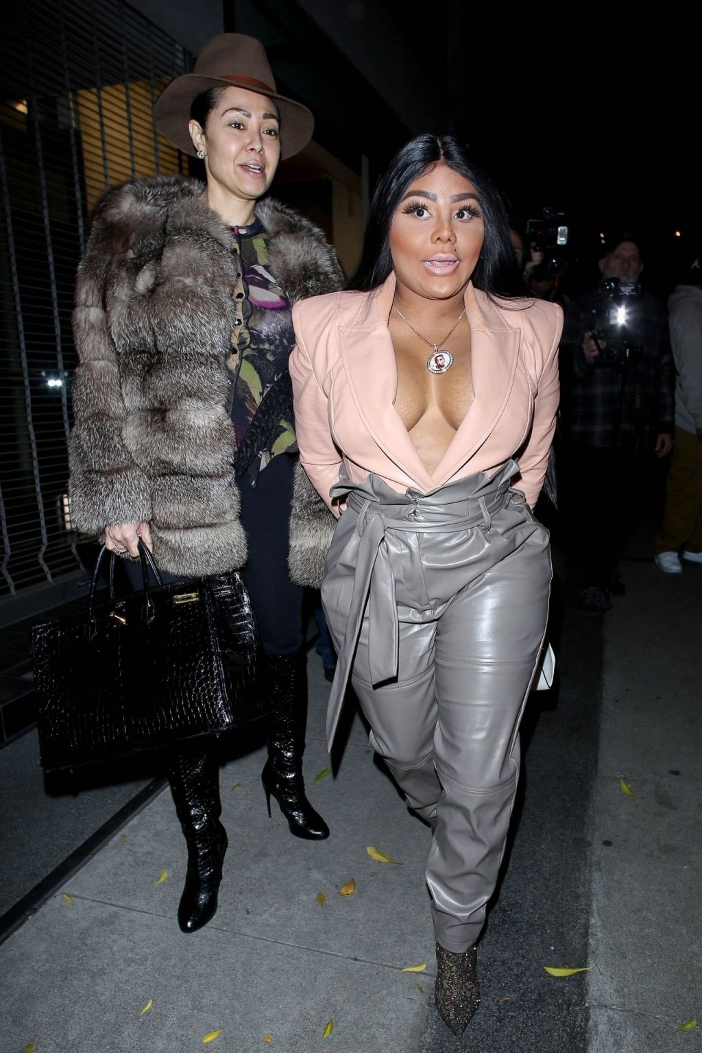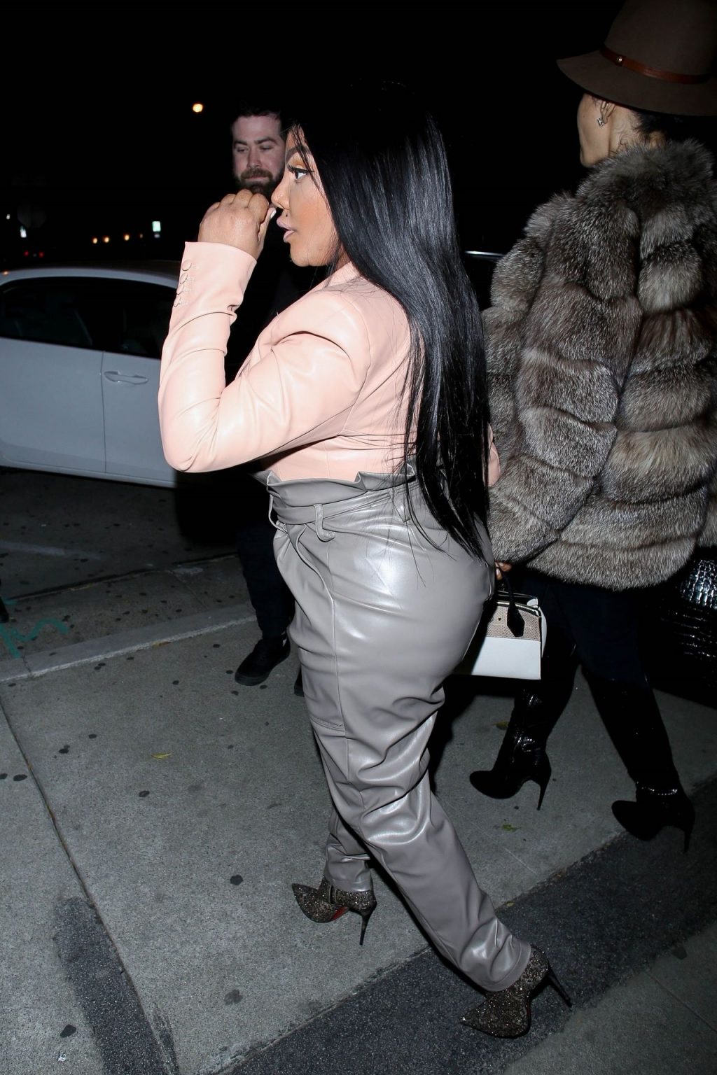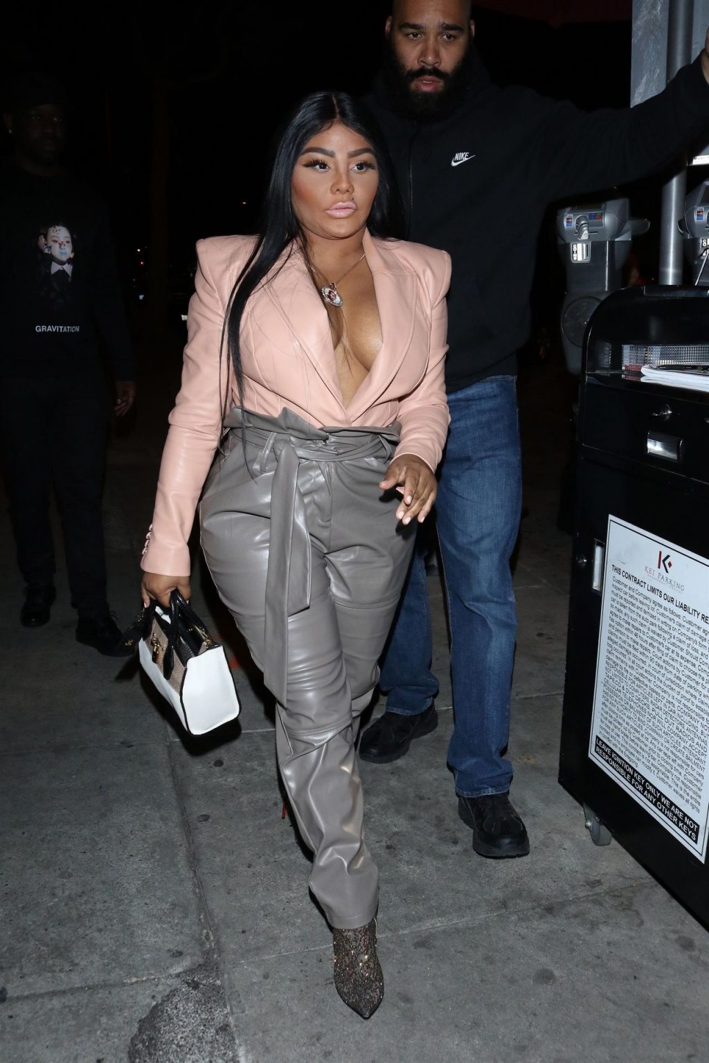 La rapper Lil’ Kim mostra il suo décolleté mentre viene vista uscire da cena con un’amica al ristorante Craig’s a West Hollywood, 27/02/2020. È alla moda con un top rosa rosa, pantaloni in pelle grigia e tacchi neri scintillanti di Louboutin.