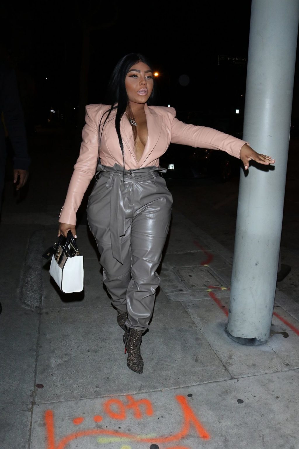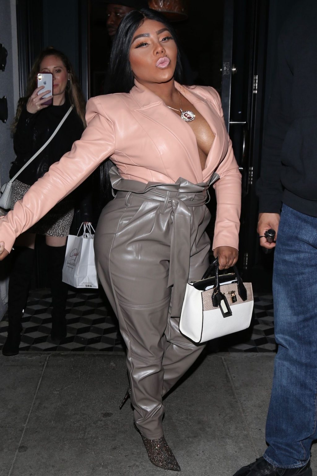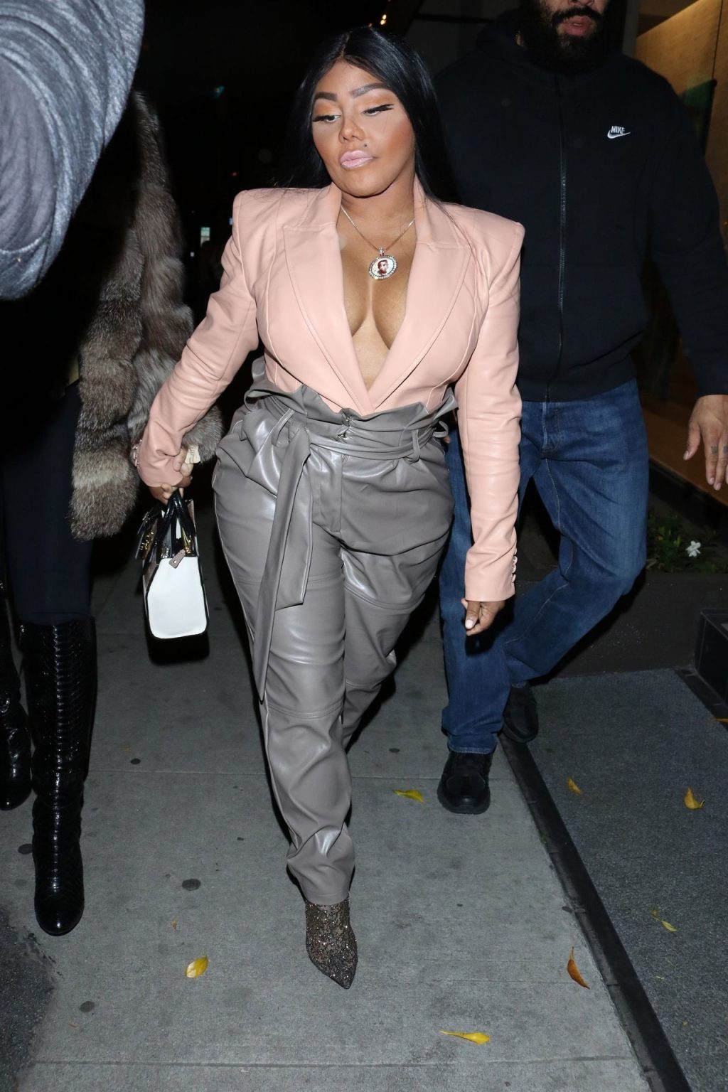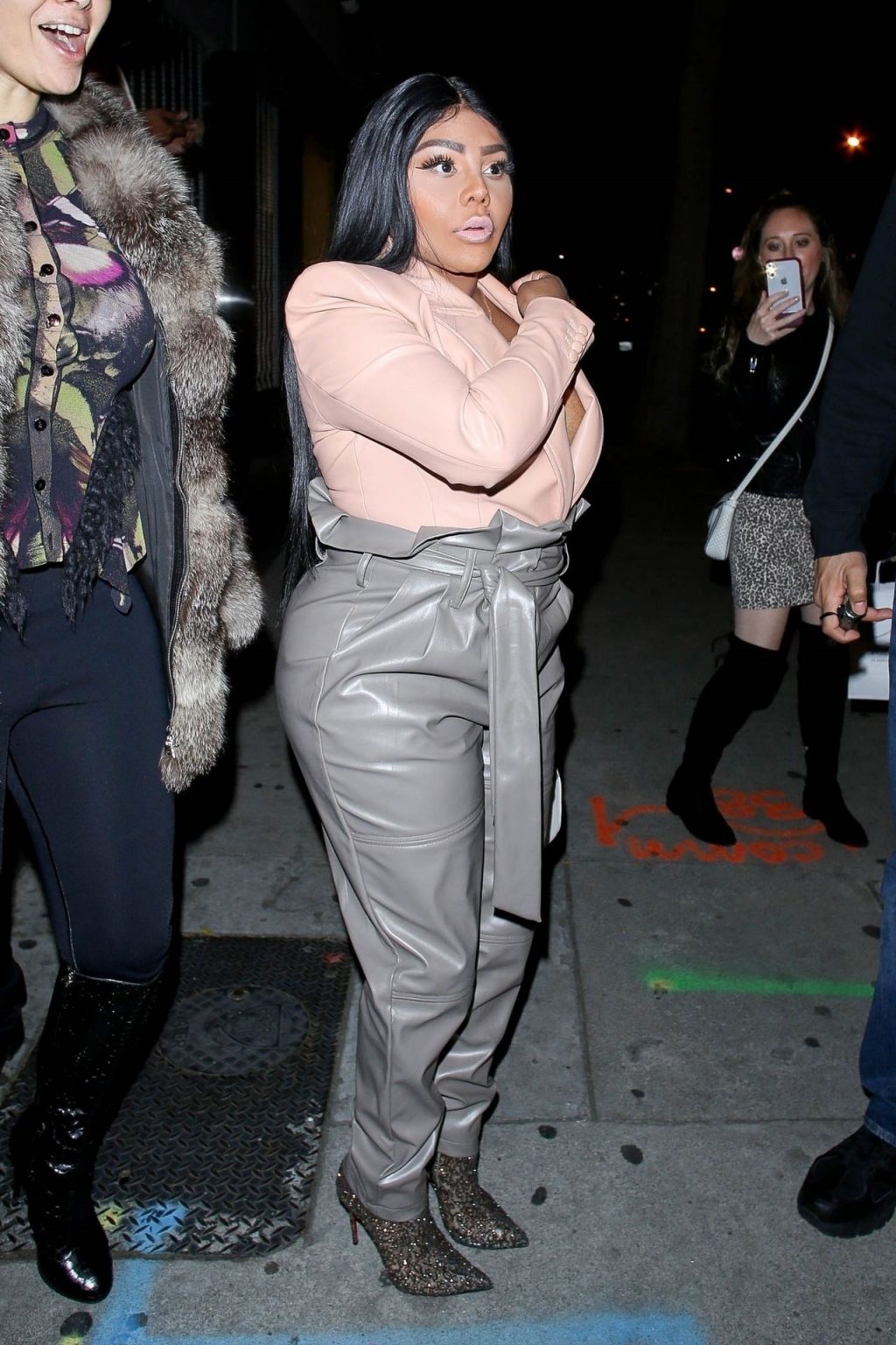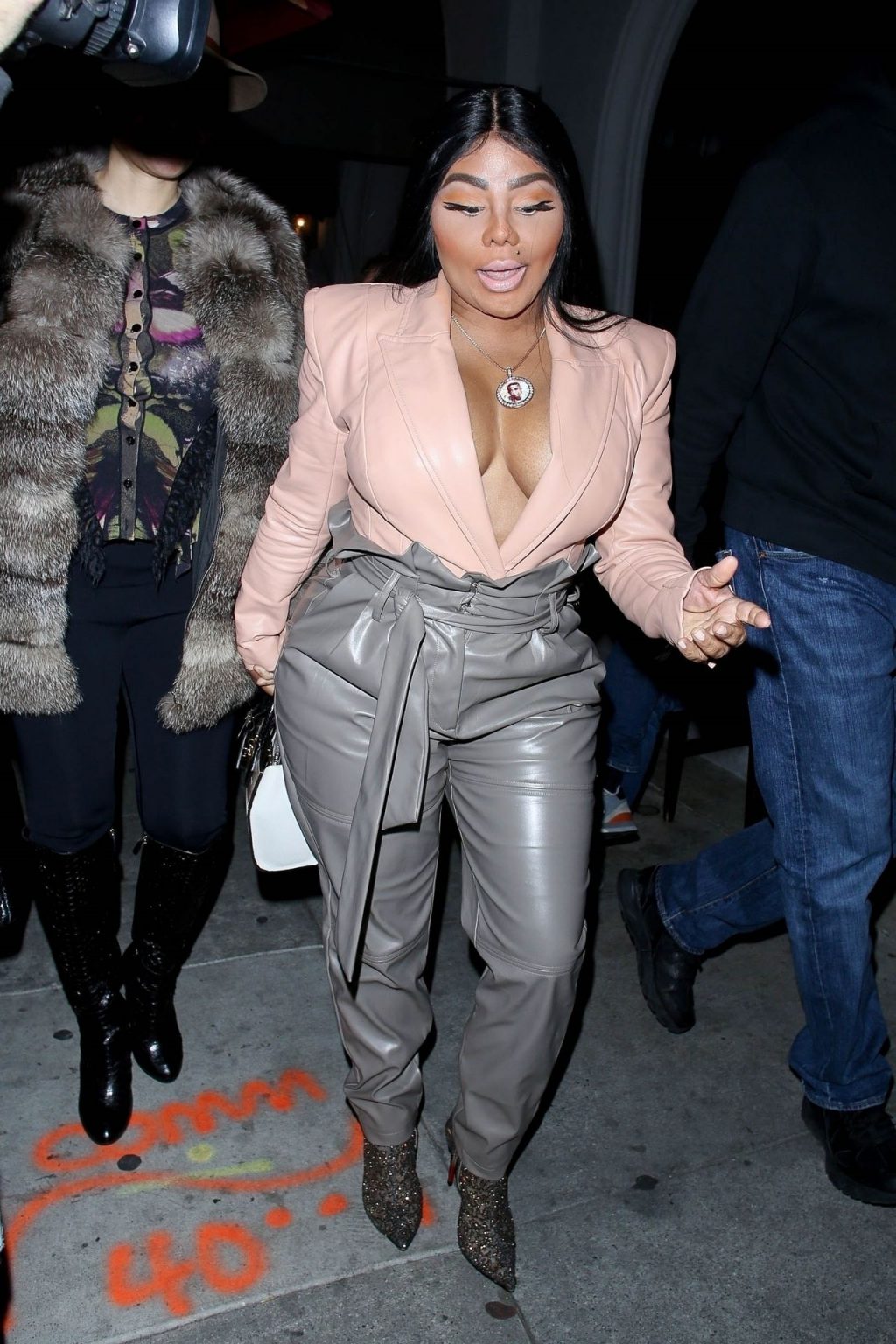 La rapper Lil’ Kim mostra il suo décolleté mentre viene vista uscire da cena con un’amica al ristorante Craig’s a West Hollywood, 27/02/2020. È alla moda con un top rosa rosa, pantaloni in pelle grigia e tacchi neri scintillanti di Louboutin.