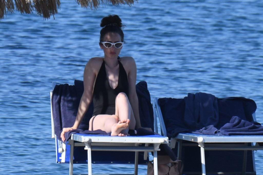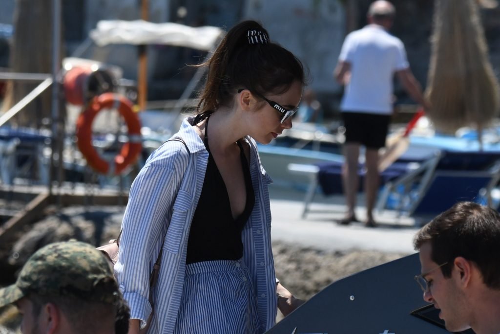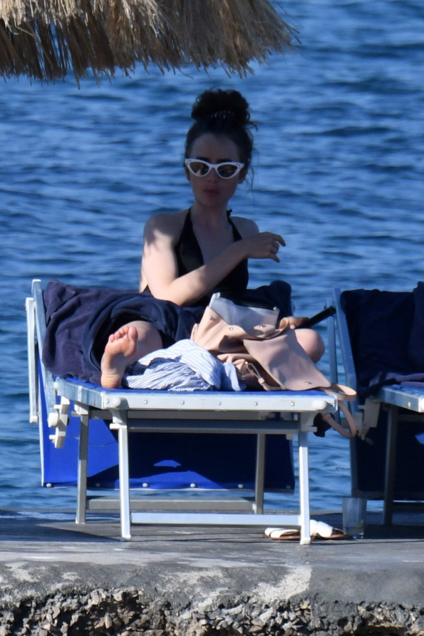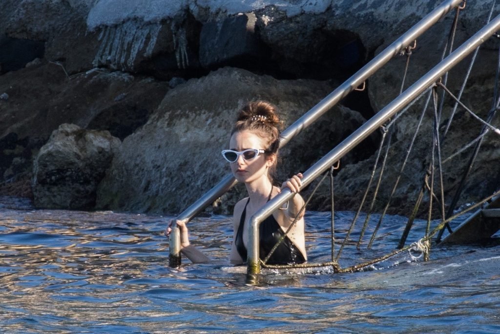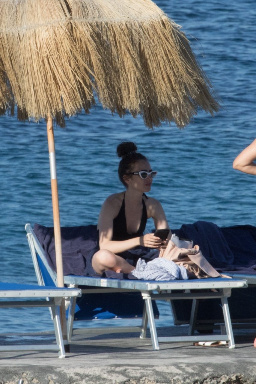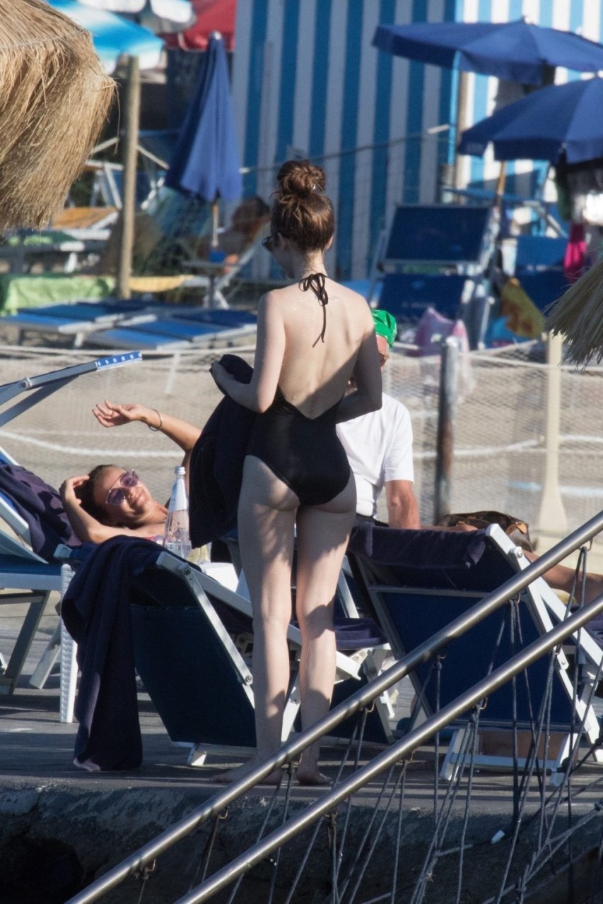 Lily Collins è stata avvistata in vacanza a Ischia, ha fatto il bagno nel mare con un costume da bagno nero. 18/07/2018.