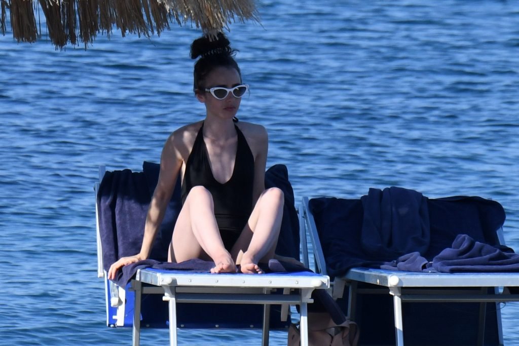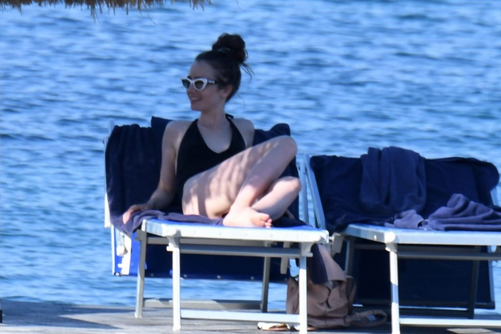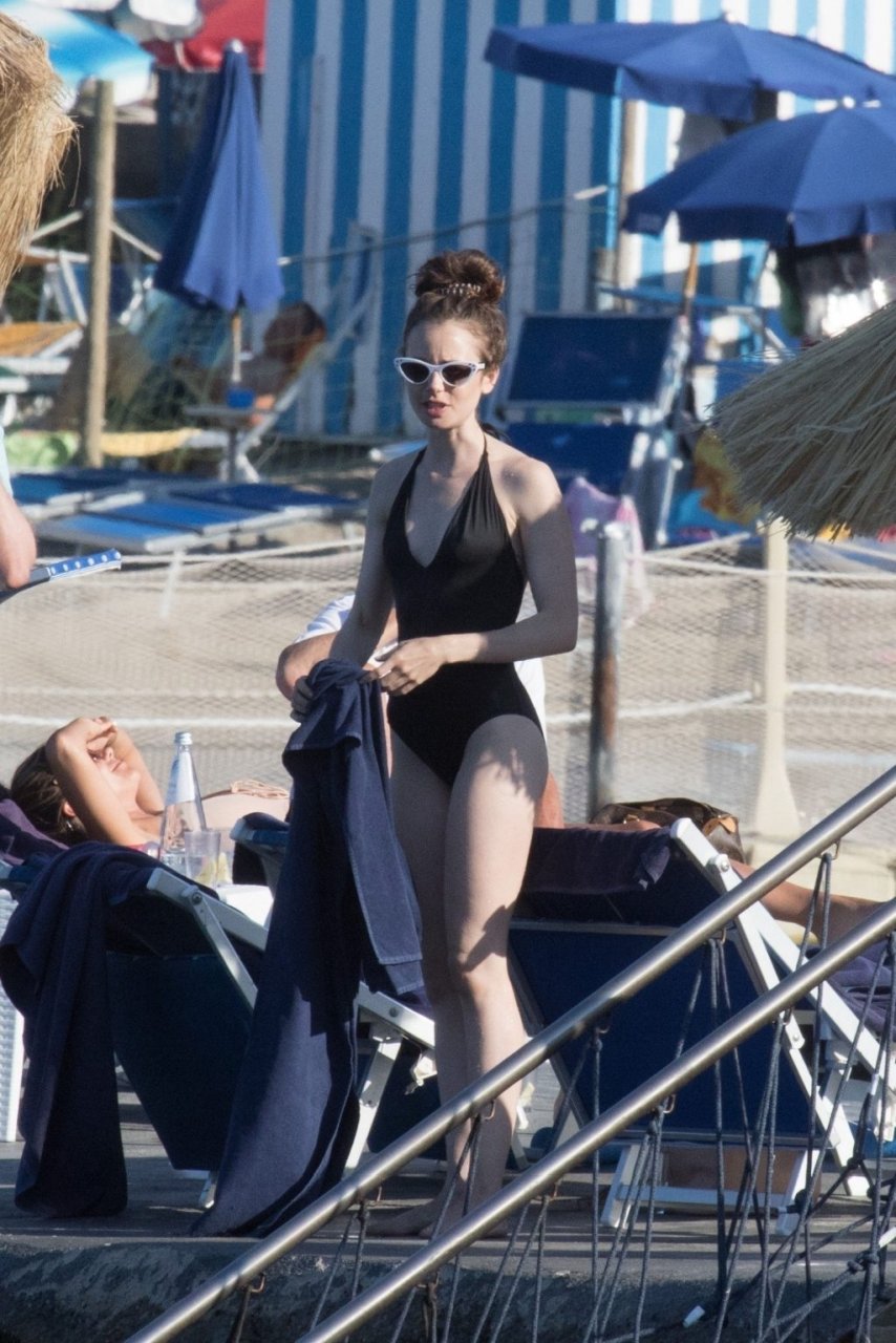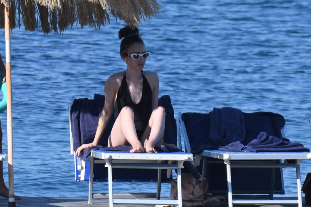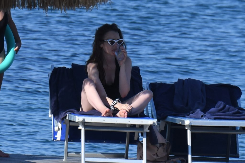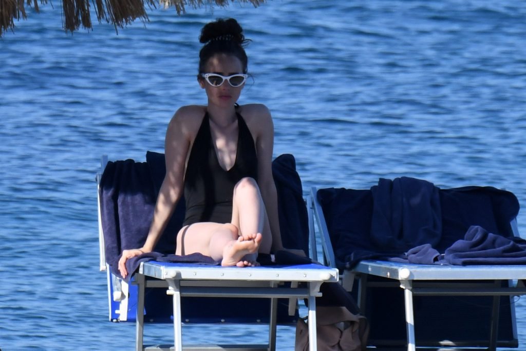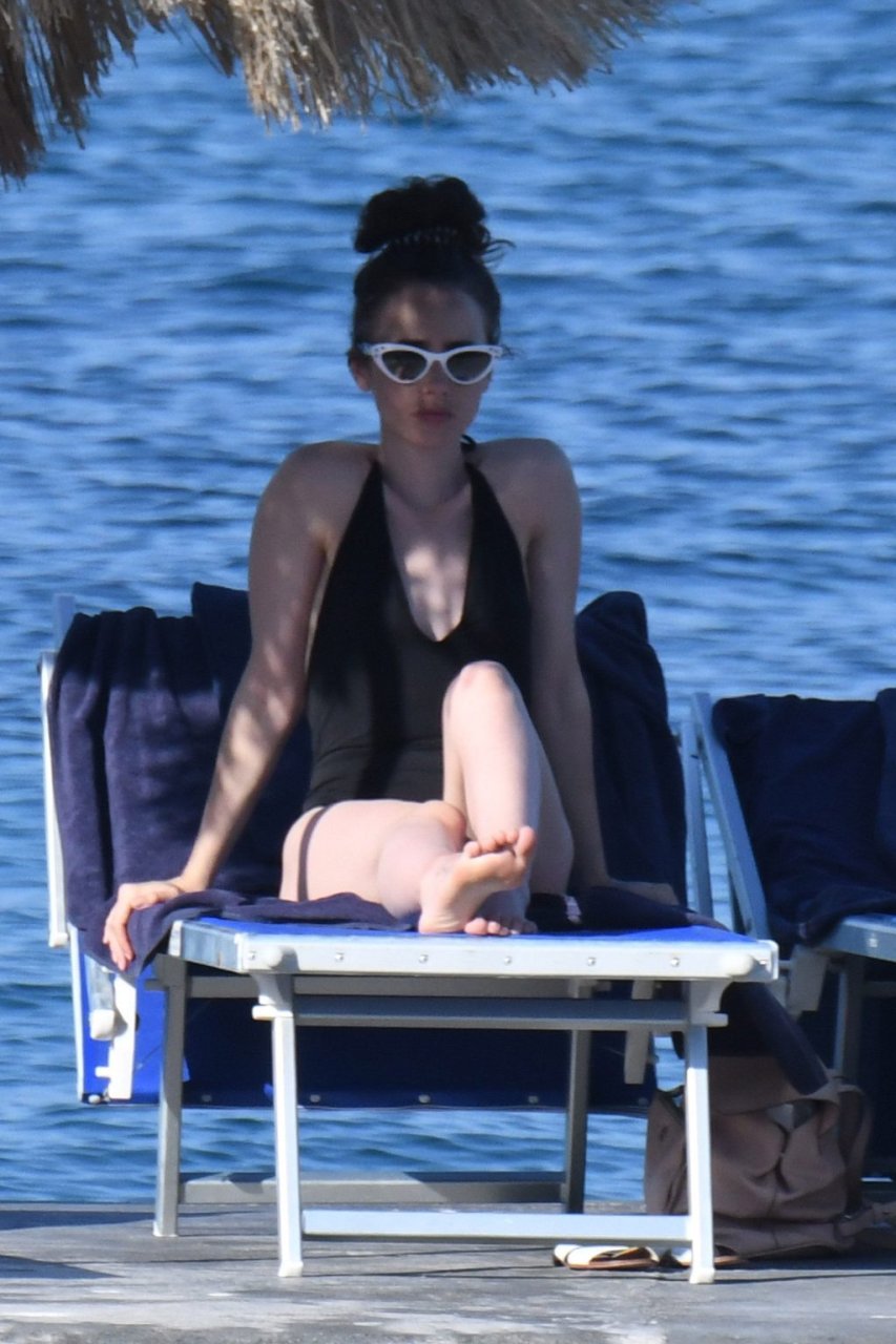 Lily Collins è stata avvistata in vacanza a Ischia, ha fatto il bagno nel mare con un costume da bagno nero. 18/07/2018.