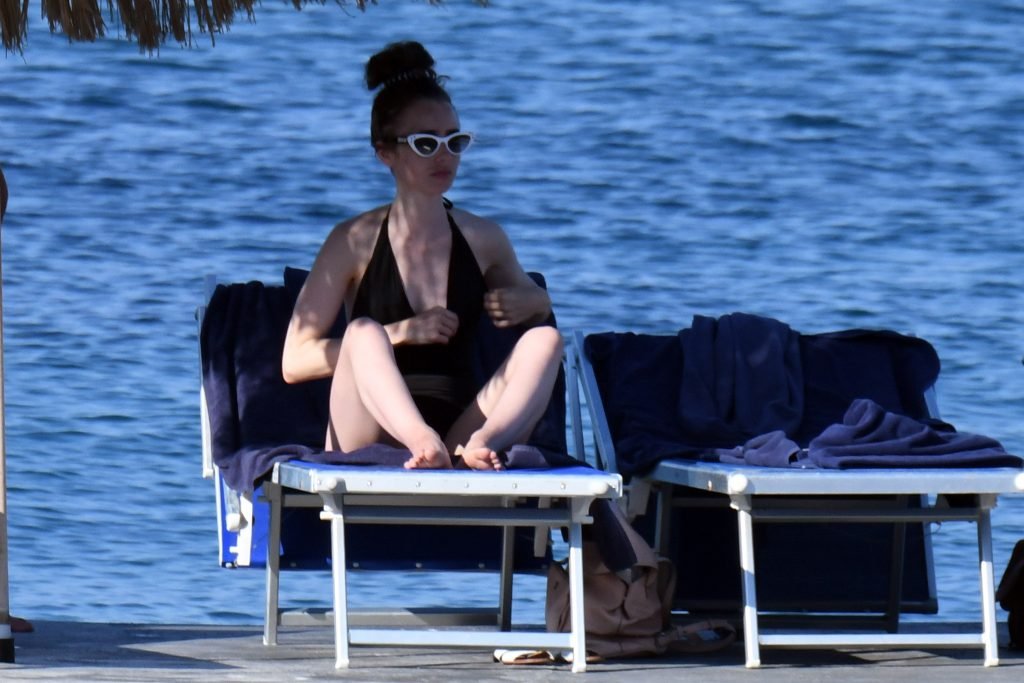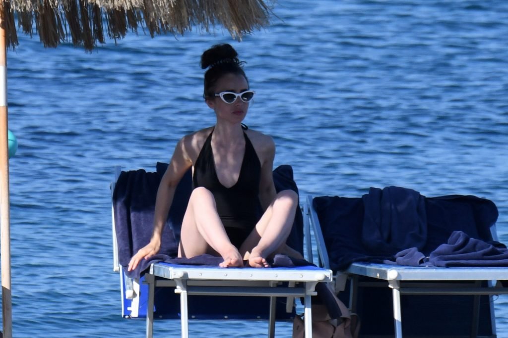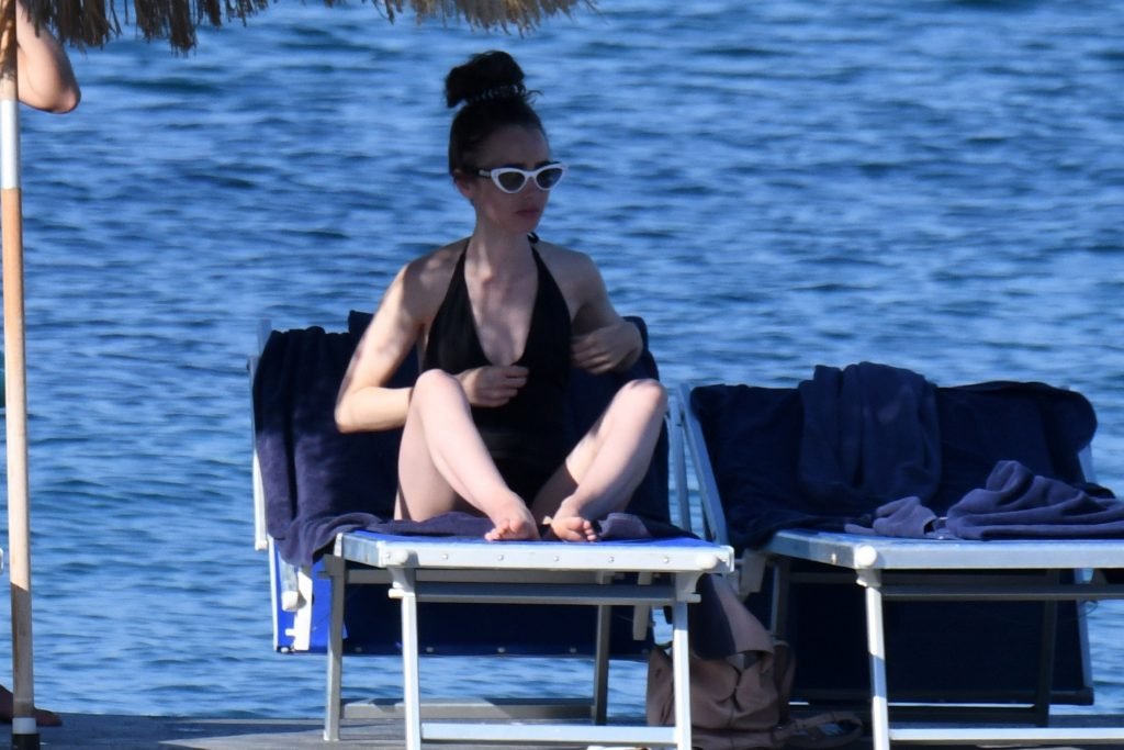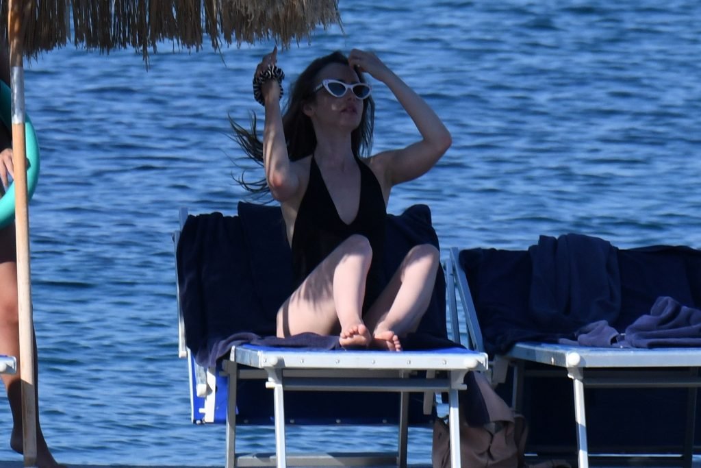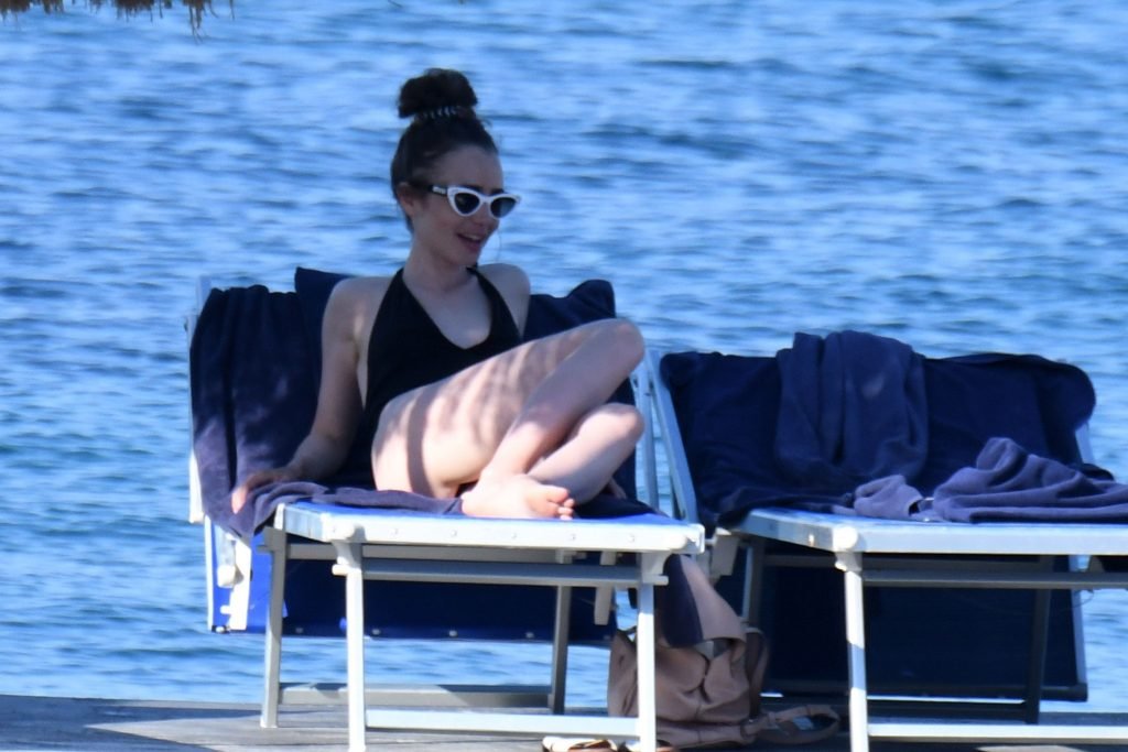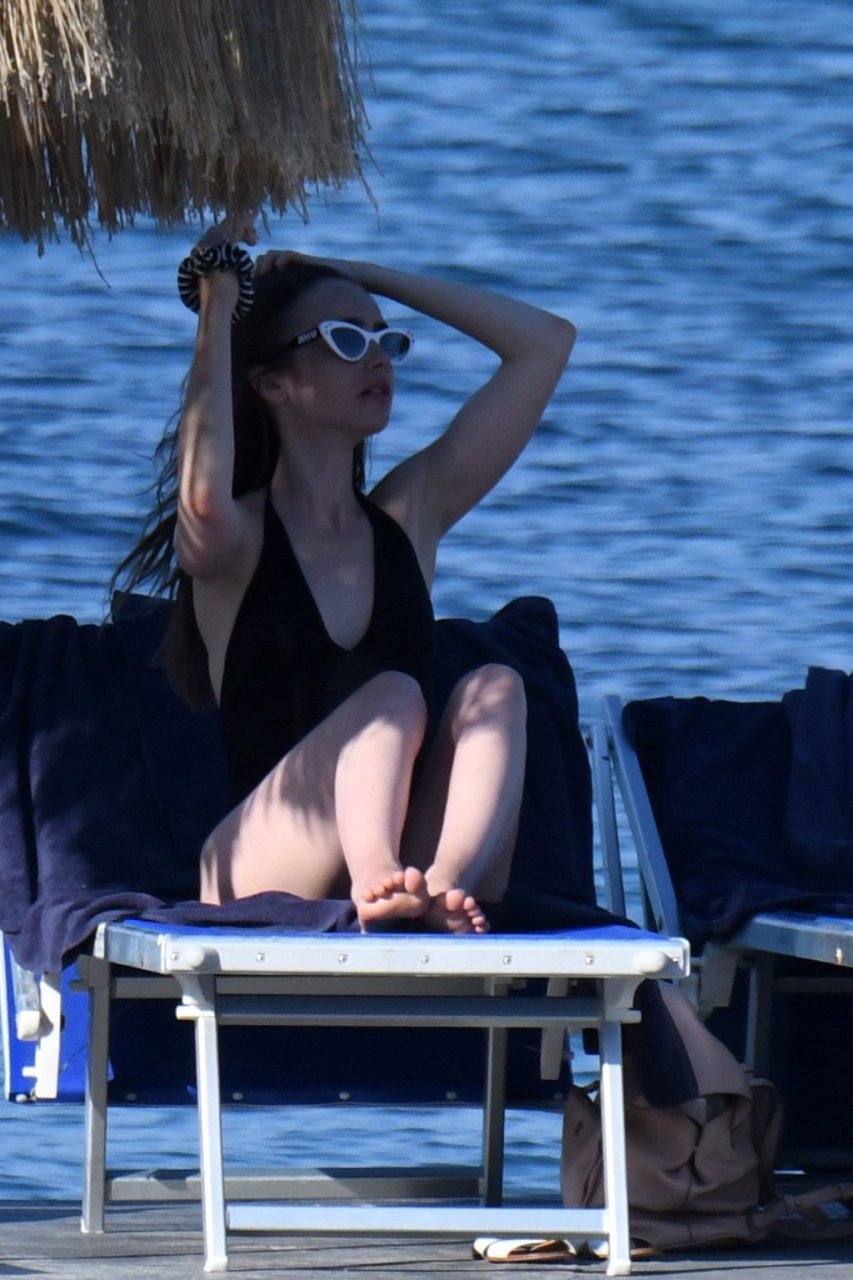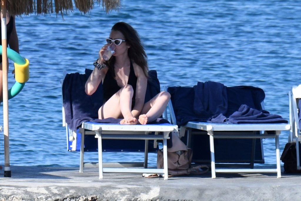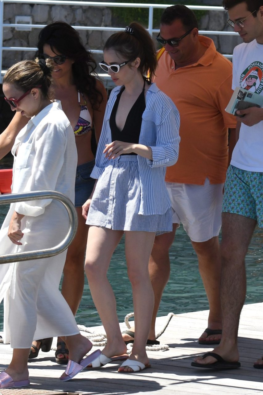 Lily Collins è stata avvistata in vacanza a Ischia, ha fatto il bagno nel mare con un costume da bagno nero. 18/07/2018.