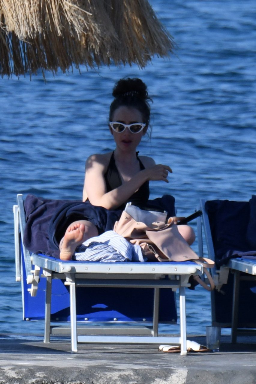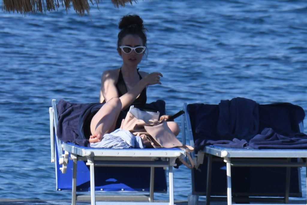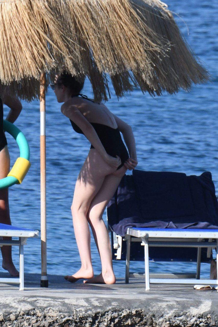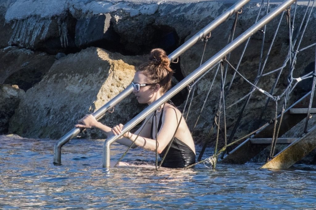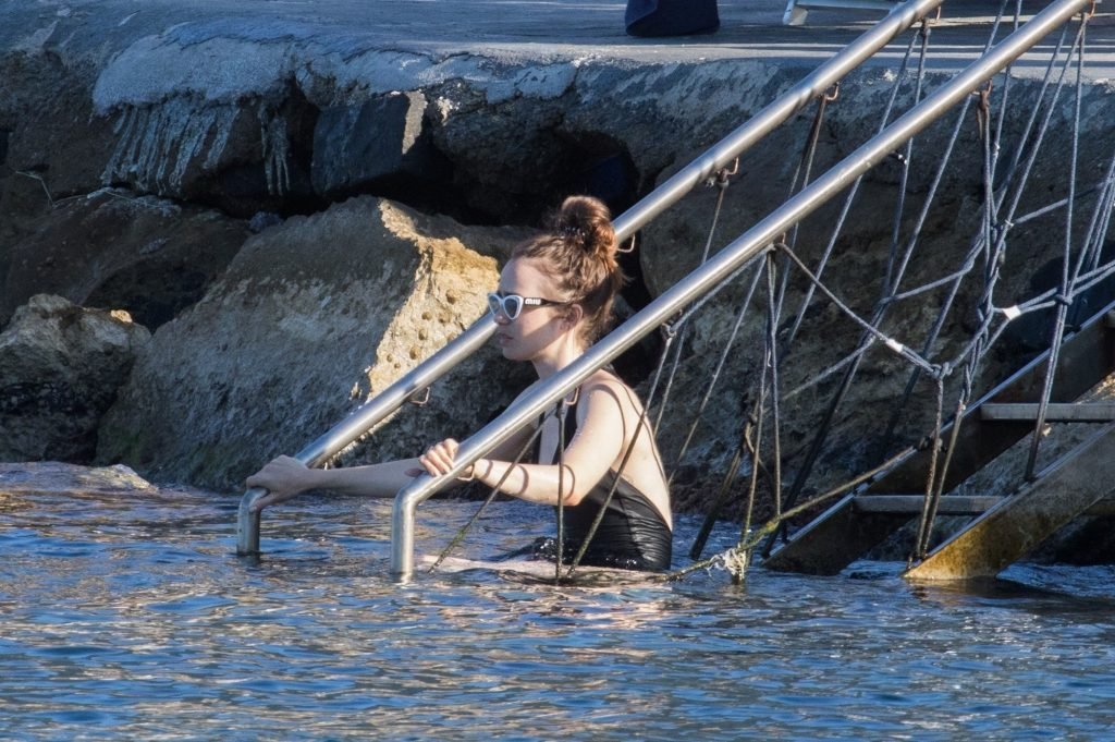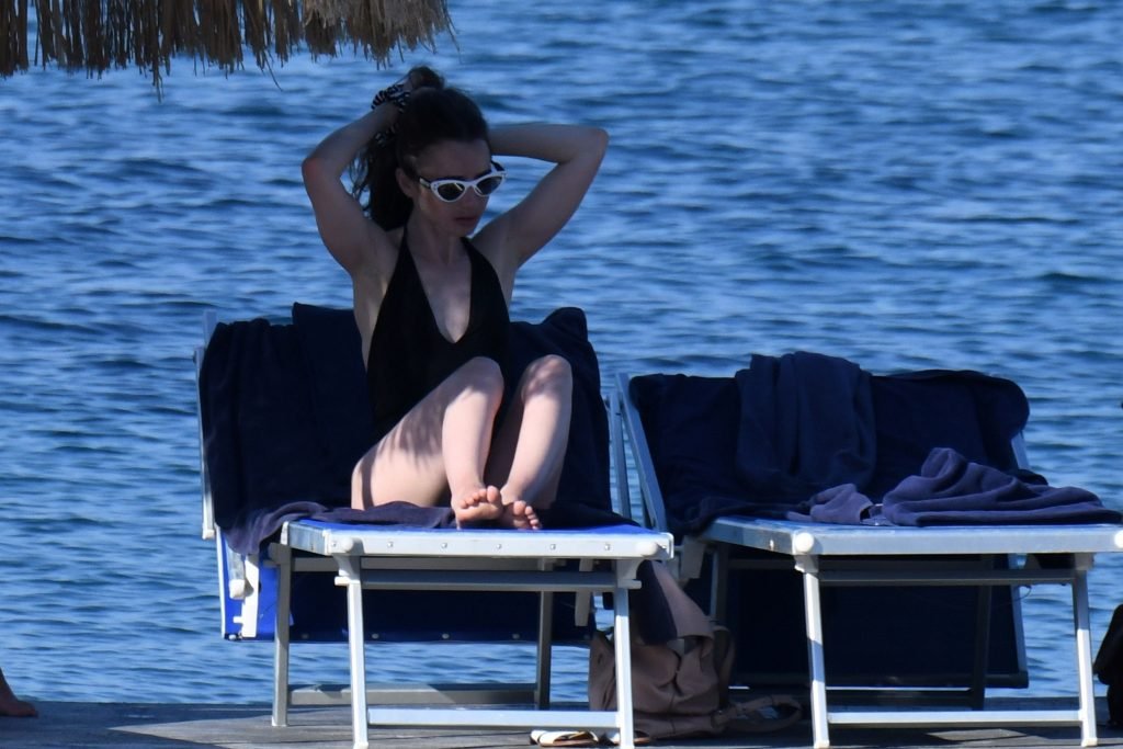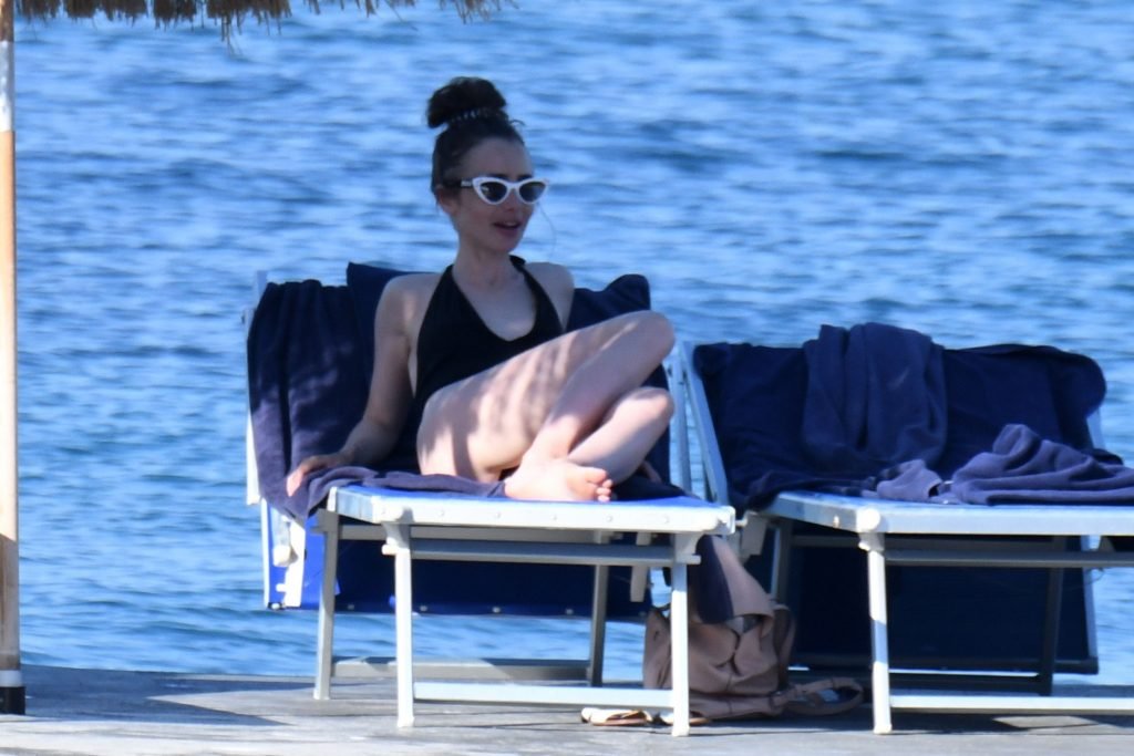 Lily Collins è stata avvistata in vacanza a Ischia, ha fatto il bagno nel mare con un costume da bagno nero. 18/07/2018.