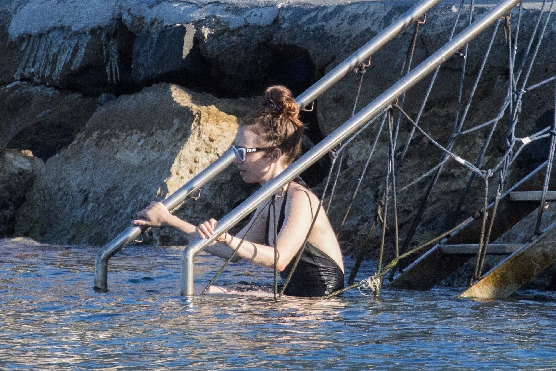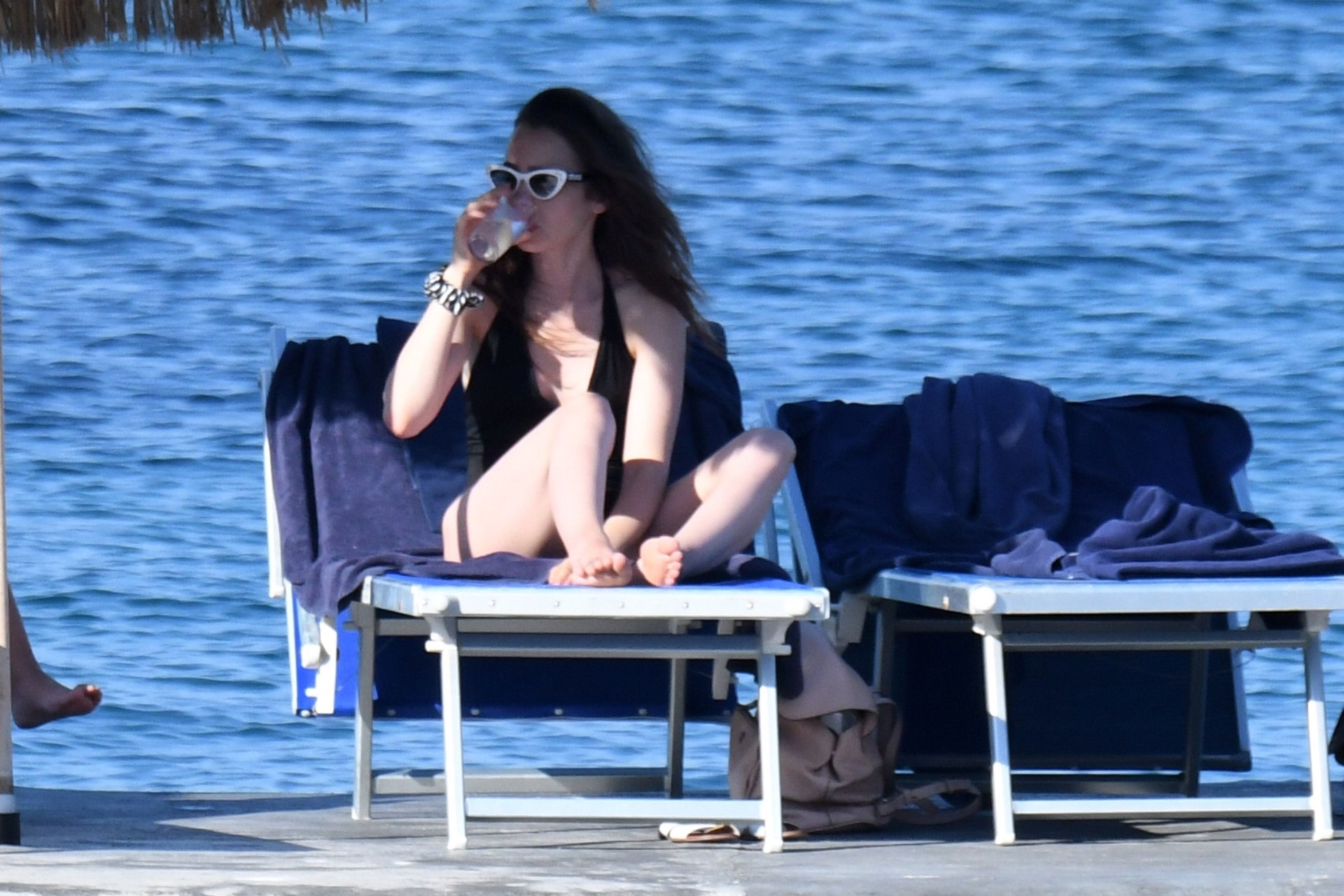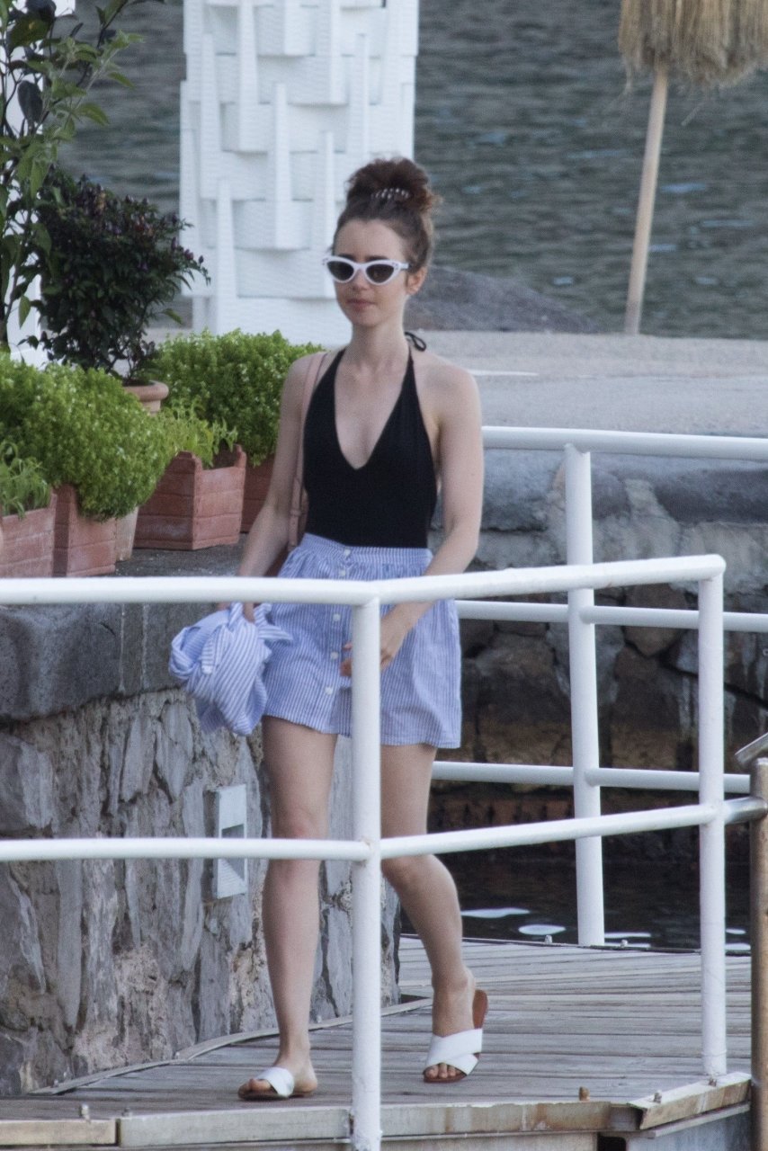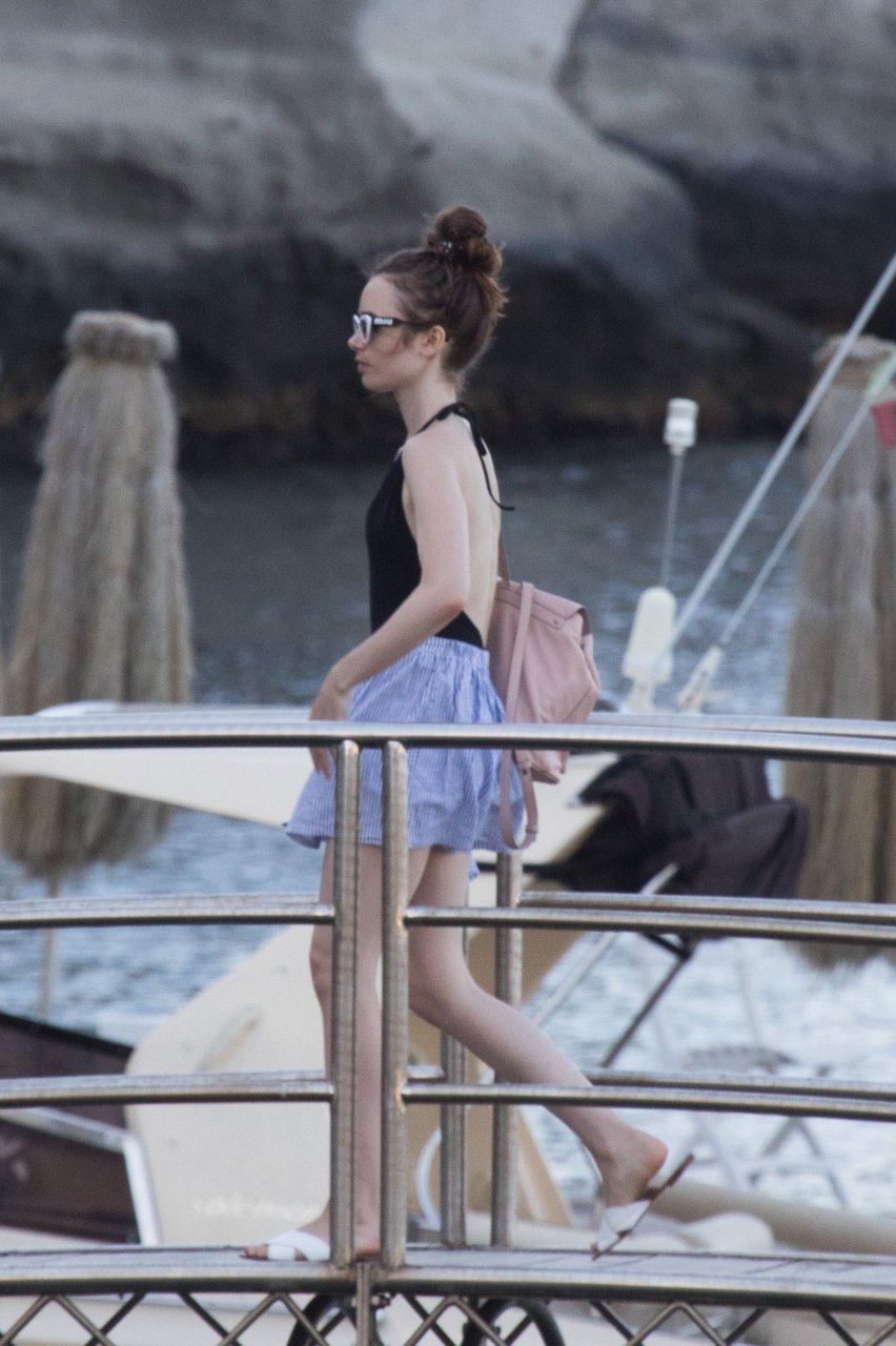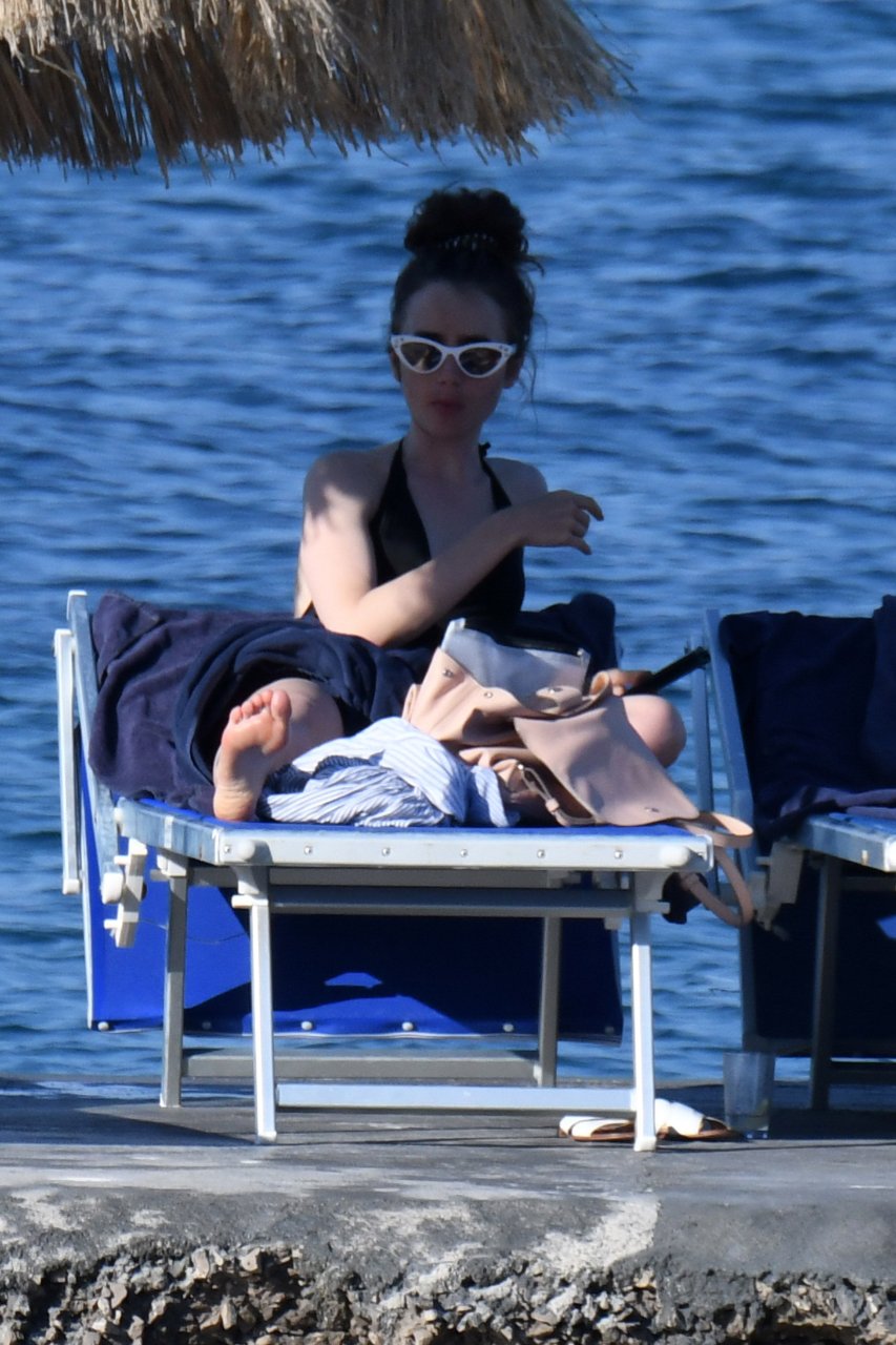 Lily Collins è stata avvistata in vacanza a Ischia, ha fatto il bagno nel mare con un costume da bagno nero. 18/07/2018.