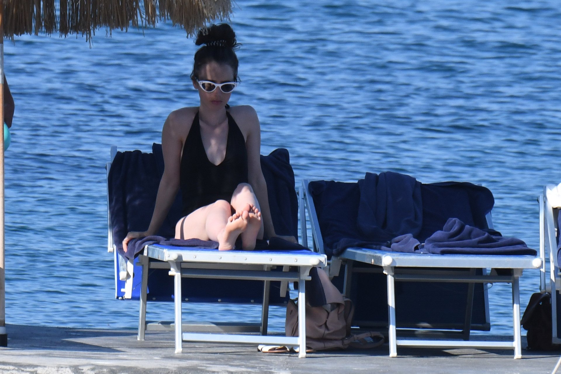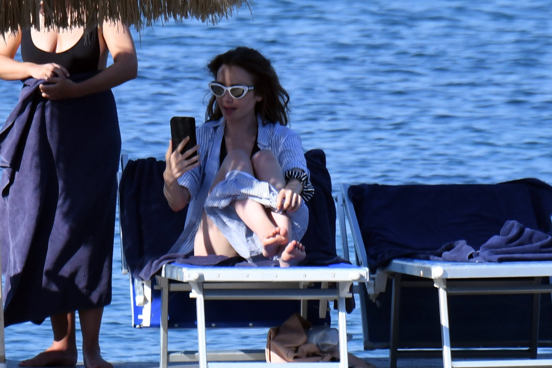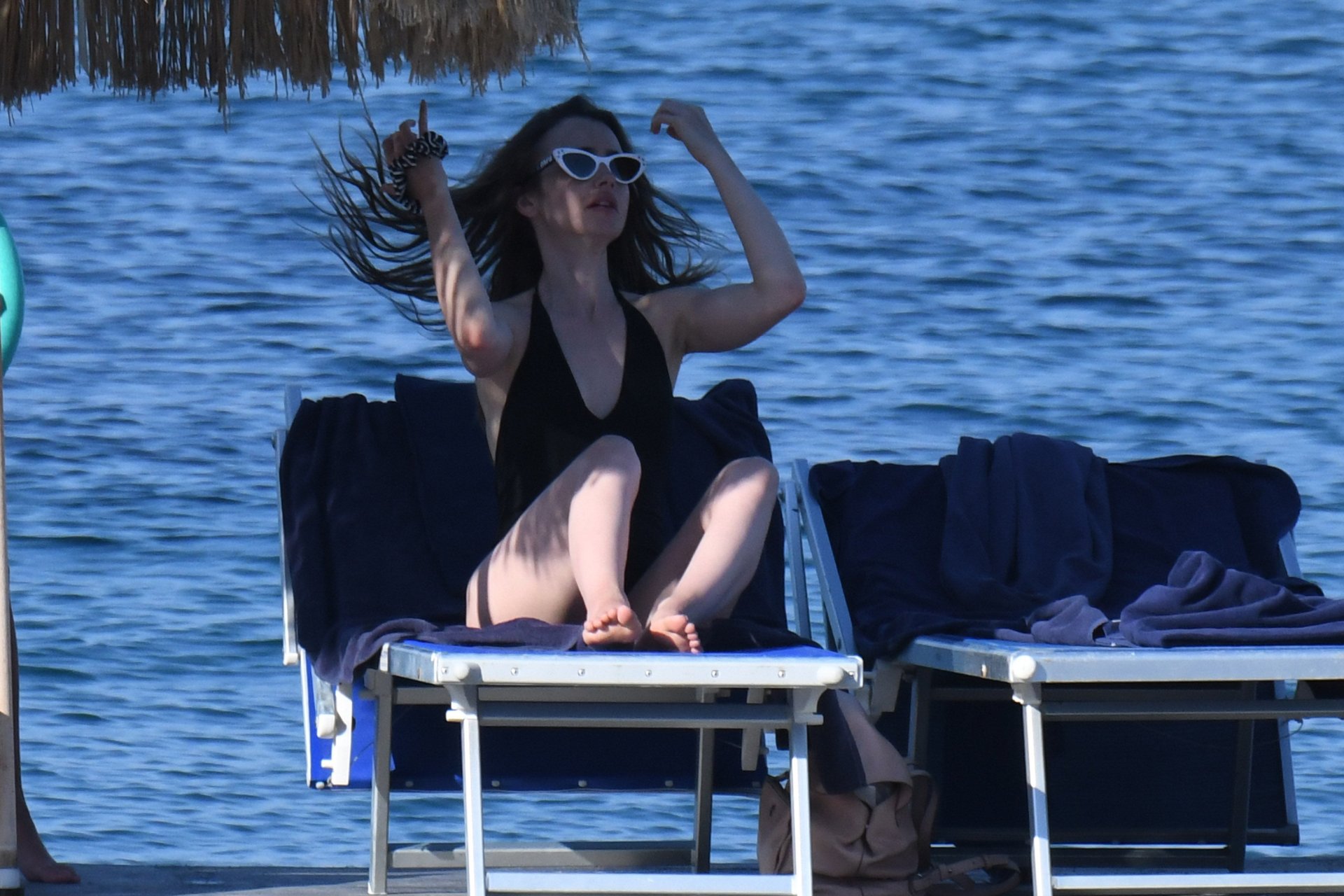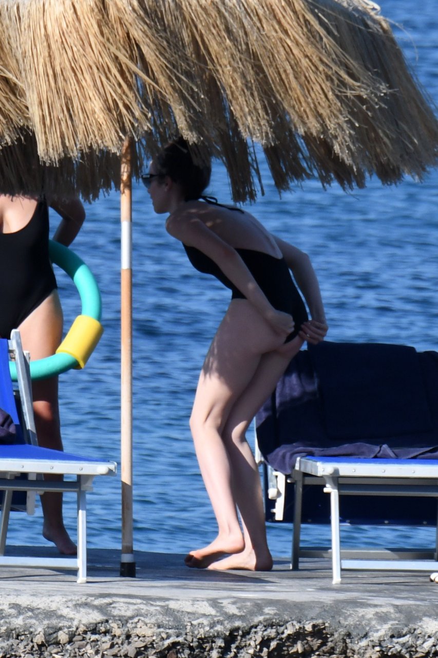 Lily Collins è stata avvistata in vacanza a Ischia, ha fatto il bagno nel mare con un costume da bagno nero. 18/07/2018.