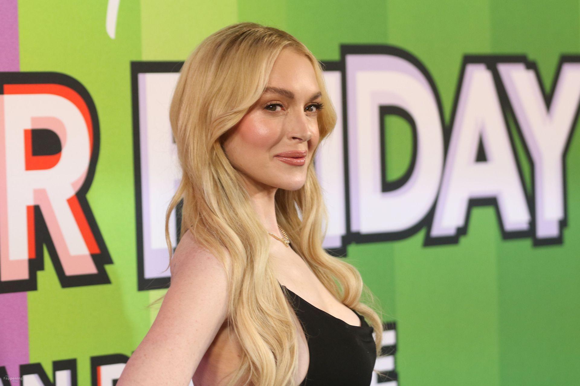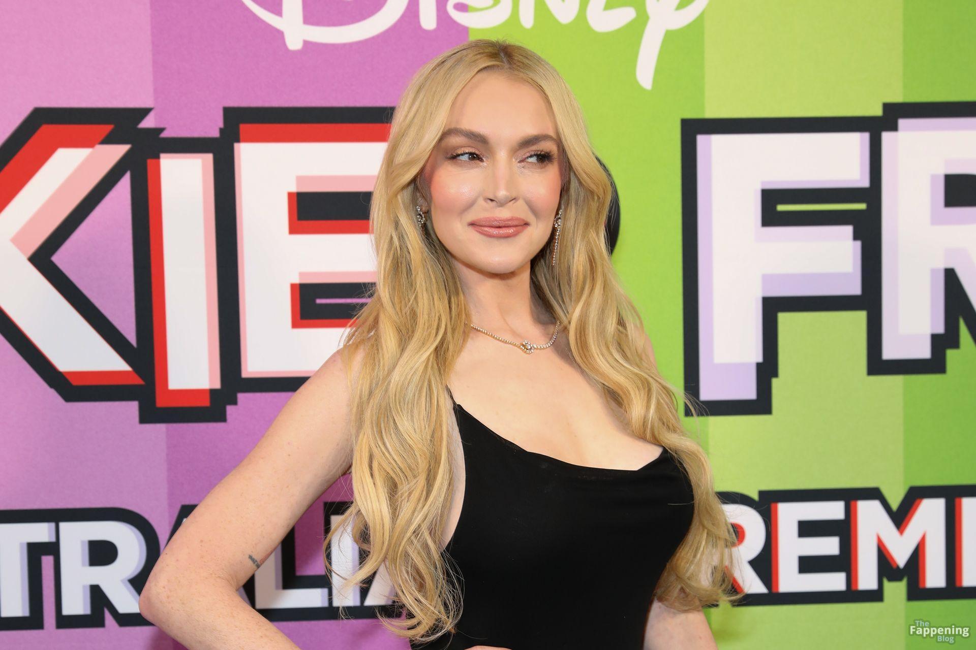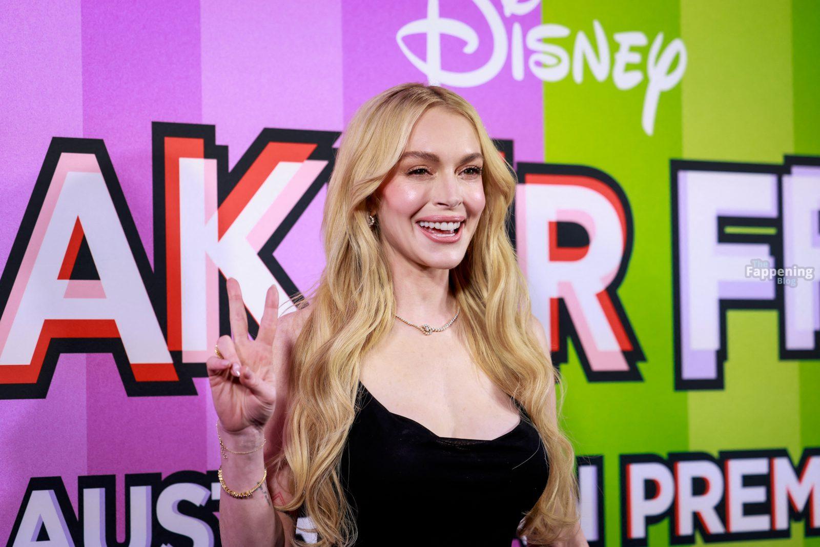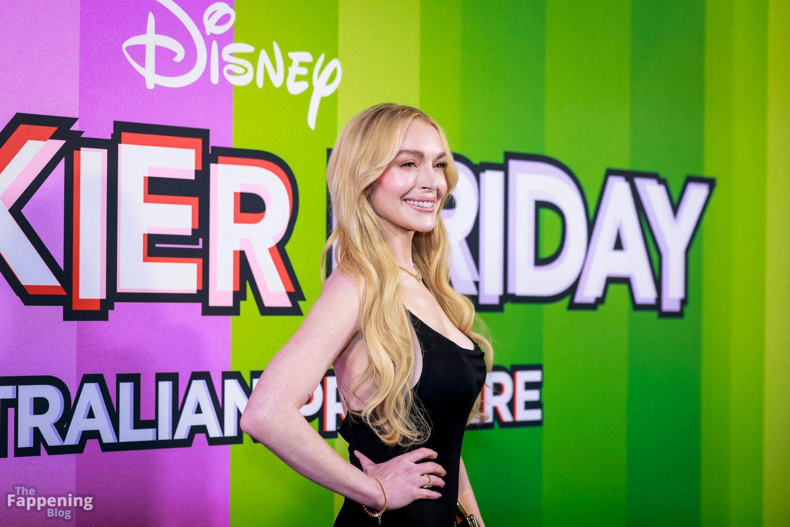 Lindsay Lohan mostra la sua nuova figura snella alla prima di “Freakier Friday” a Sydney, Australia, sfoggiando un abito nero trasparente.
