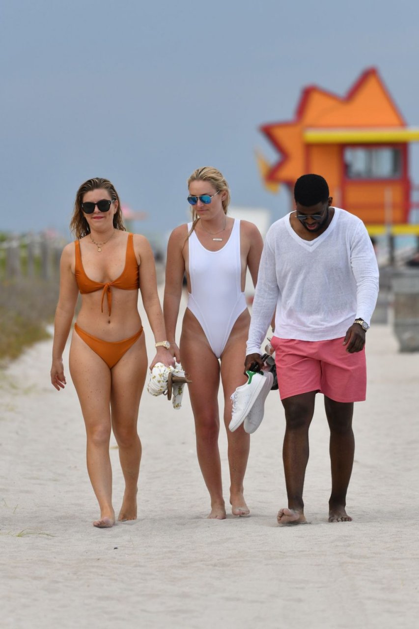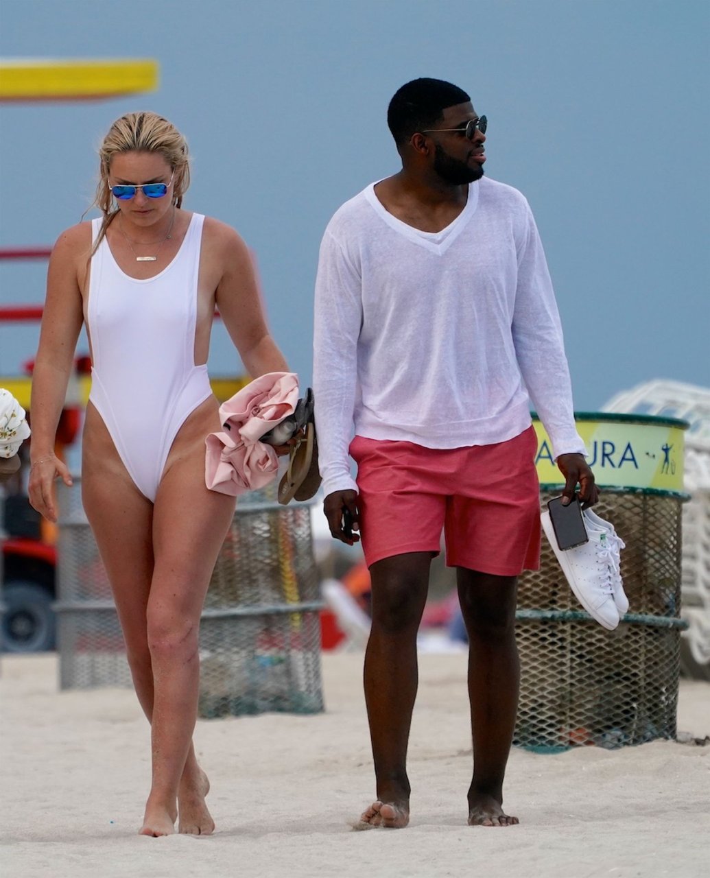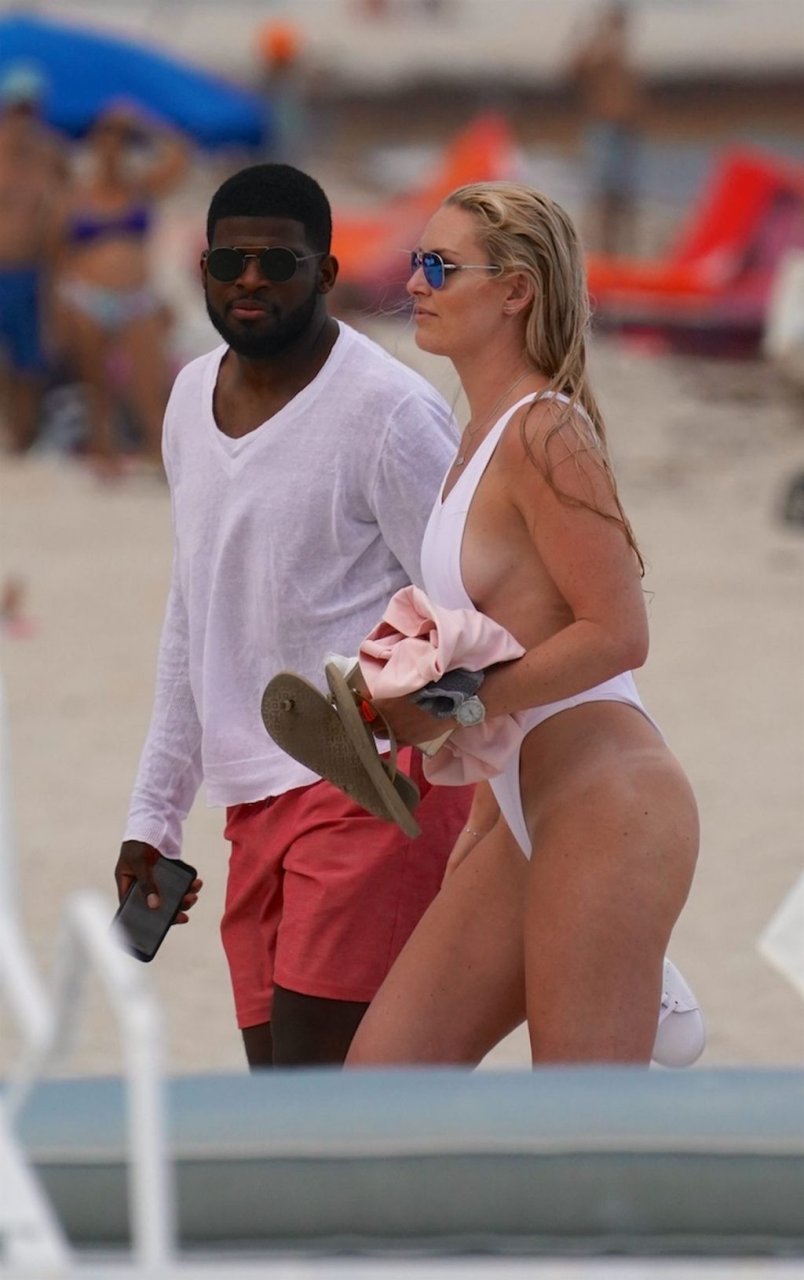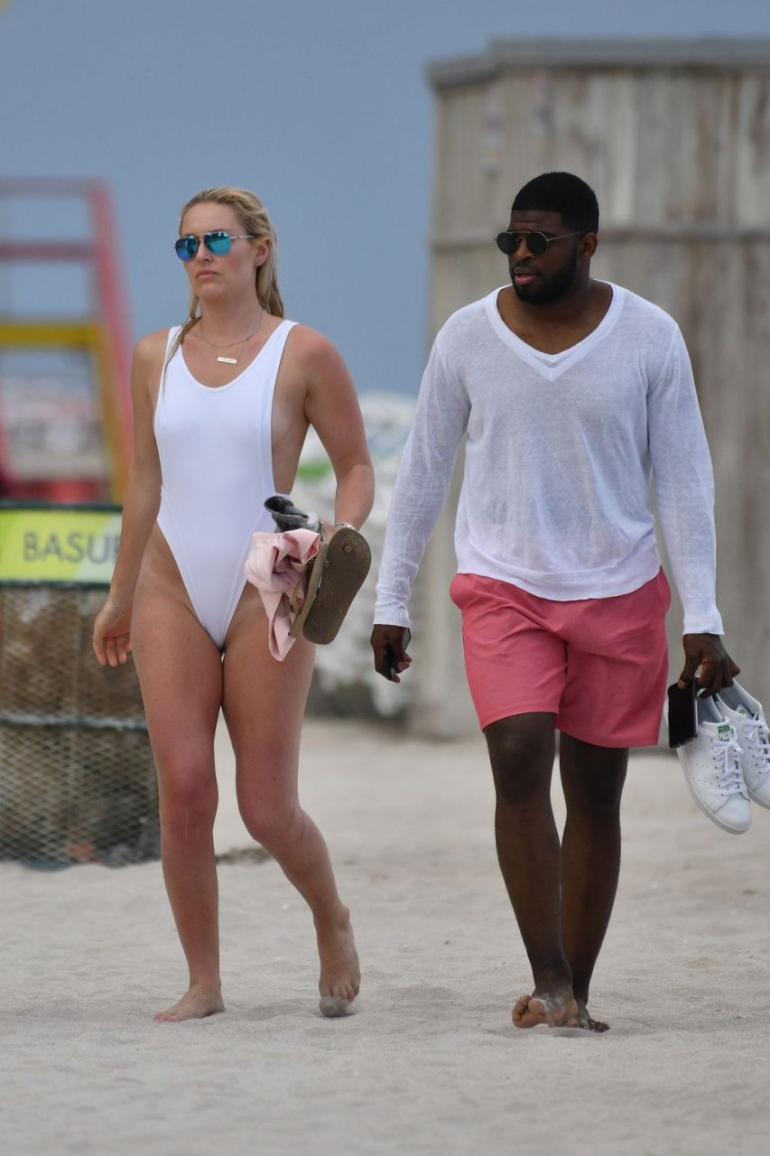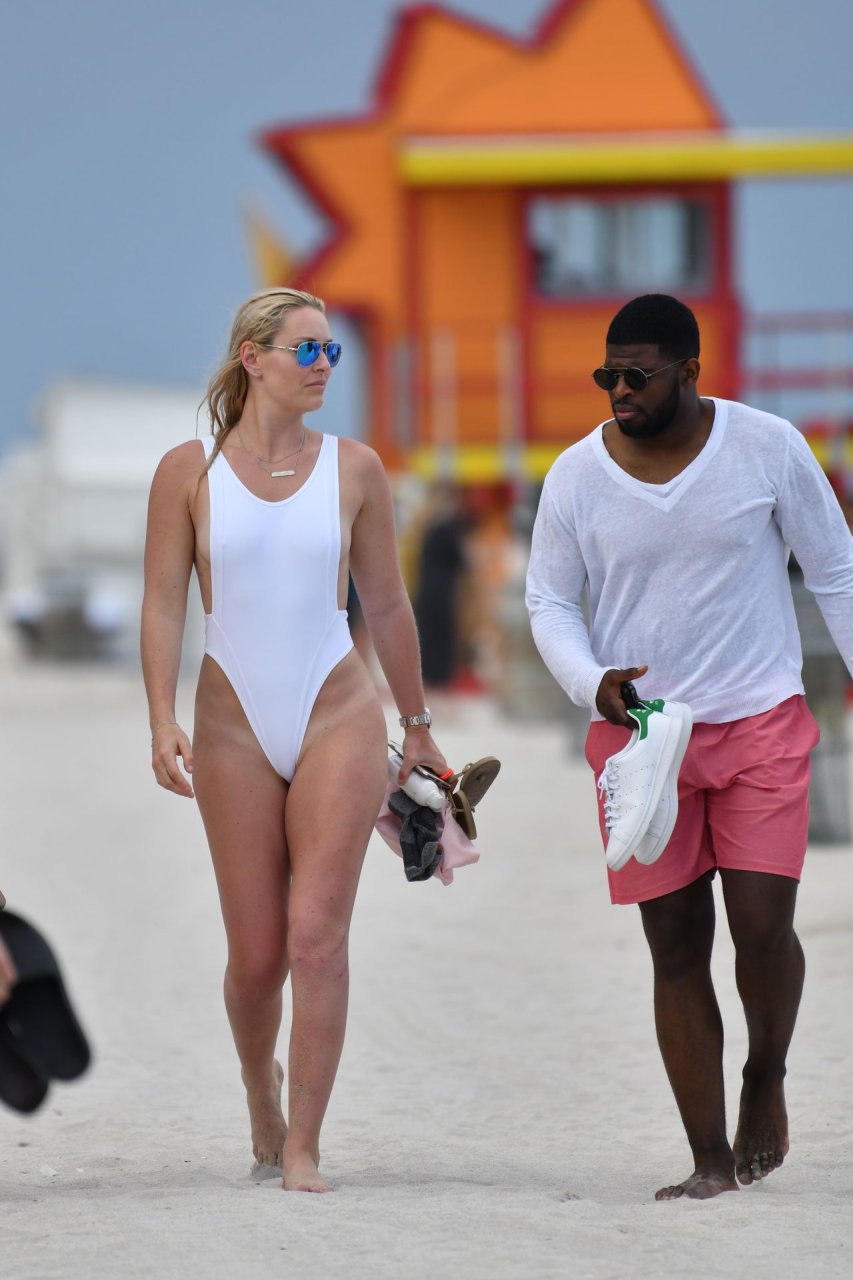 Lindsey Vonn mette in mostra la sua figura atletica con un sexy costume intero bianco mentre passeggia con il suo fidanzato P.K. Subban e un amico sulla spiaggia di Miami, 04/05/2019.