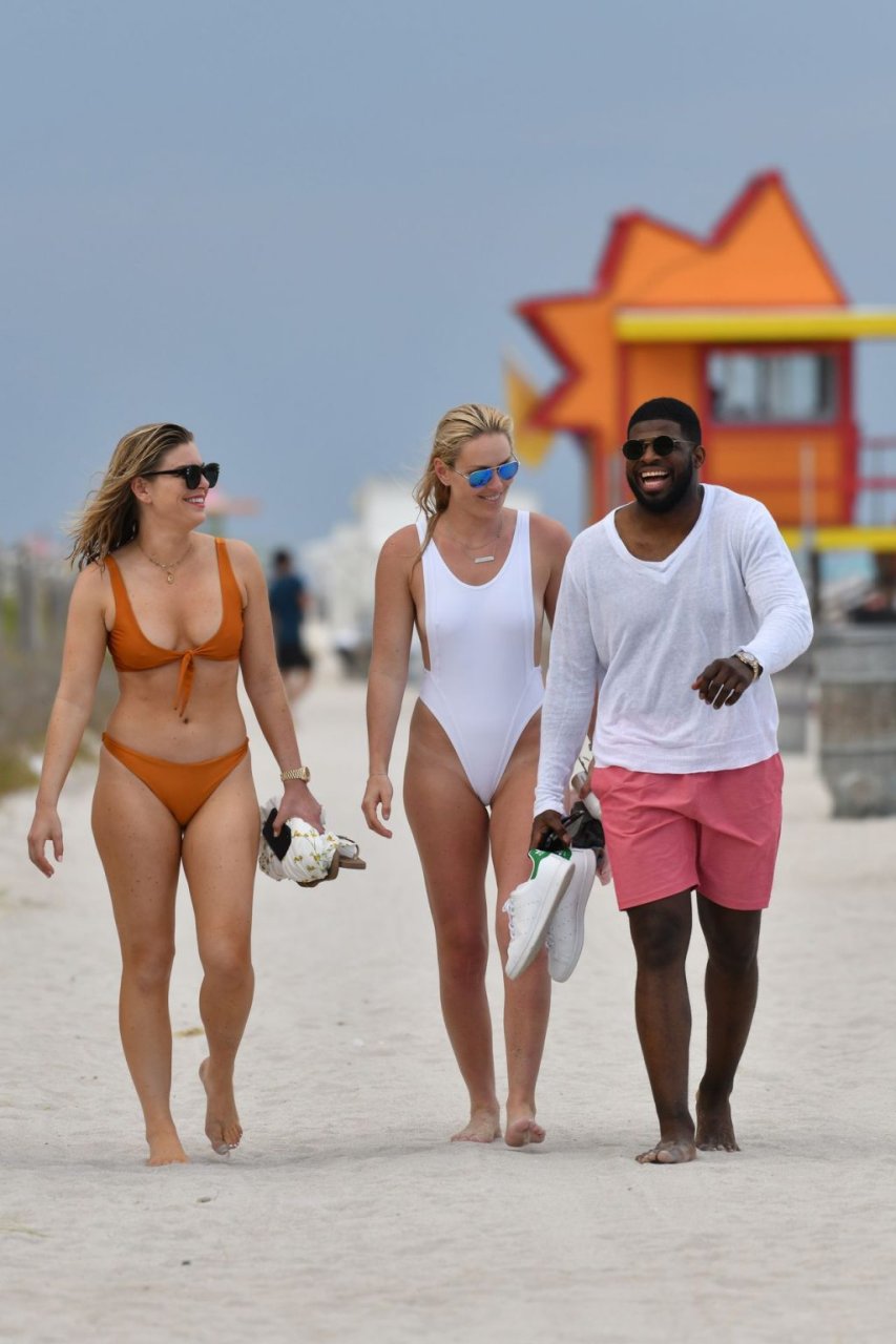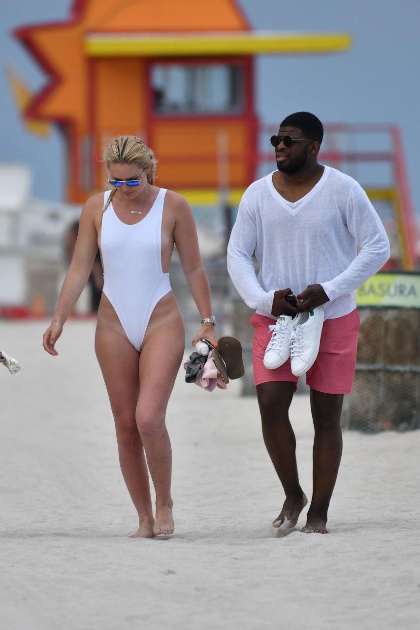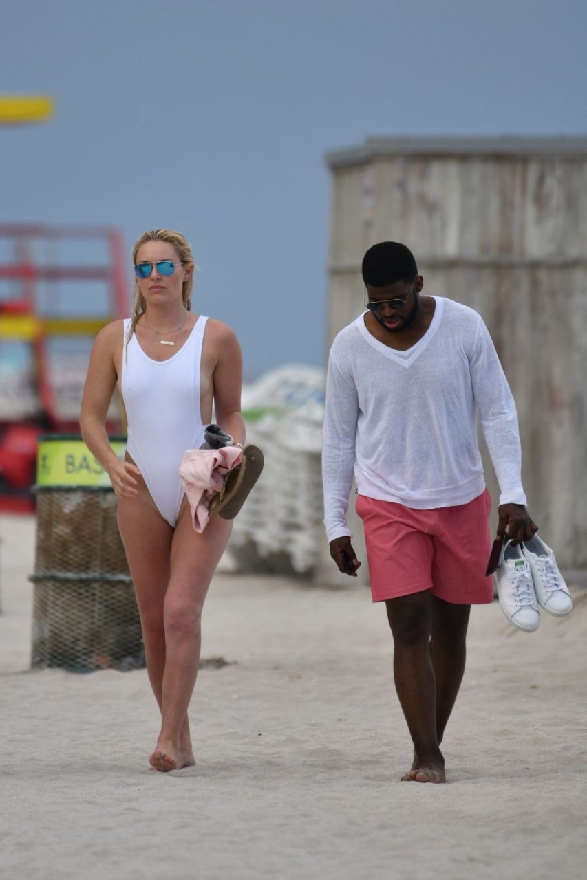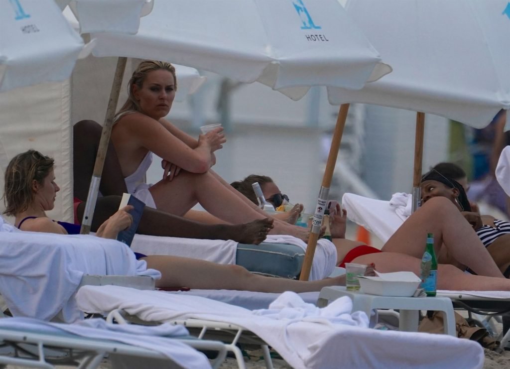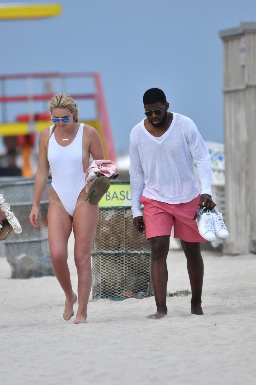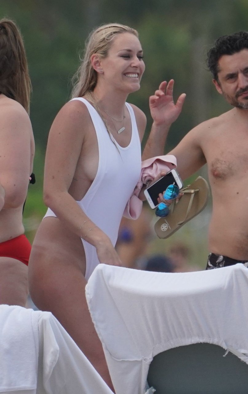 Lindsey Vonn mette in mostra la sua figura atletica con un sexy costume intero bianco mentre passeggia con il suo fidanzato P.K. Subban e un amico sulla spiaggia di Miami, 04/05/2019.