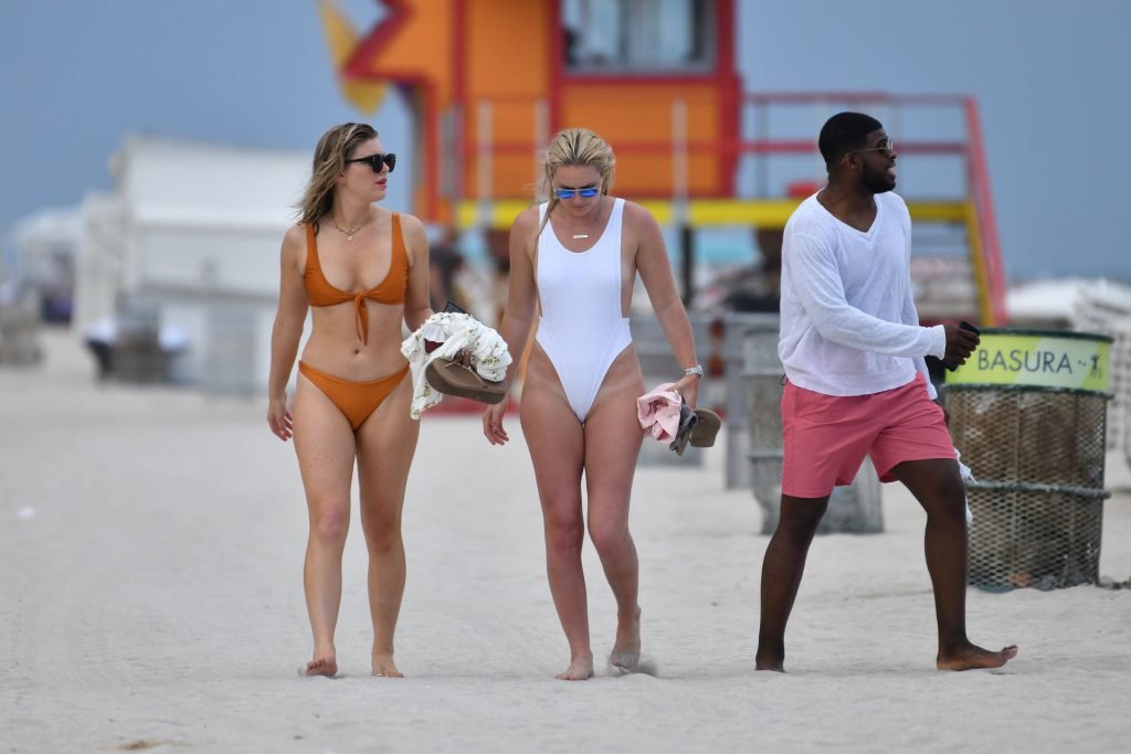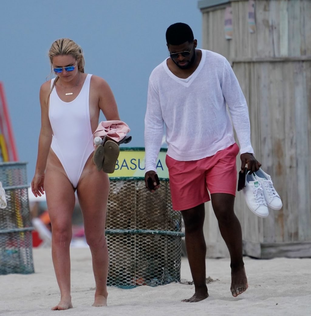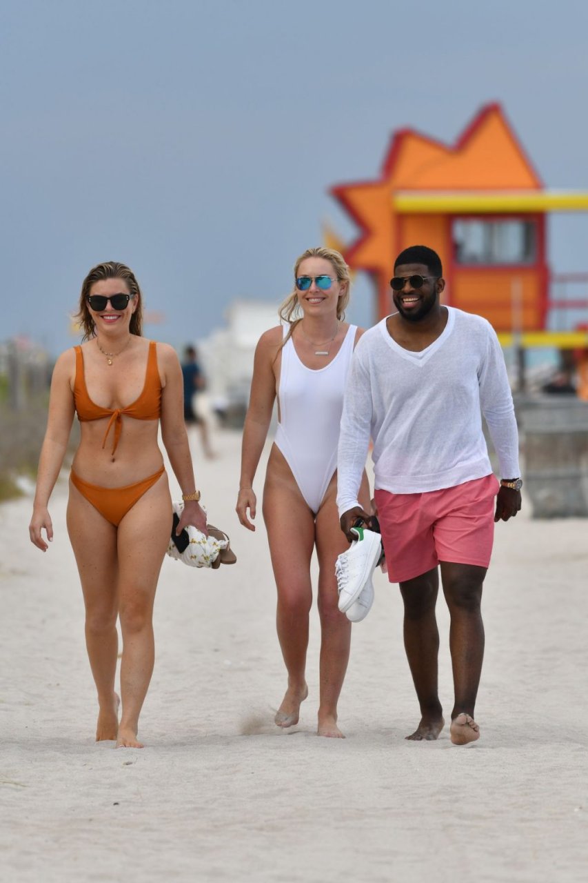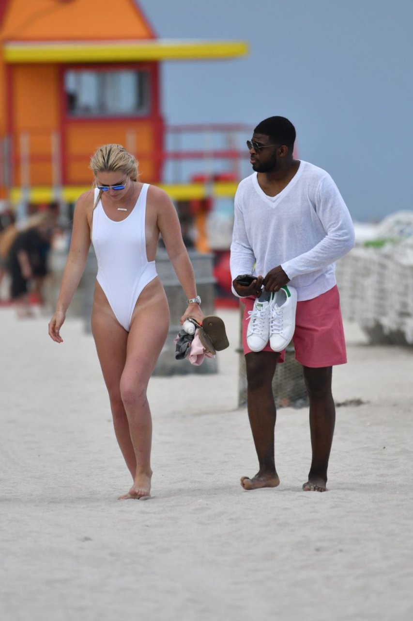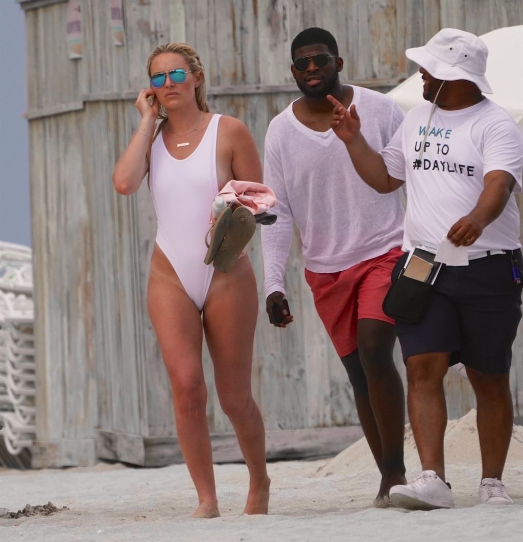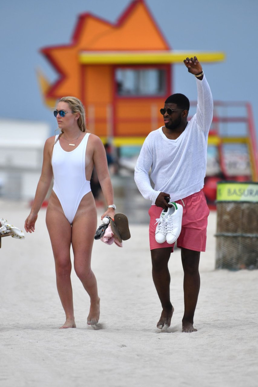 Lindsey Vonn mette in mostra la sua figura atletica con un sexy costume intero bianco mentre passeggia con il suo fidanzato P.K. Subban e un amico sulla spiaggia di Miami, 04/05/2019.