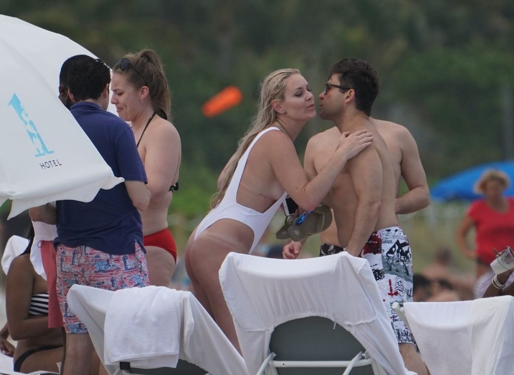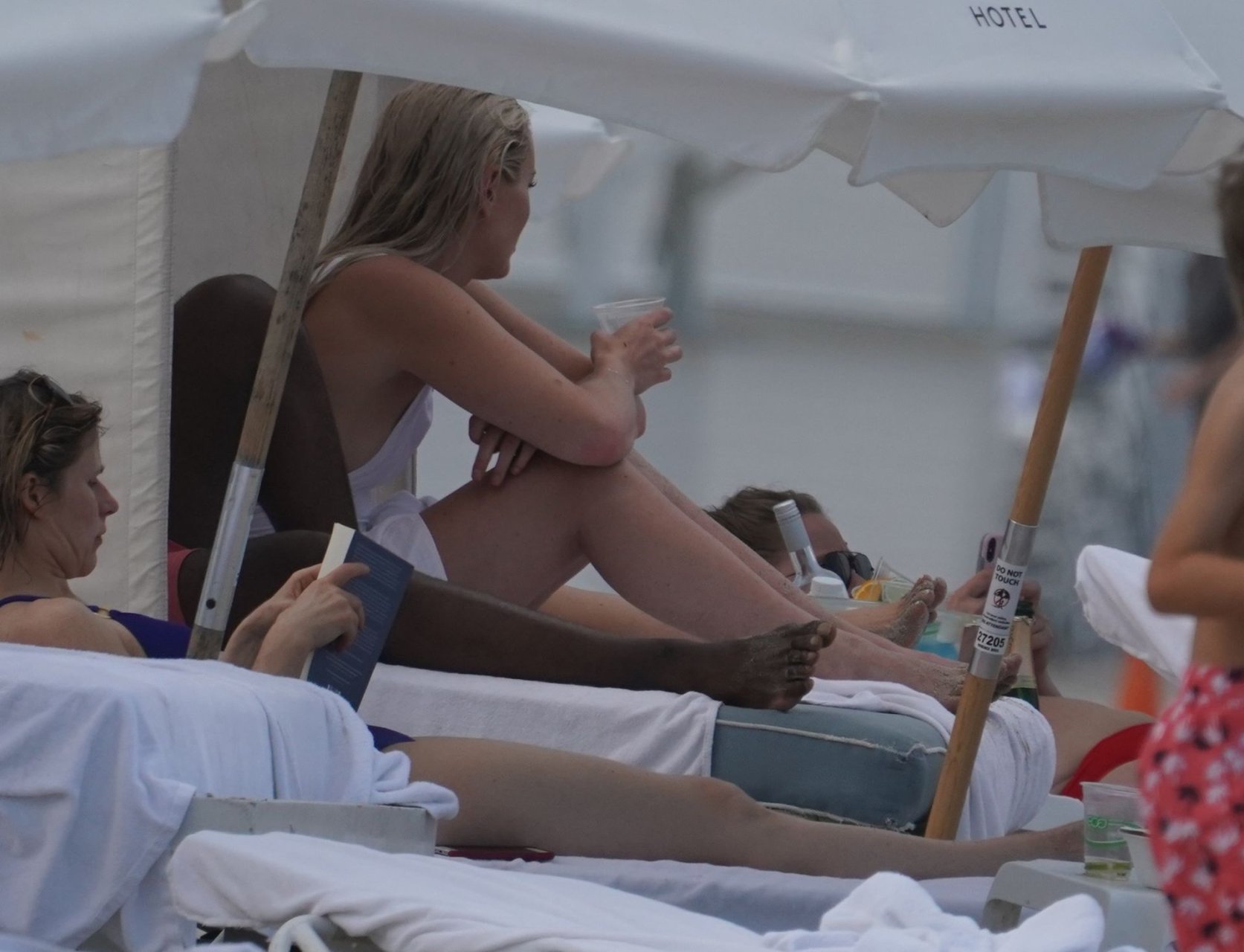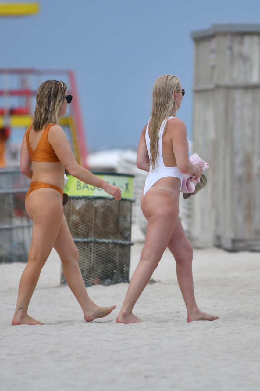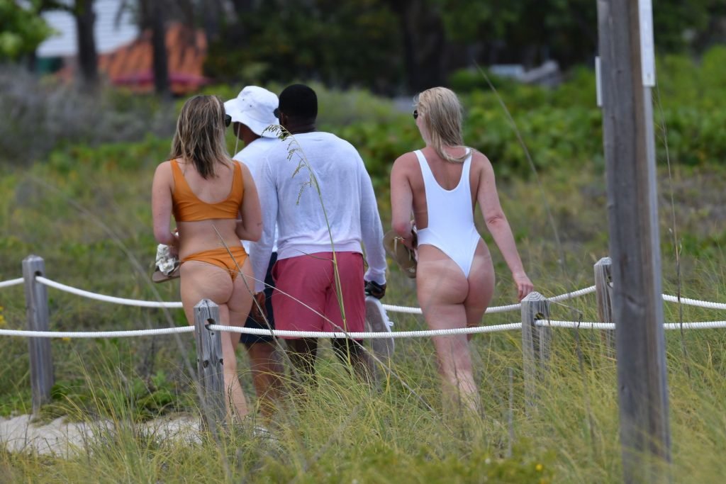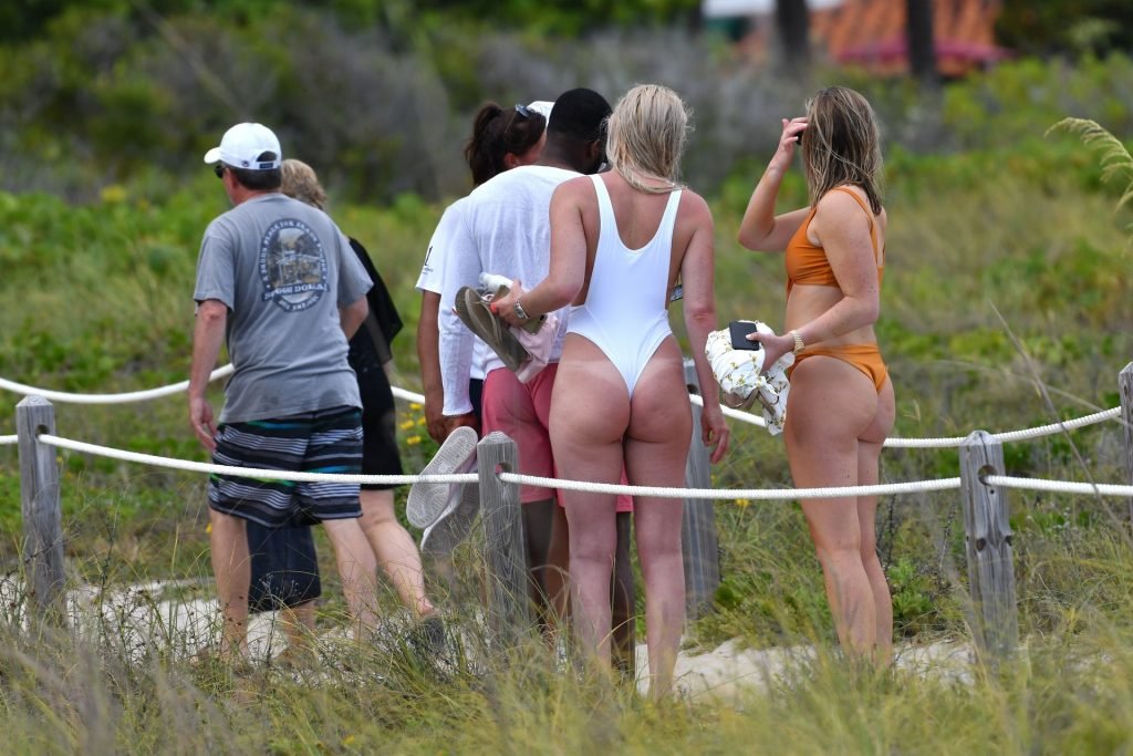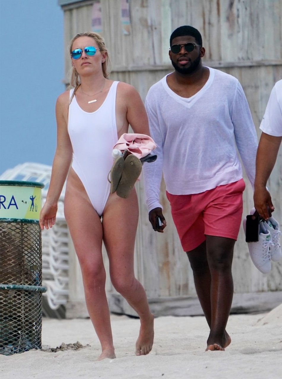 Lindsey Vonn mette in mostra la sua figura atletica con un sexy costume intero bianco mentre passeggia con il suo fidanzato P.K. Subban e un amico sulla spiaggia di Miami, 04/05/2019.