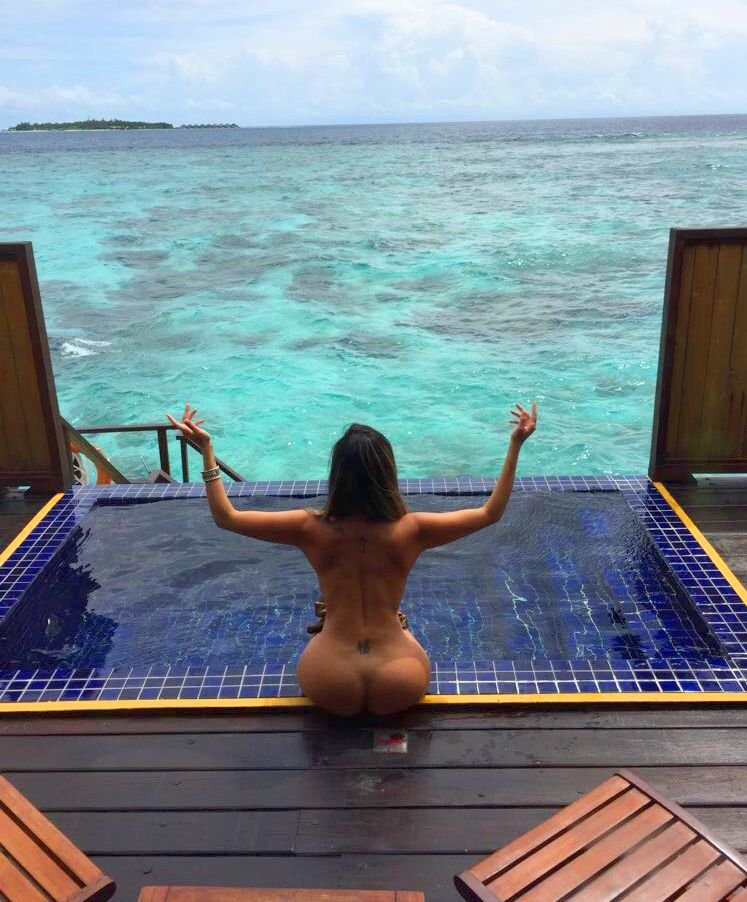 La modella brasiliana e star di Instagram Liziane Gutierrez, 31 anni, mostra il suo lato B rifatto ai fan alle Maldive, 26/07/2017.