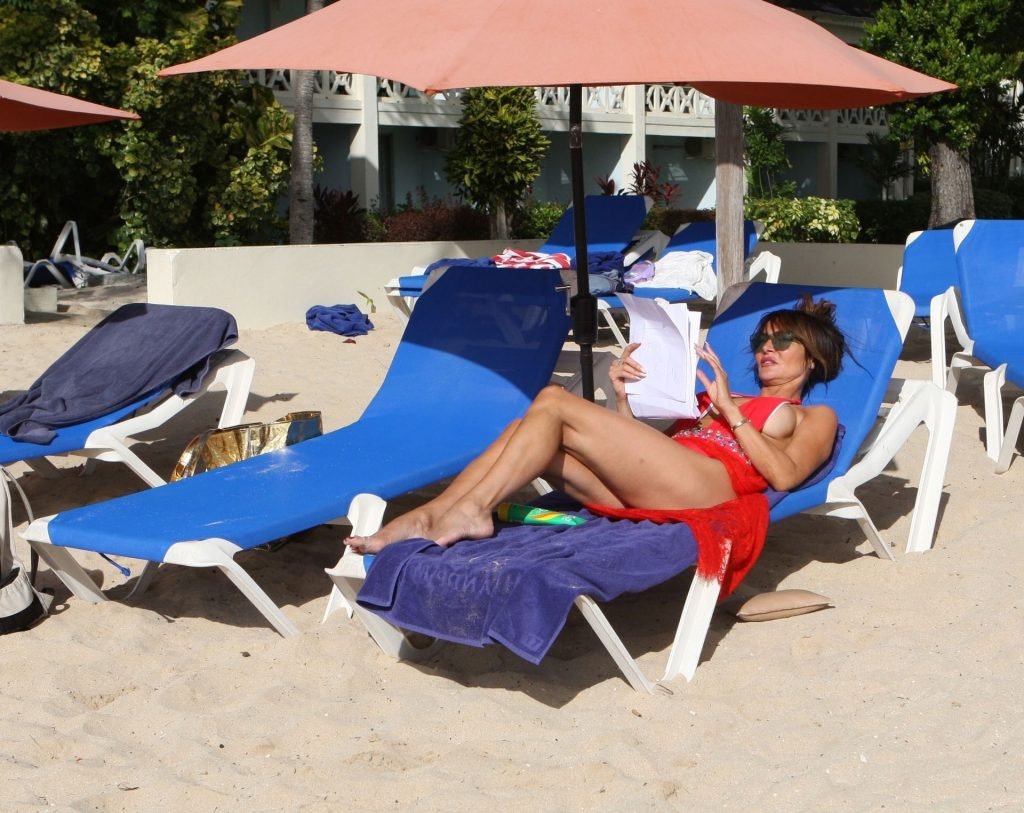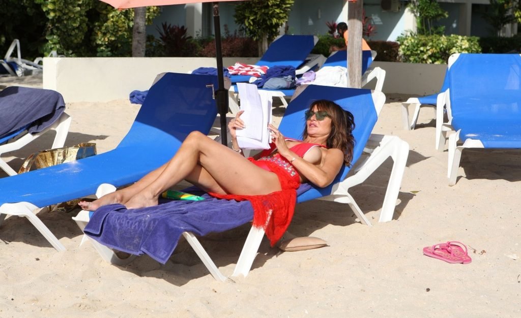 Lizzie Cundy sembra imparare le sue battute leggendo un copione sul suo lettino prendisole mentre è in vacanza sulla soleggiata isola di Barbados, 30/12/2018. Lizzie ha stupito con un abito da spiaggia fluente con collo all’americana che rivela molto lato seno.