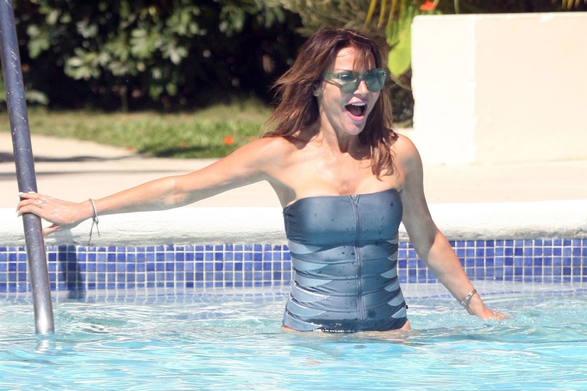 La presentatrice televisiva britannica Lizzie Cundy, 49 anni, mostra la sua figura snella posando per foto mentre indossa un costume da bagno argento e si gode un tuffo in piscina durante una vacanza a Barbados, 01/02/2019.