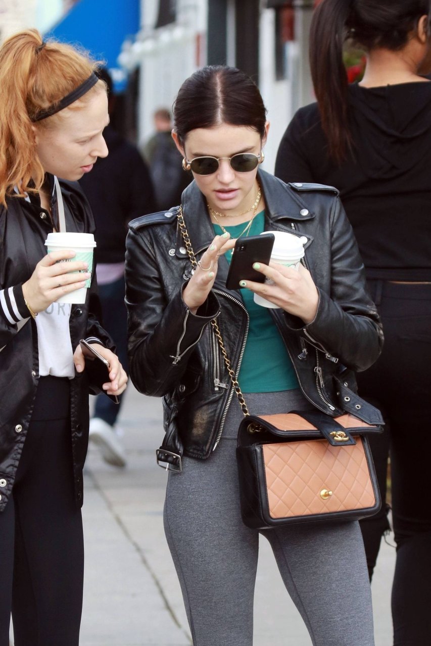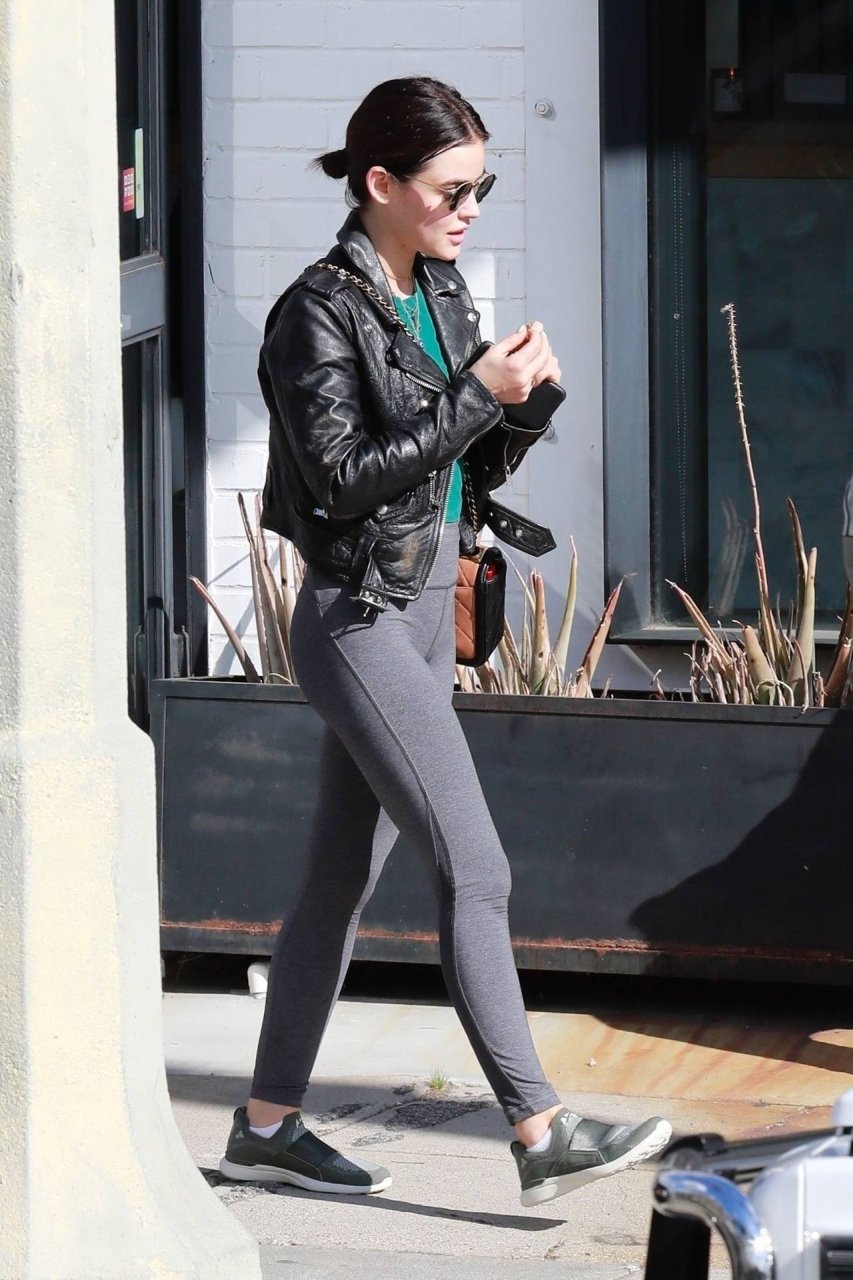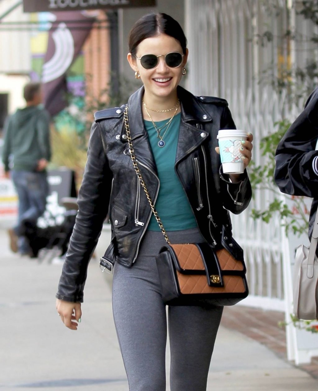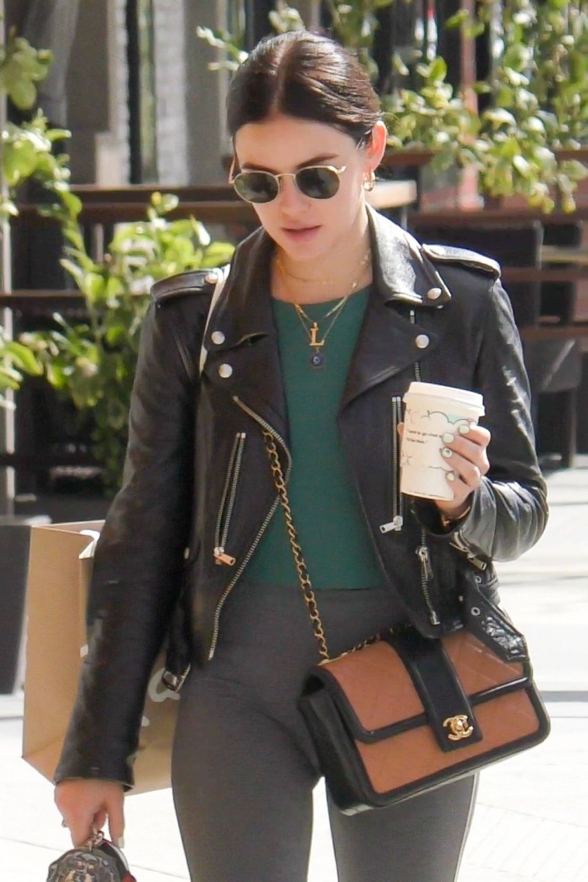 L’attrice Lucy Hale sfoggia una borsa Chanel, leggings aderenti e una giacca Moto in pelle da Alfred Coffee a Studio City, 05/04/2019. Questa cucitura è nel posto giusto!