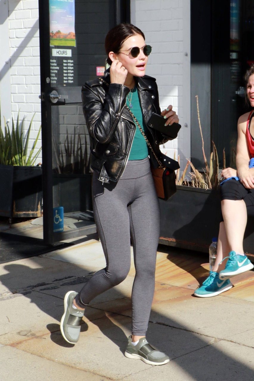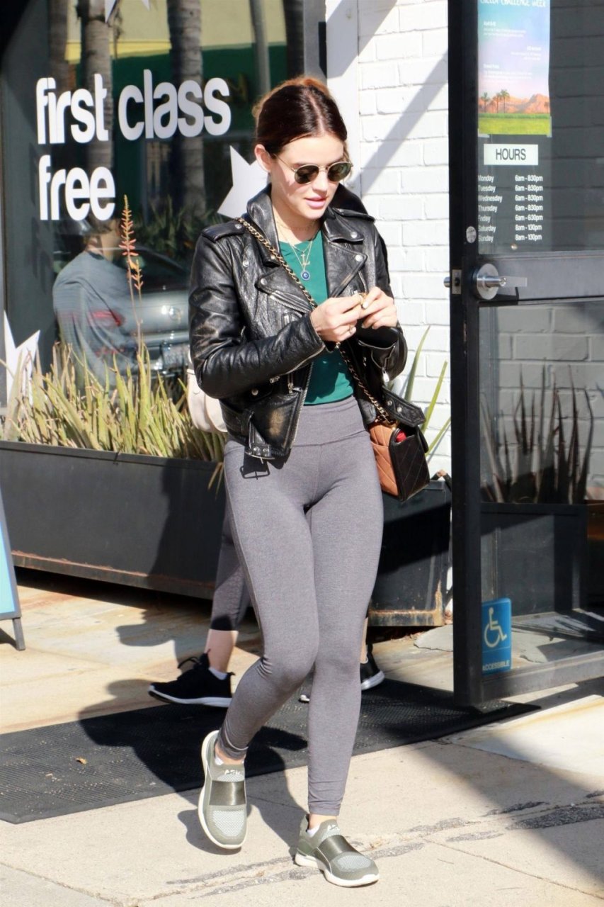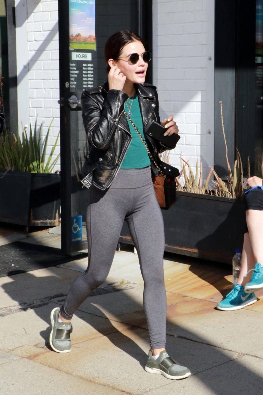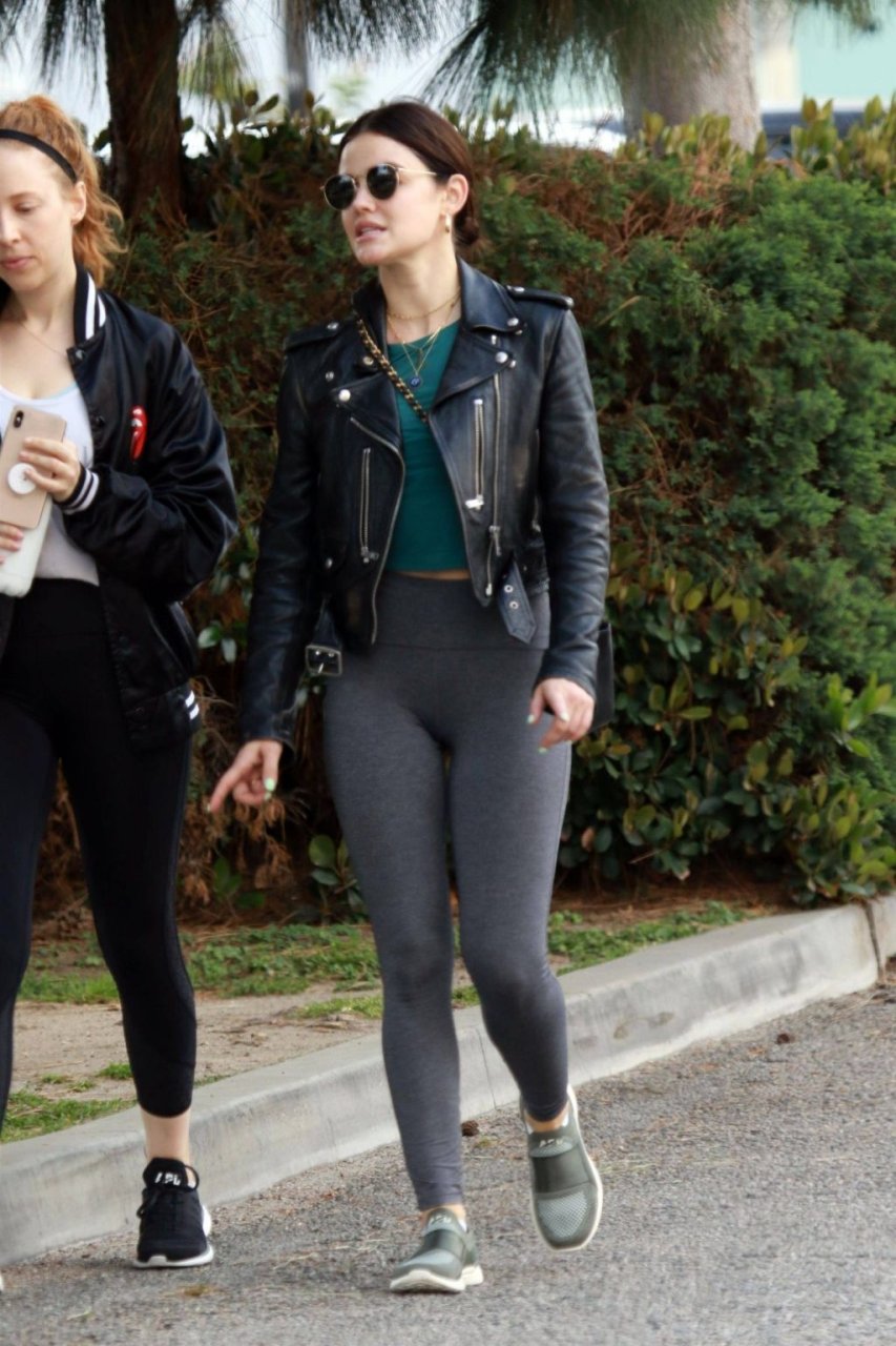 L’attrice Lucy Hale sfoggia una borsa Chanel, leggings aderenti e una giacca Moto in pelle da Alfred Coffee a Studio City, 05/04/2019. Questa cucitura è nel posto giusto!