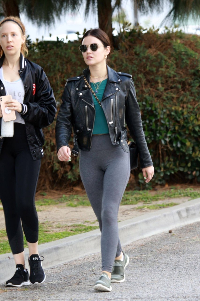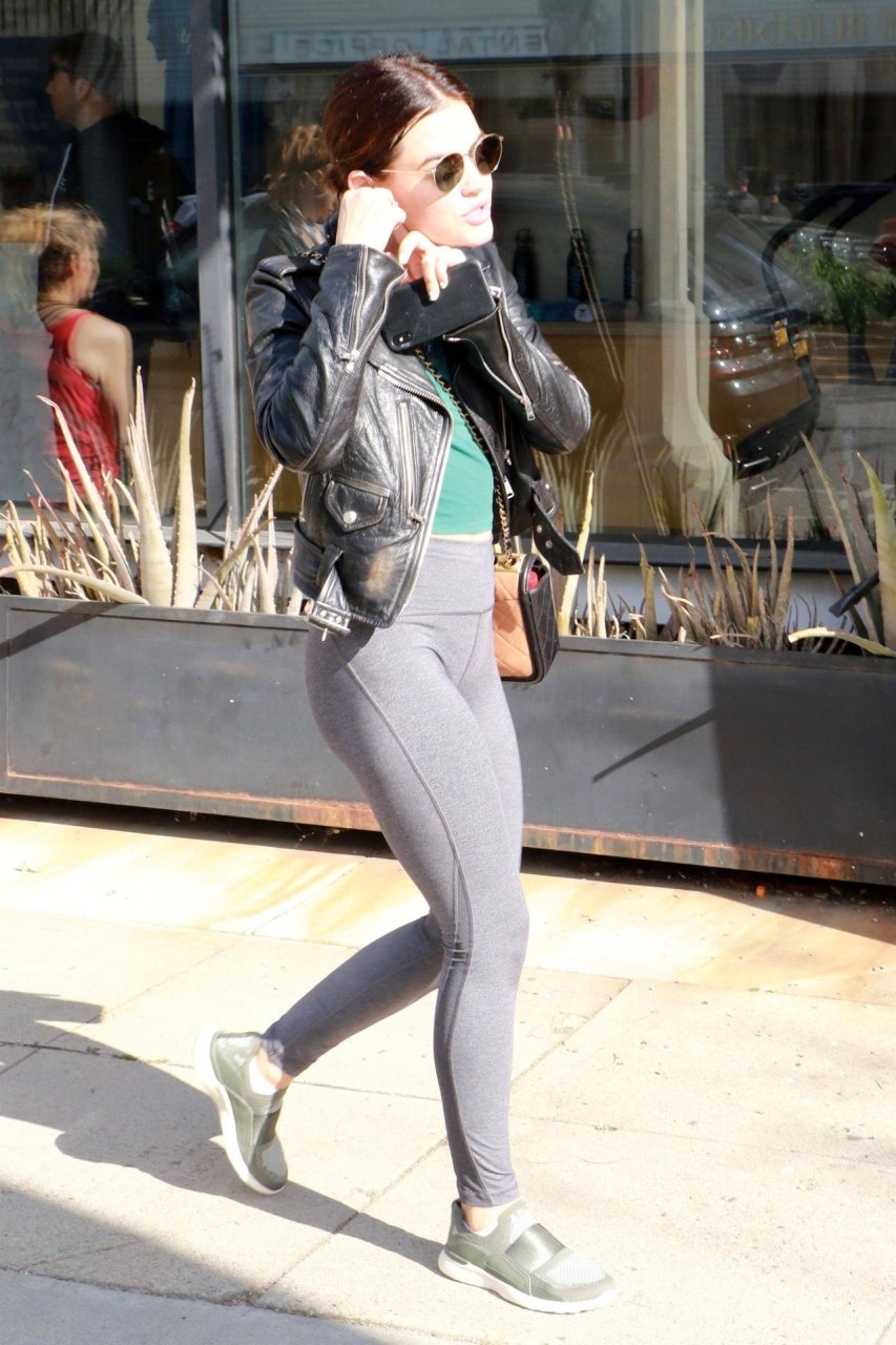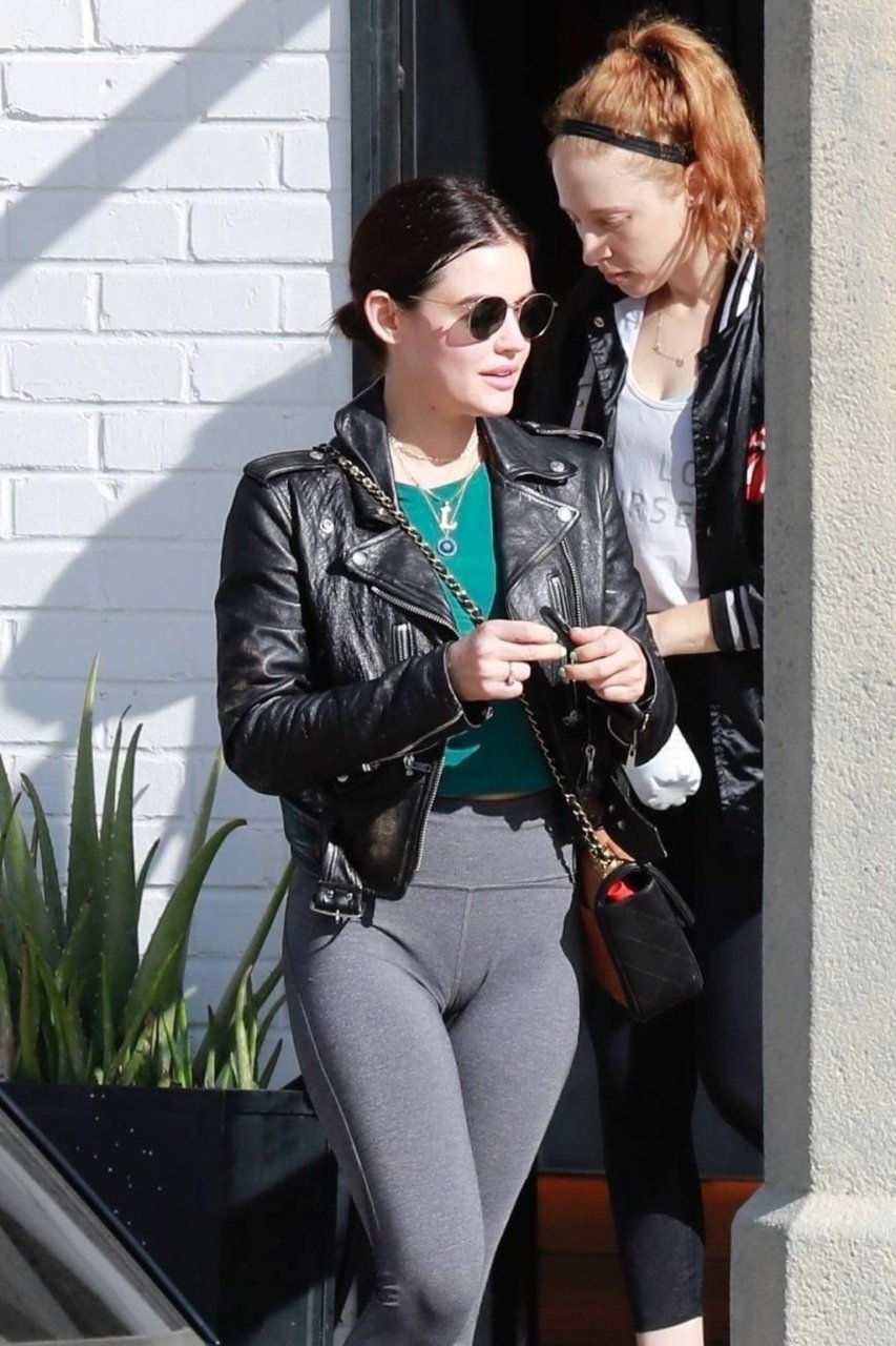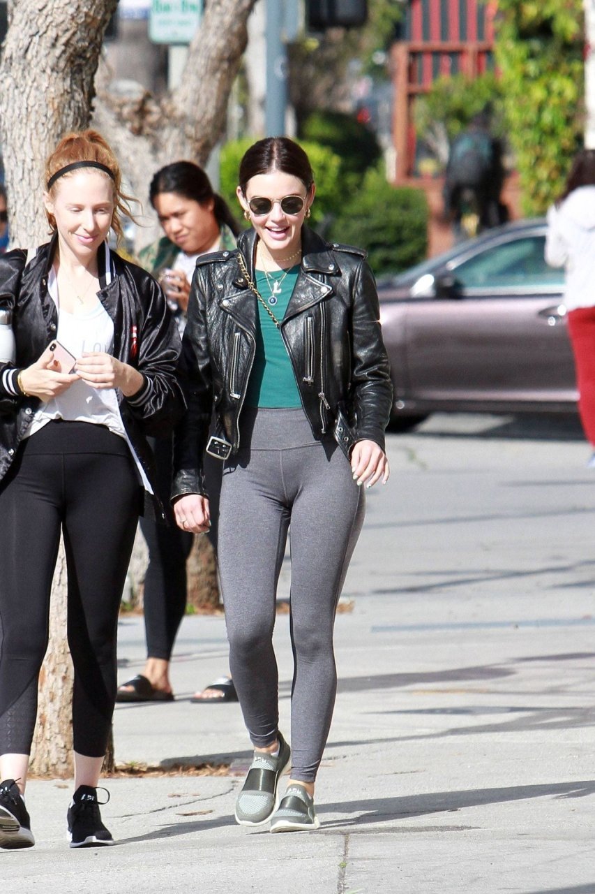L’attrice Lucy Hale sfoggia una borsa Chanel, leggings aderenti e una giacca Moto in pelle da Alfred Coffee a Studio City, 05/04/2019. Questa cucitura è nel posto giusto!