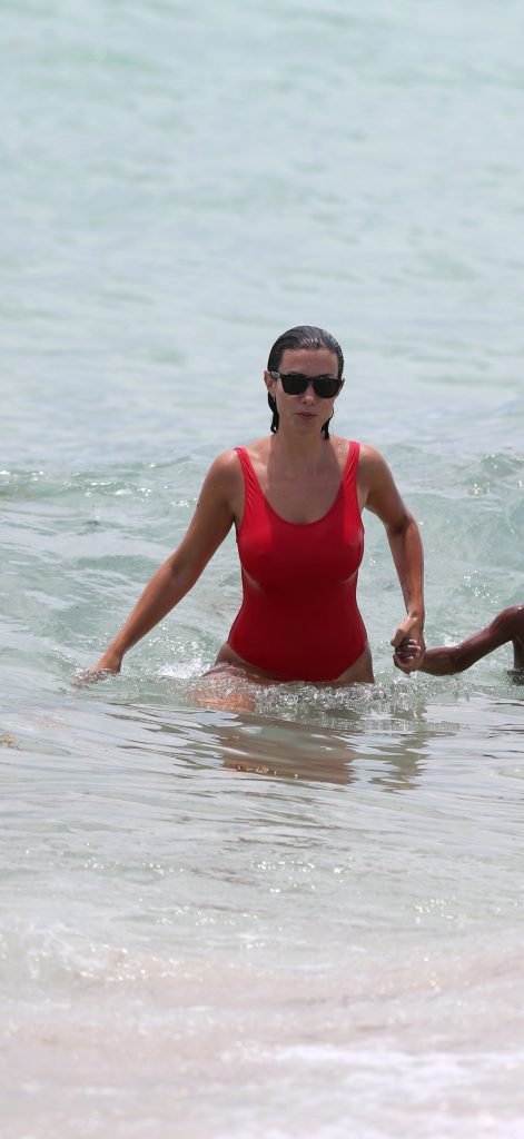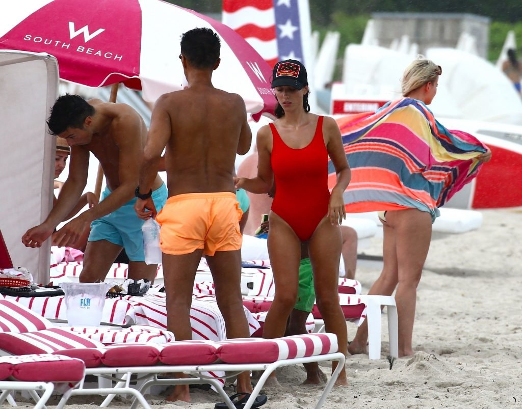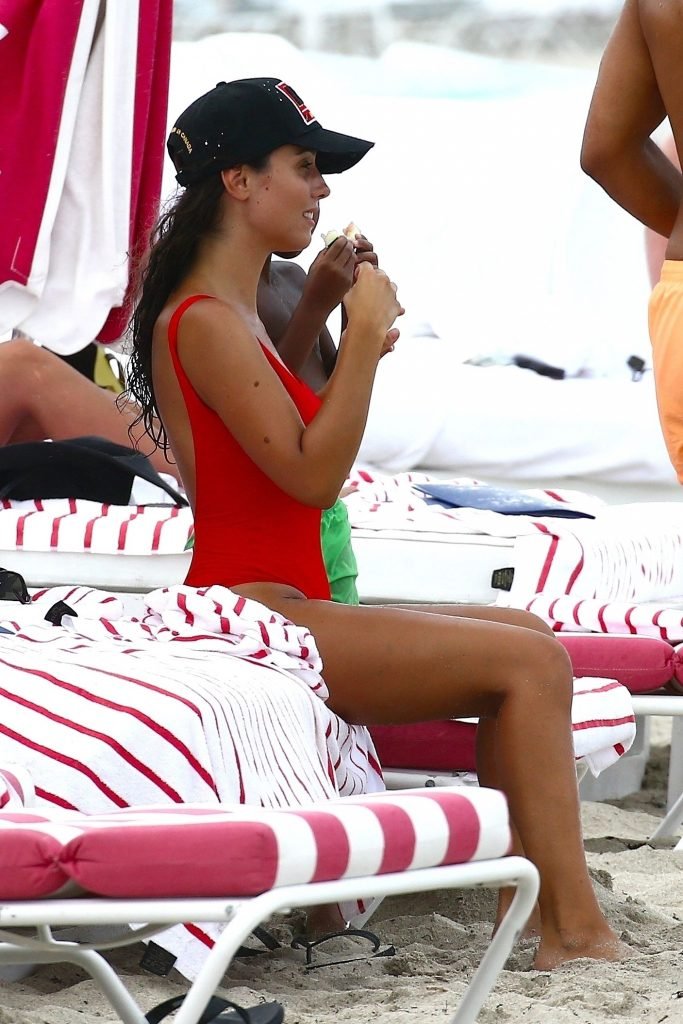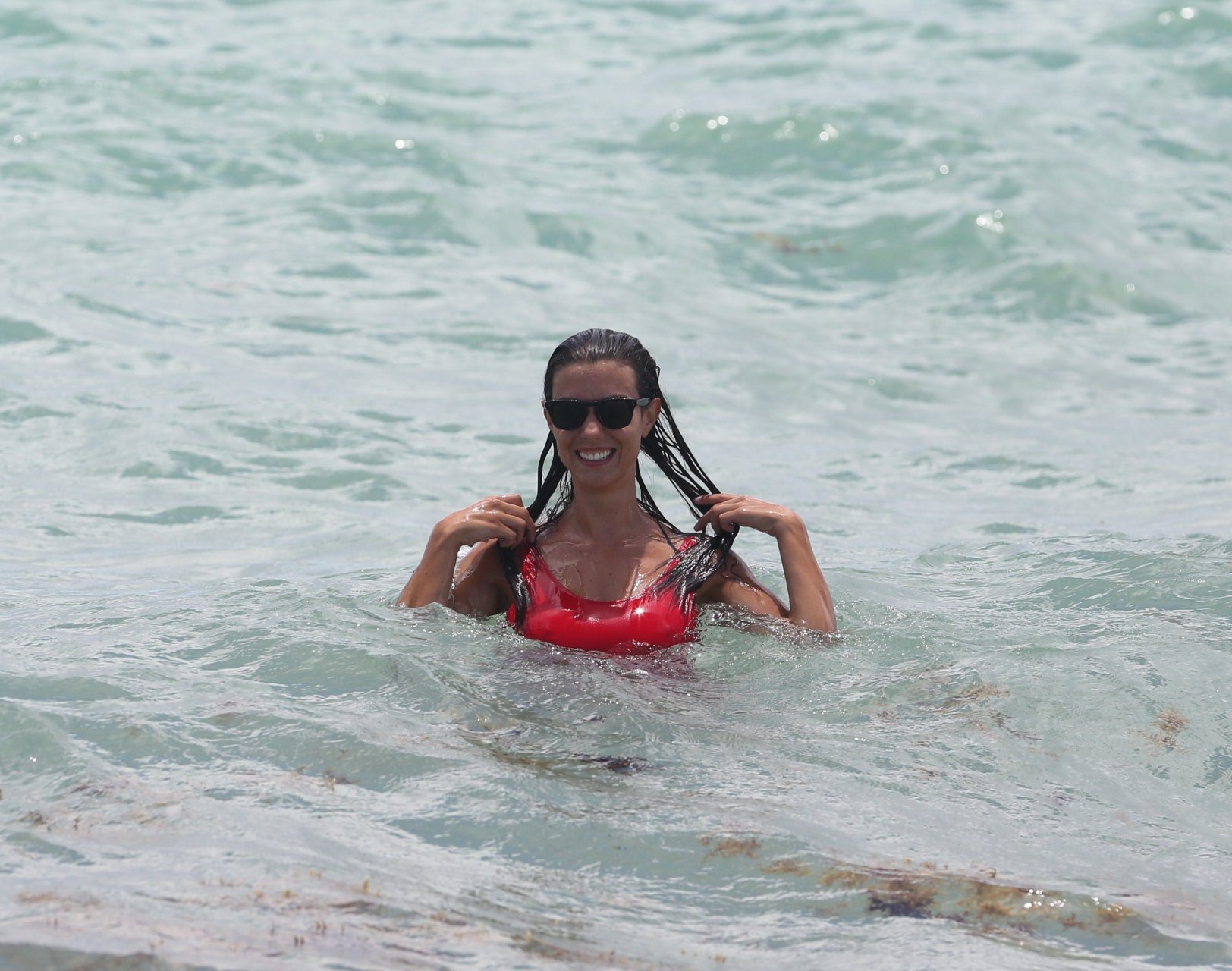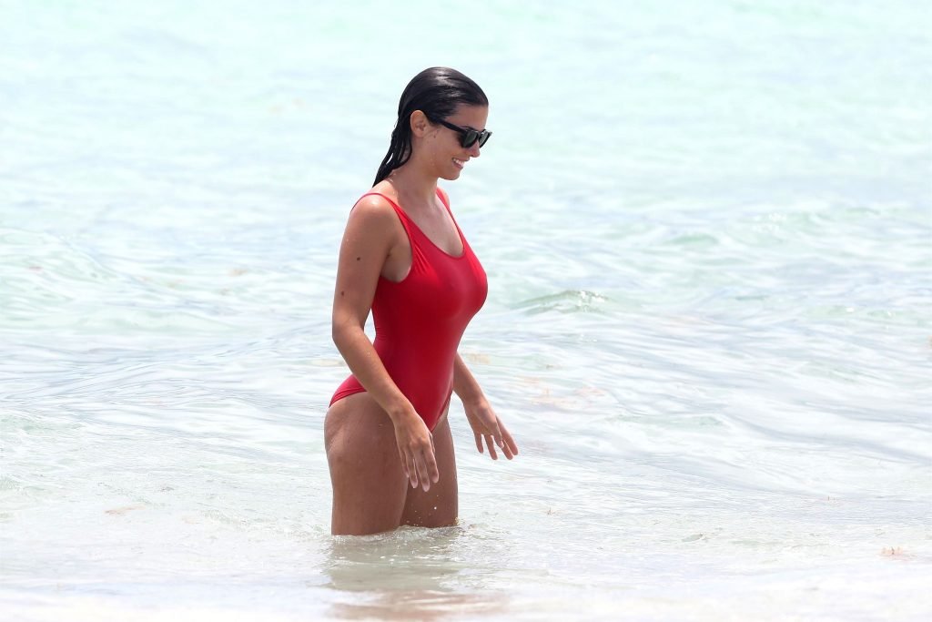 La modella e moglie di Bacary Sagna, Ludivine Kadri, si gode un po’ di tempo in spiaggia con un sexy costume intero rosso a Miami, 12/07/2017.