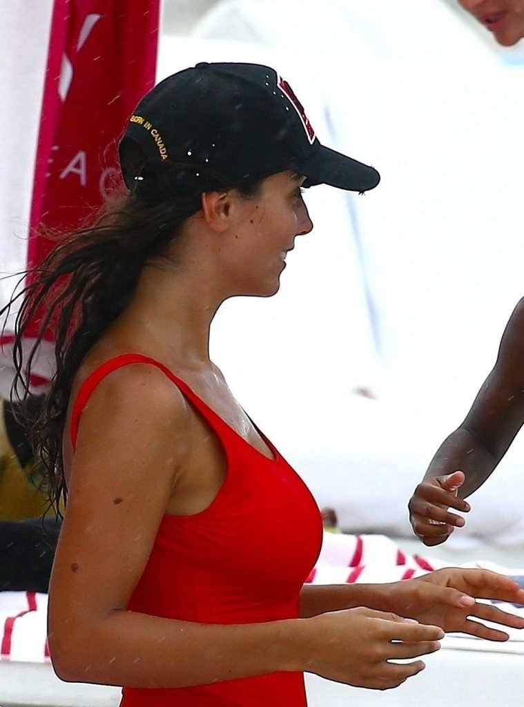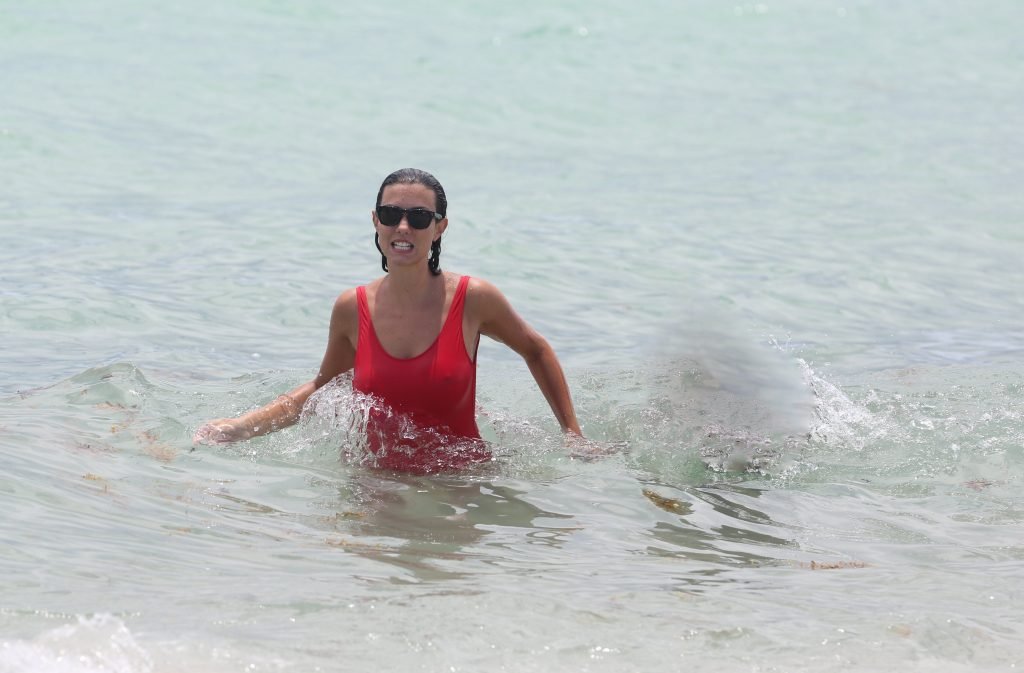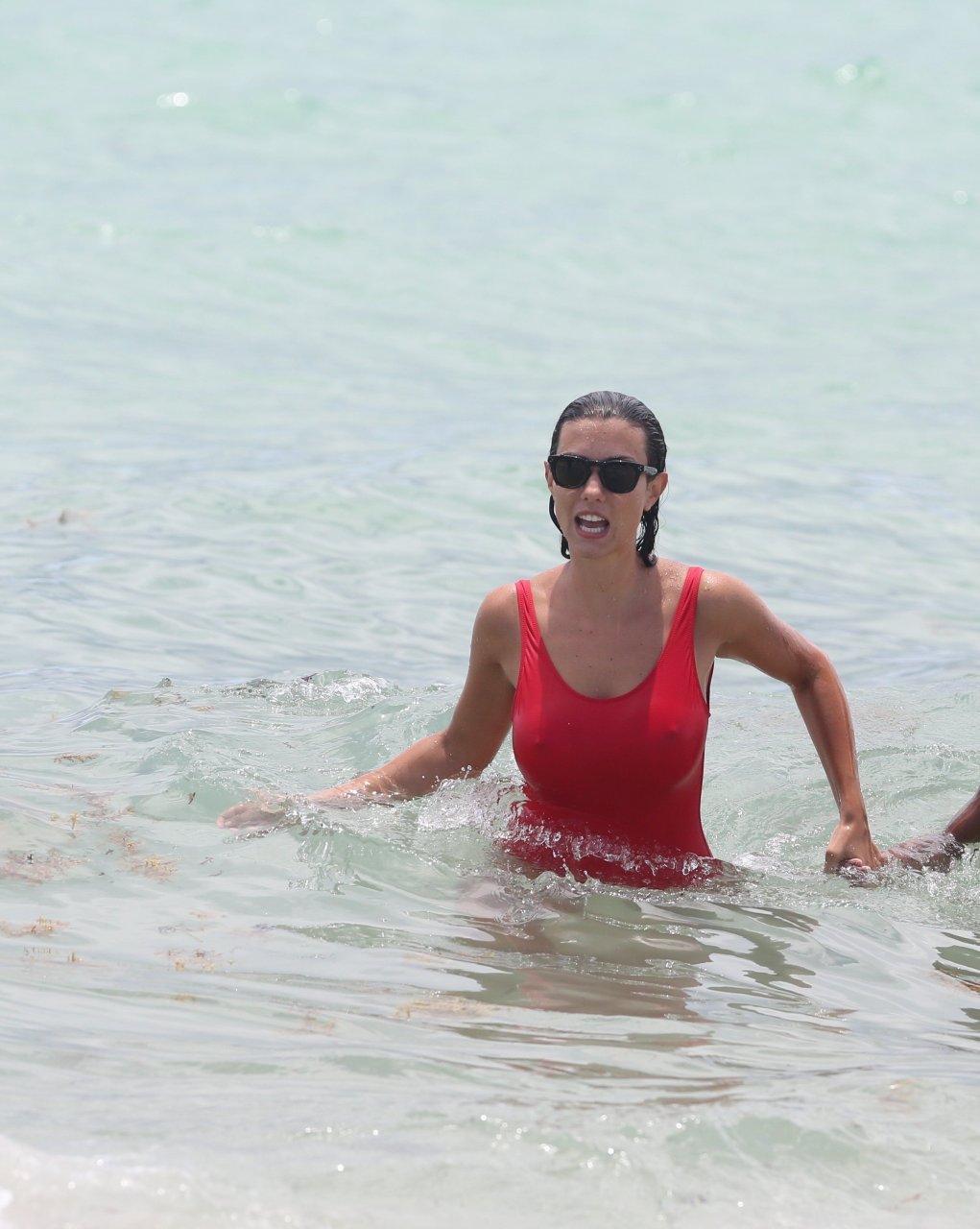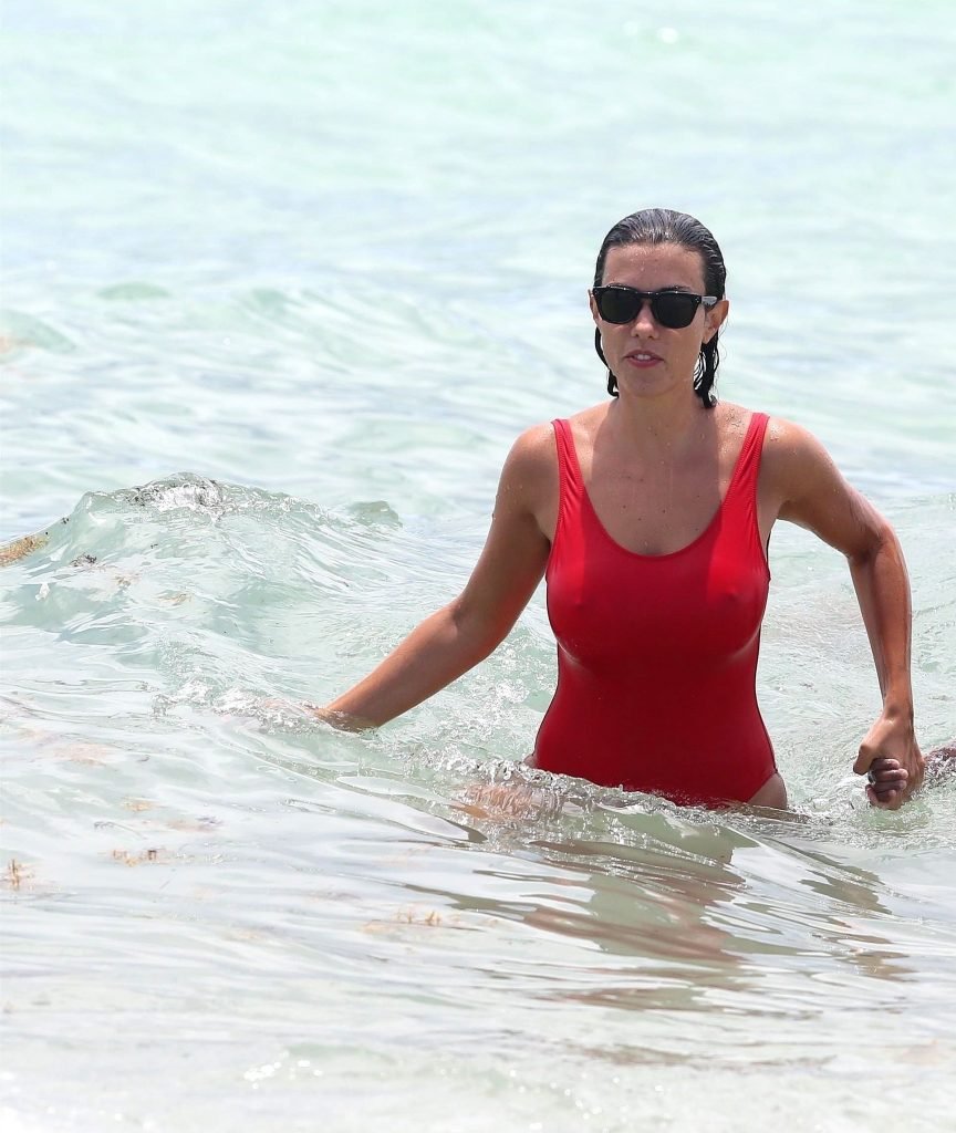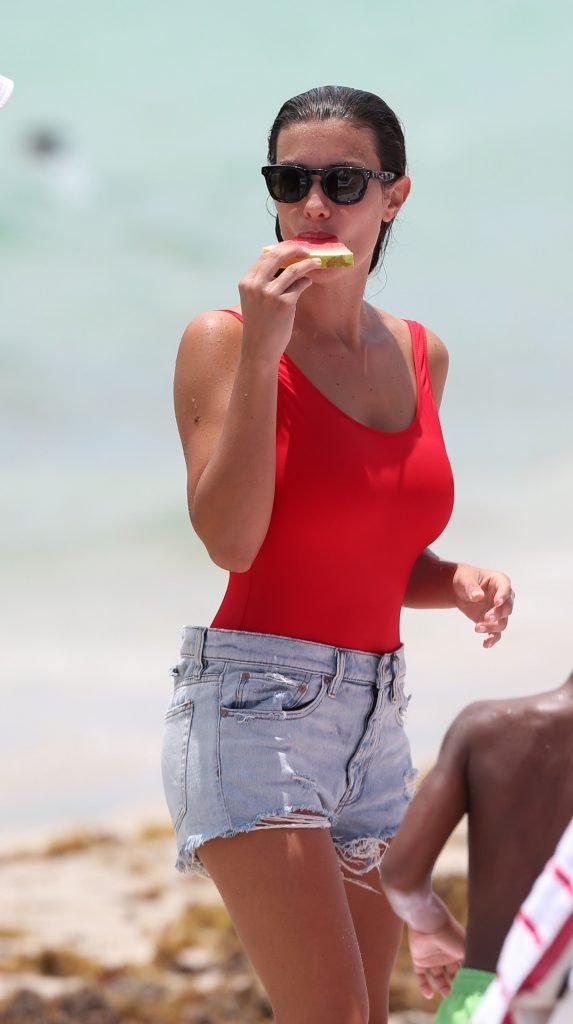 La modella e moglie di Bacary Sagna, Ludivine Kadri, si gode un po’ di tempo in spiaggia con un sexy costume intero rosso a Miami, 12/07/2017.