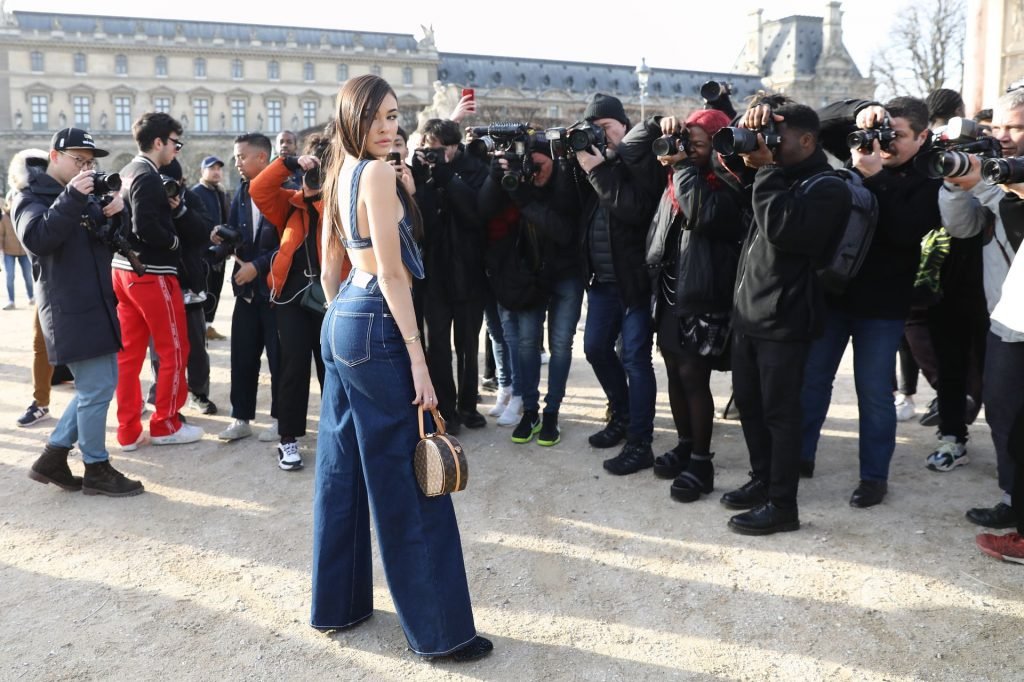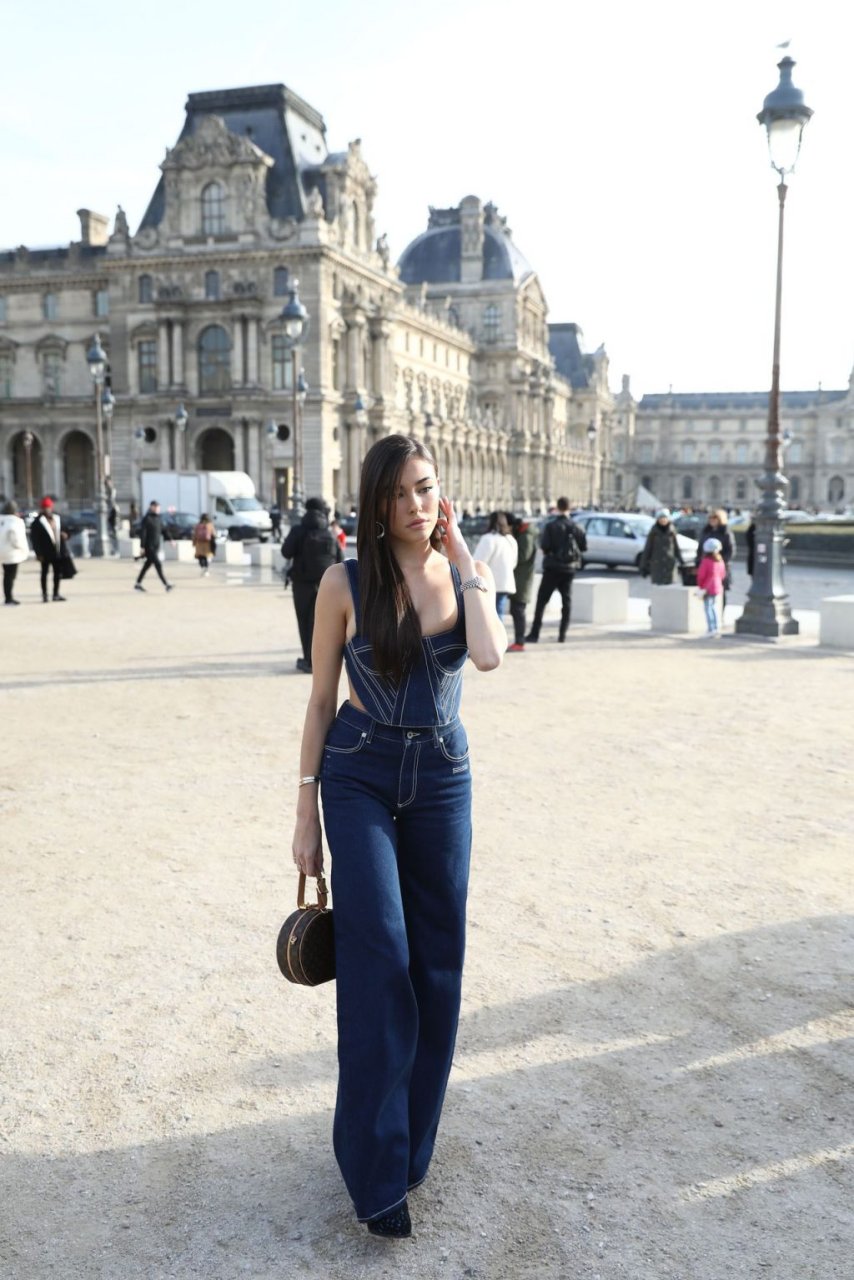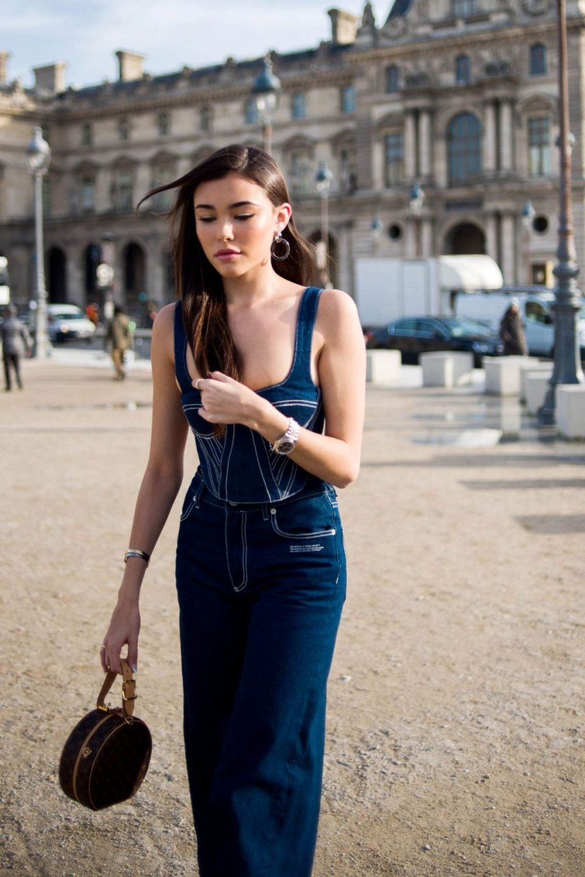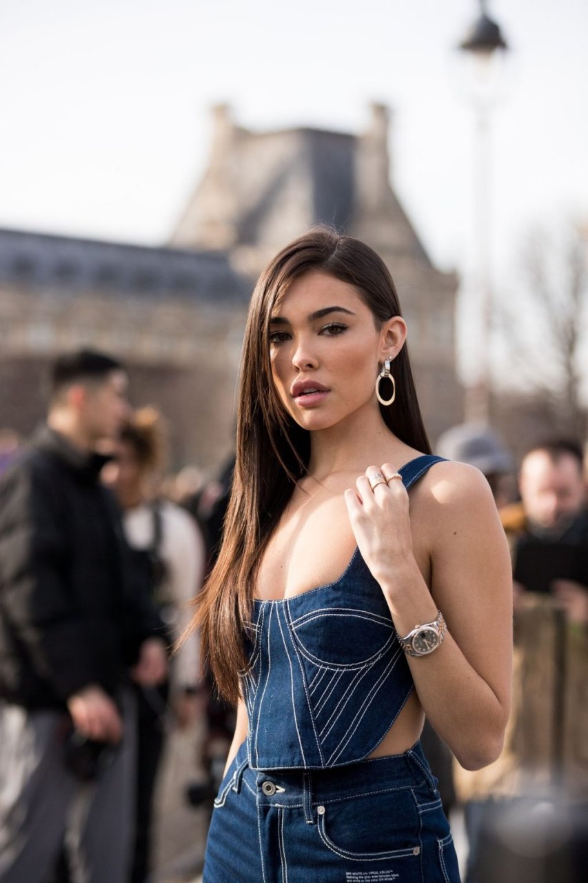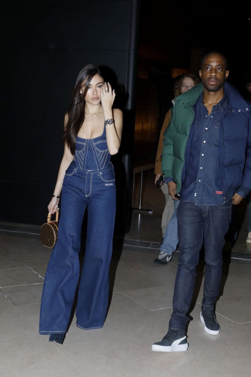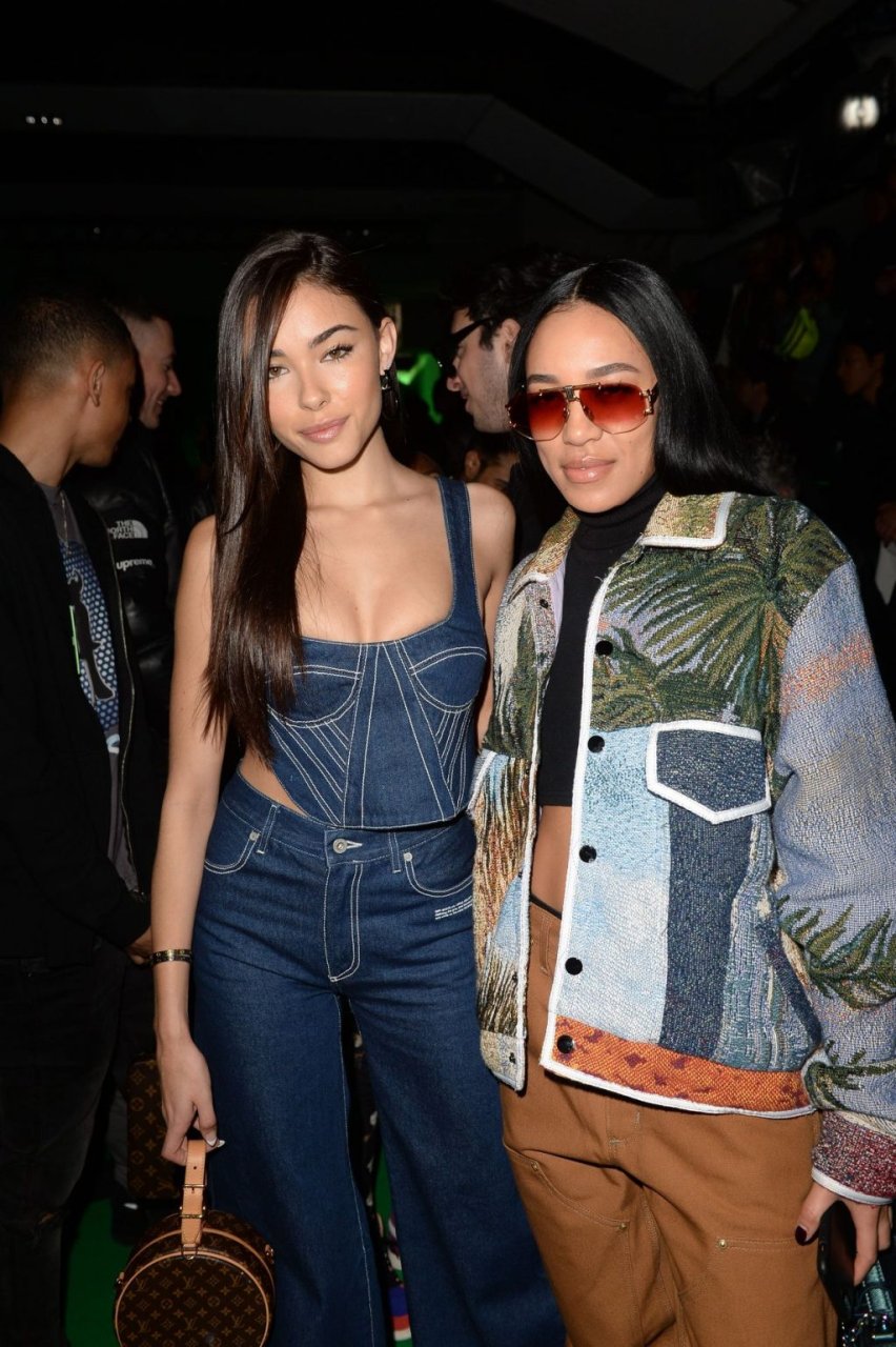 La cantante Madison Beer partecipa alla sfilata Off-White Menswear Autunno/Inverno 2019-2020 durante la Paris Fashion Week a Parigi, Francia, 16/01/2019. La giovane bellezza ha mostrato il suo décolleté indossando un outfit in denim.
