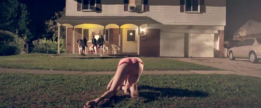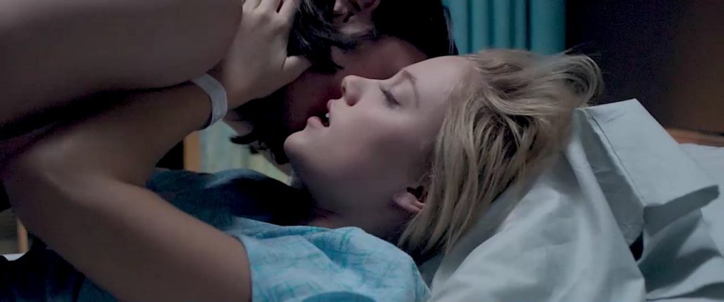 Maika Monroe is pulling a dress off while walking across a patch of grass toward a pool of water. We see her underwear first, and then see her bare butt as she steps naked into the water. We then see a guy following after her and joining her in the pool, Maika showing cleavage as she makes out with him.