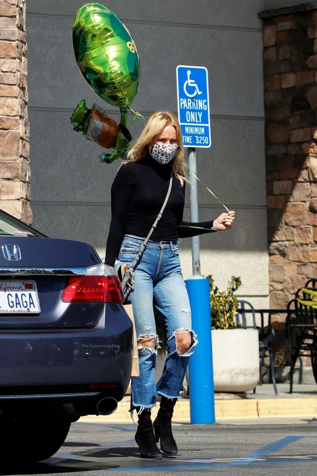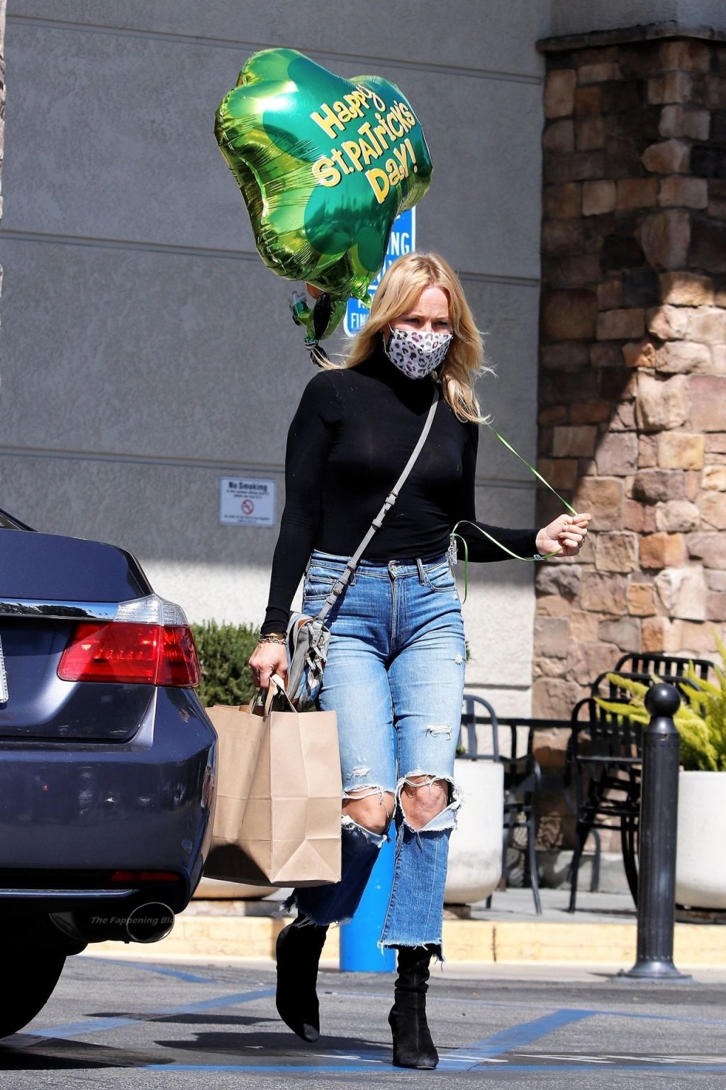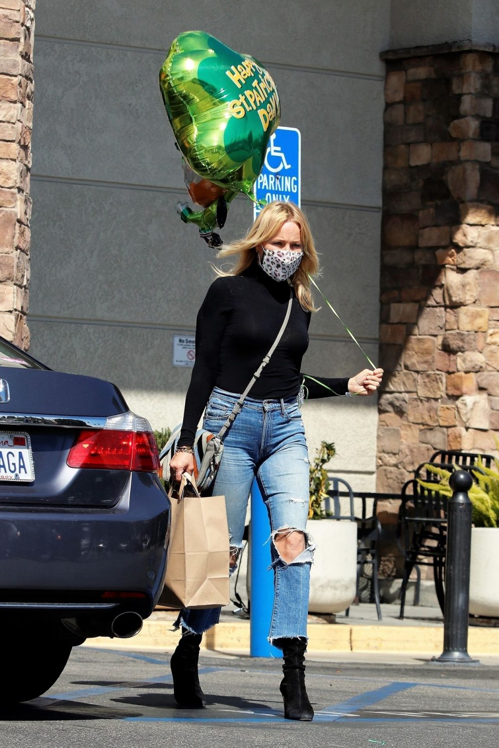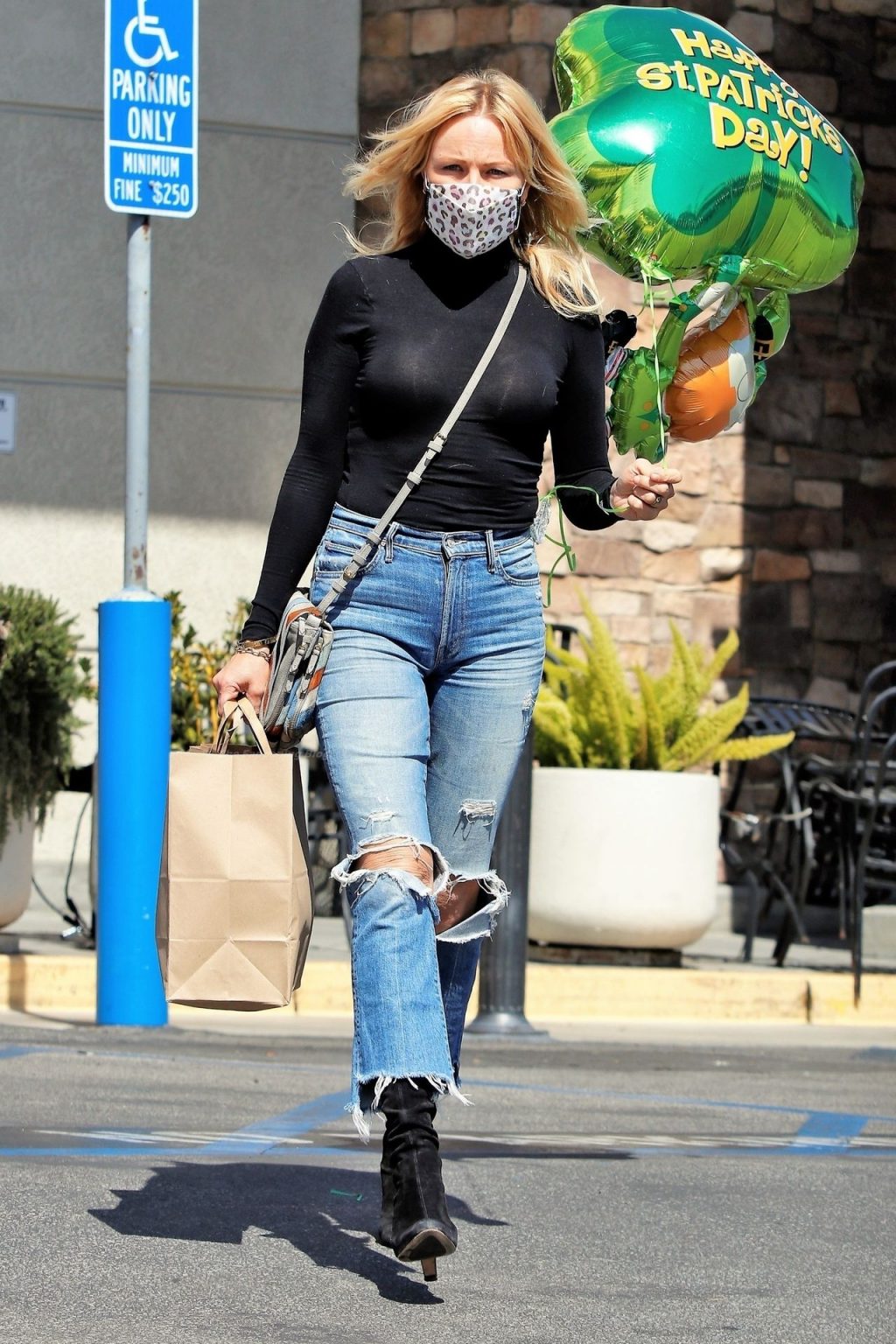 Malin Akerman esce da un mercato di Los Angeles con grandi palloncini verdi in celebrazione della Festa di San Patrizio, 17/03/2021.